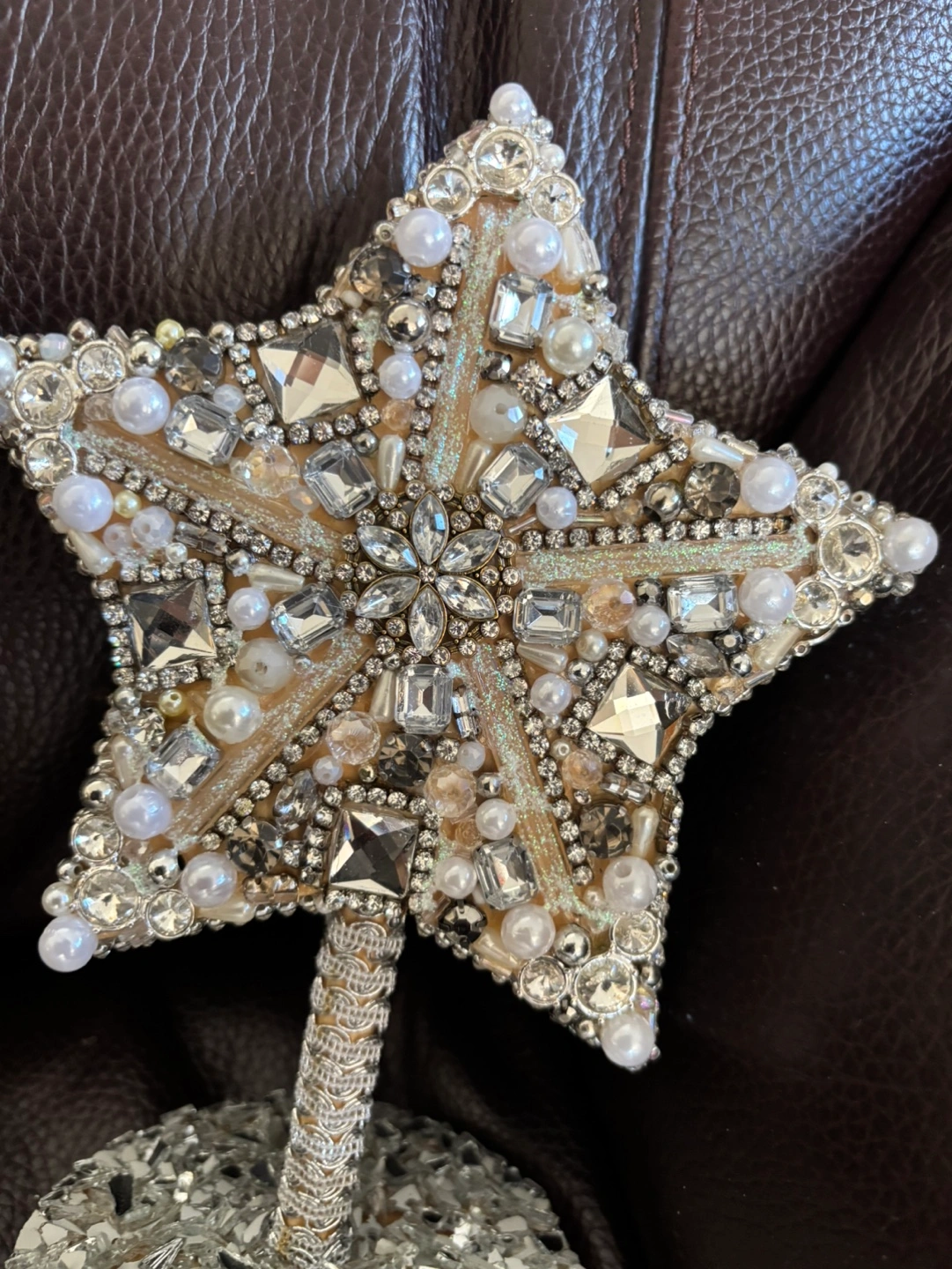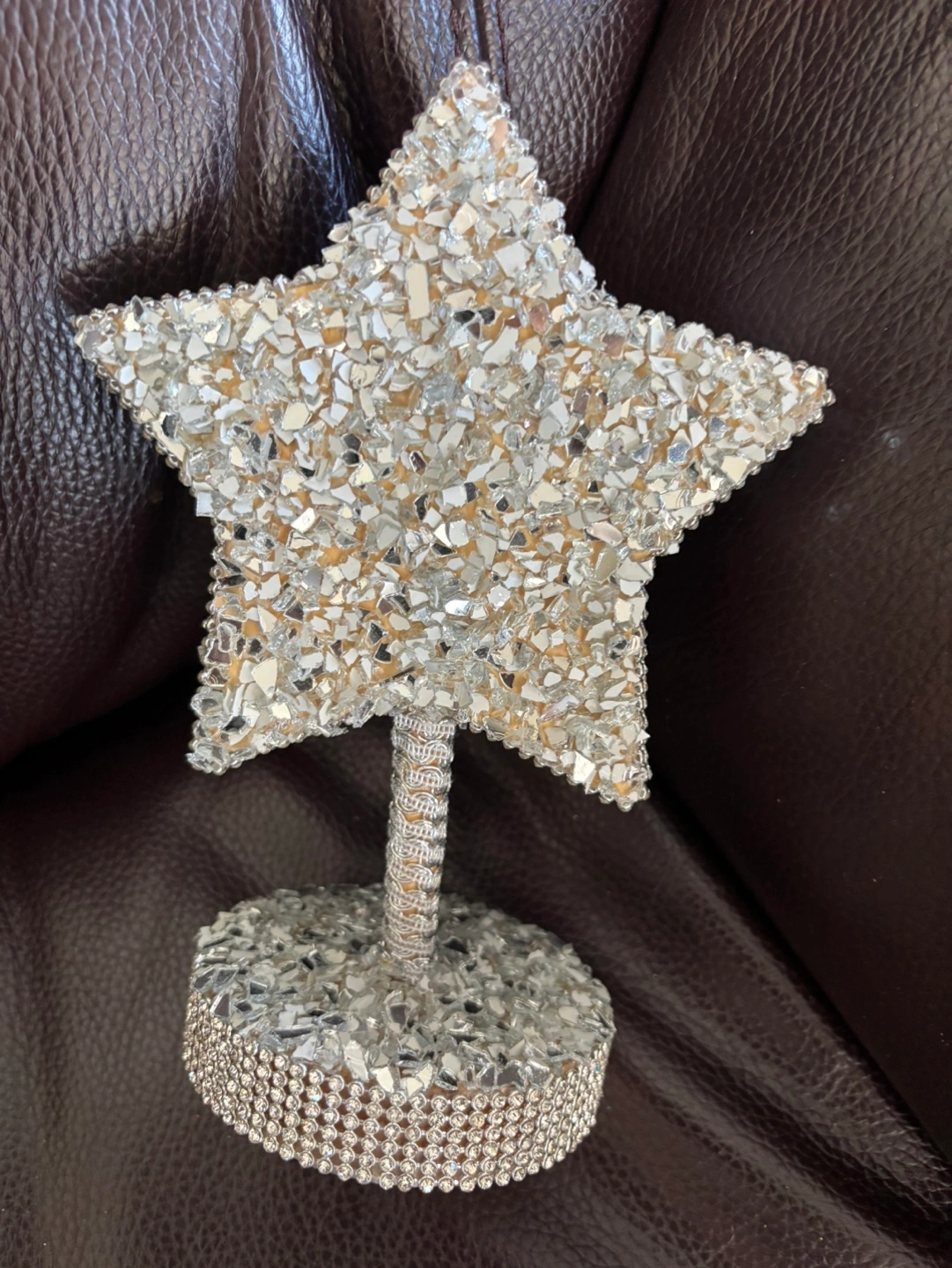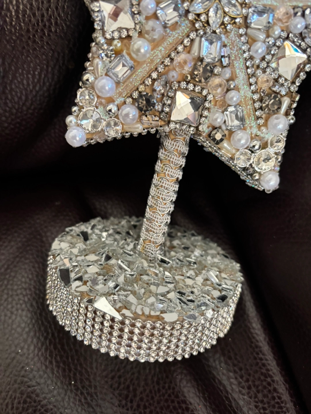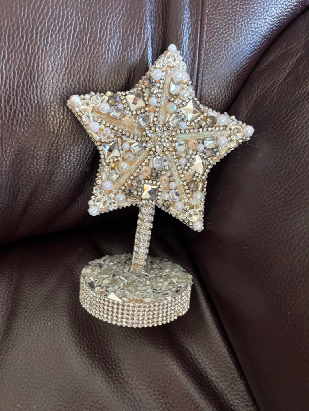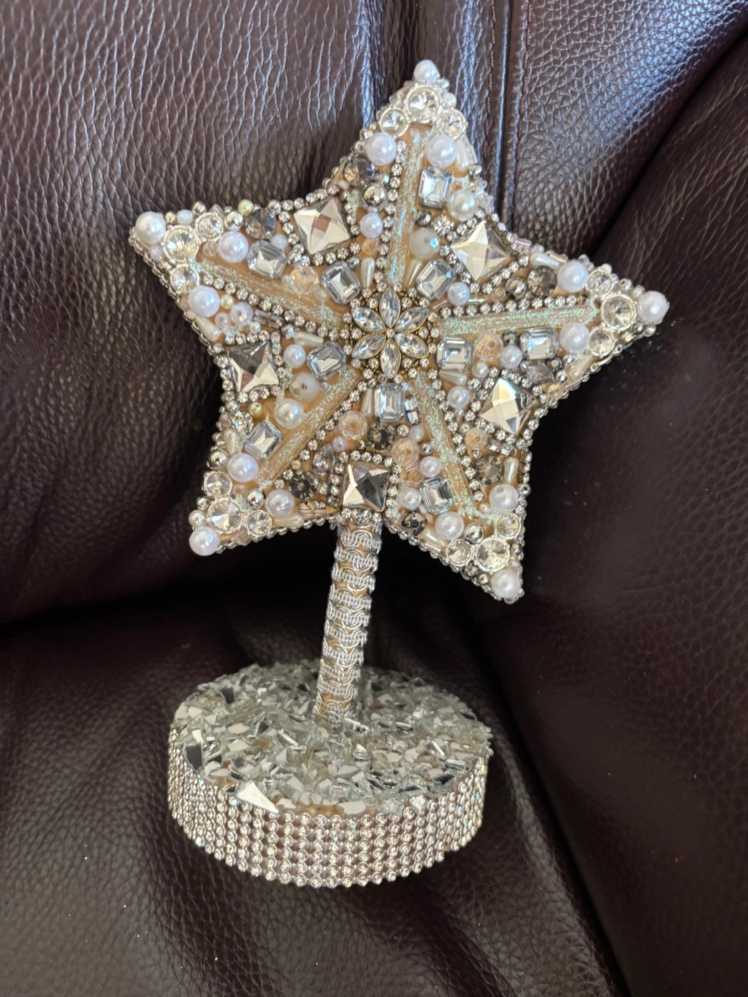 Beautiful star ornament, covered in rhinestones, pearls, and glass pieces. The star is mounted on a circular base. Perfect for any occasion. 8” tall x 4” base Pickup in Mississauga