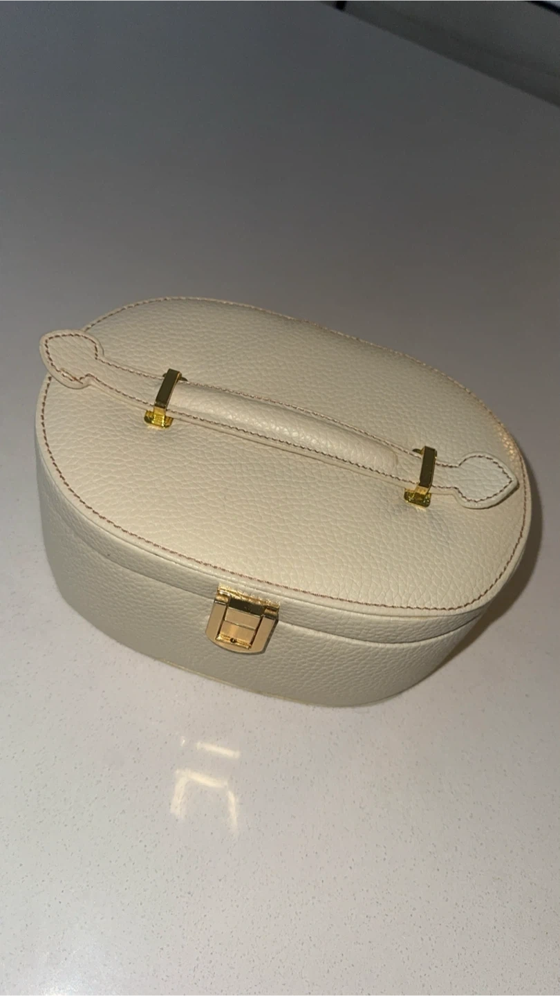Selling a cream-coloured jewellery box. It's in good condition and has a mirror inside. Perfect for keeping your jewellery organized!