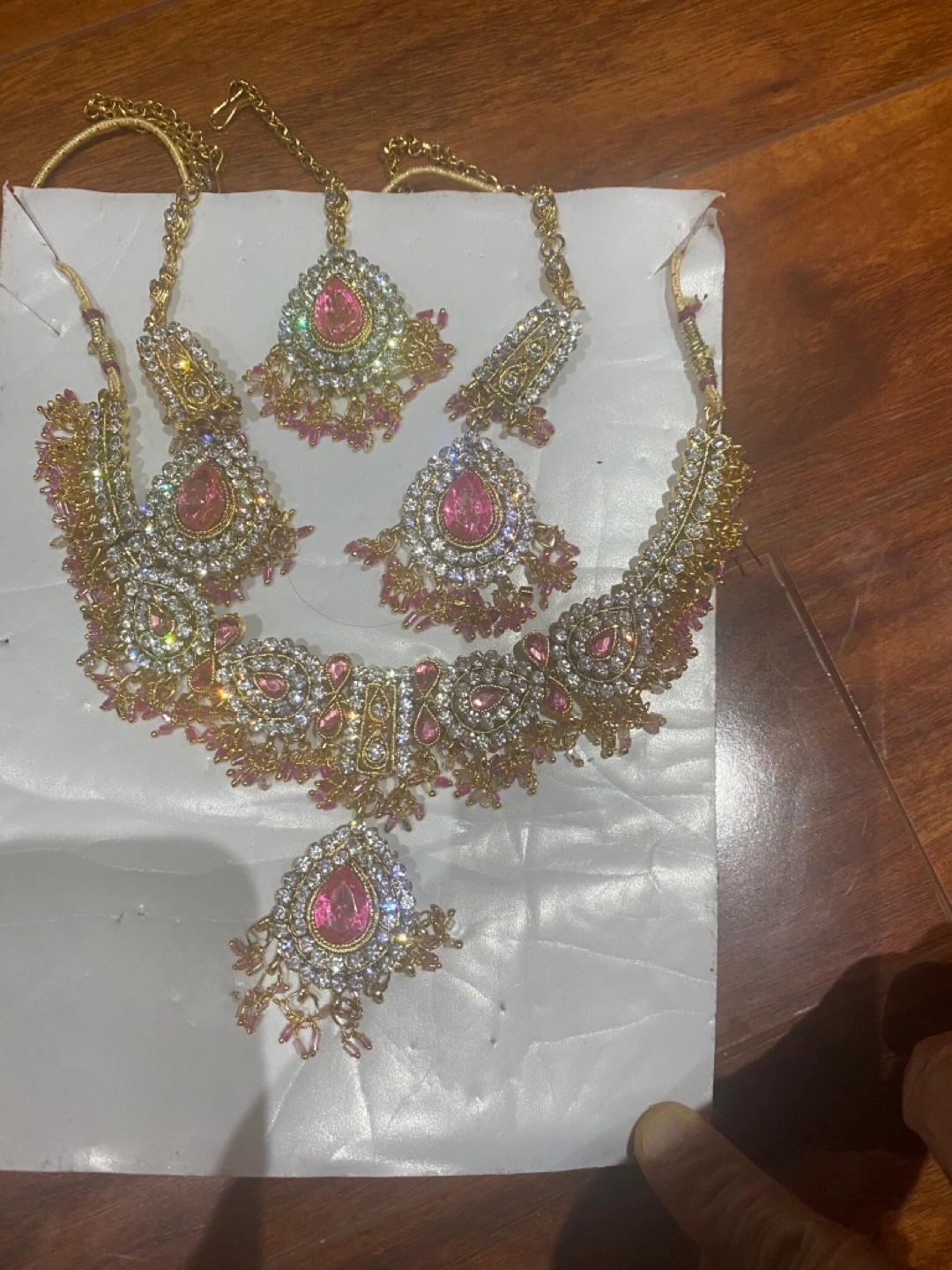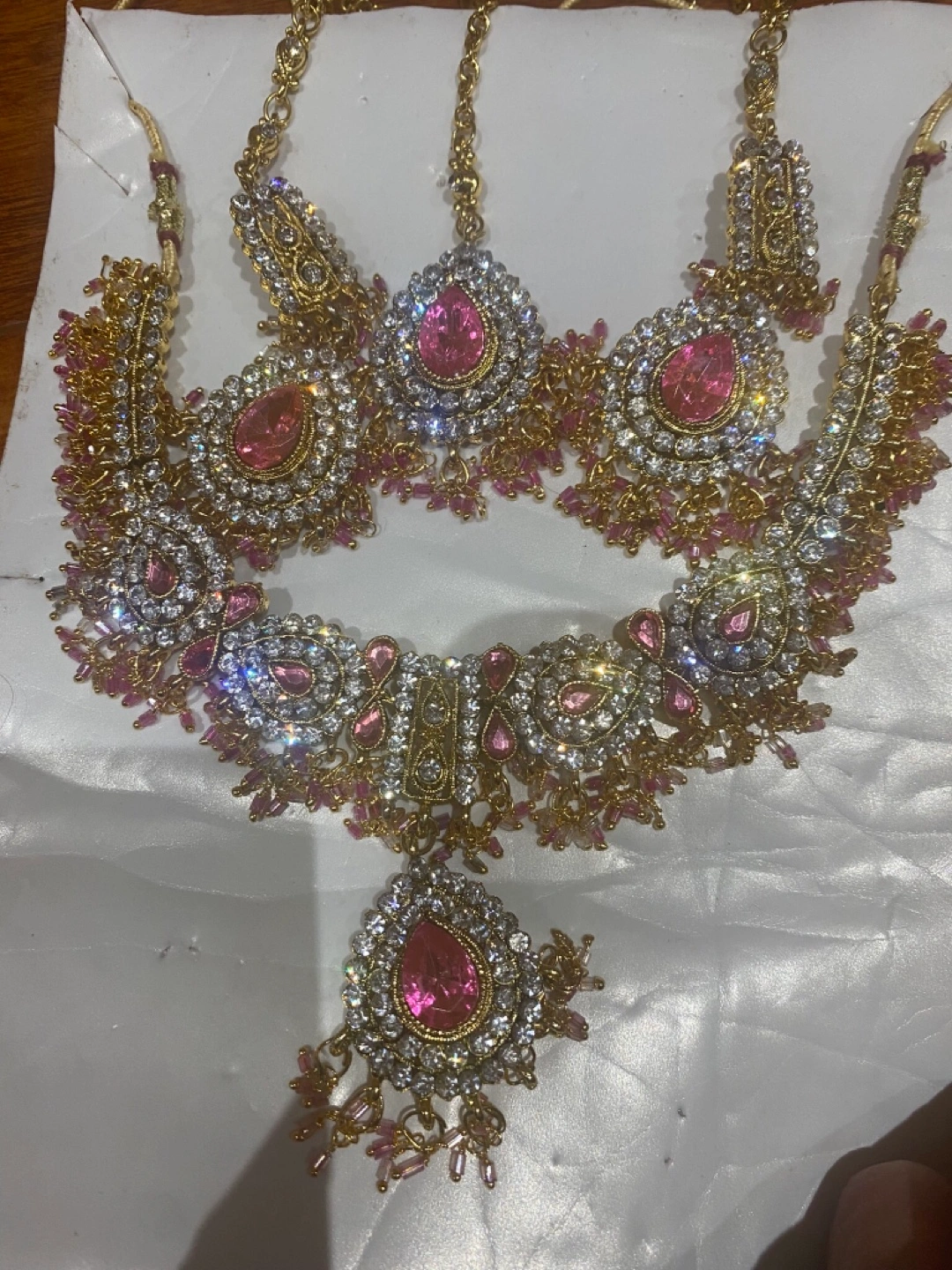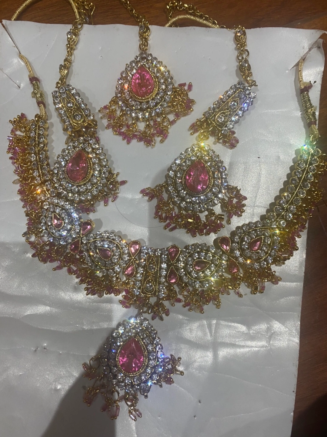 Beautiful jewellery set with a necklace, earrings, and tikka. The set features intricate gold detailing with pink and clear stones. Perfect for special occasions!