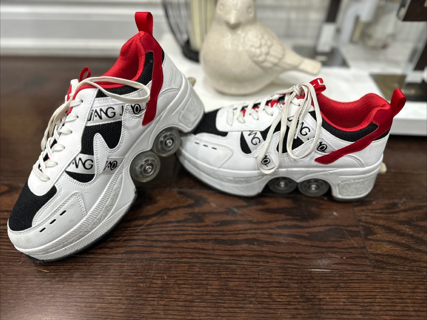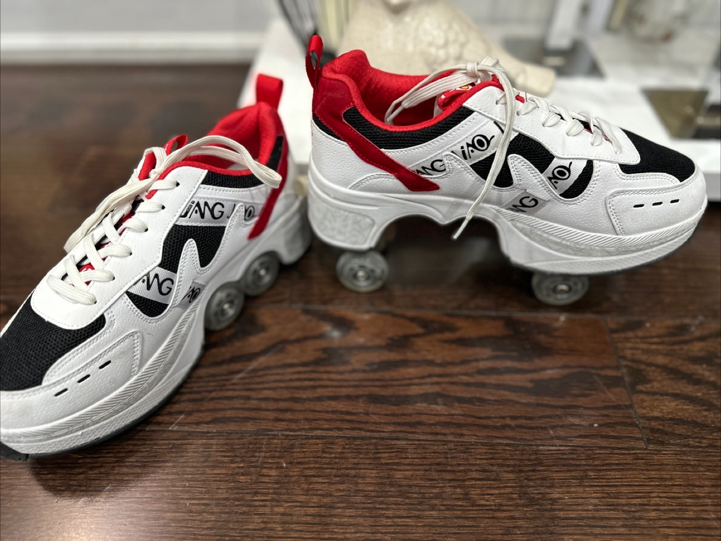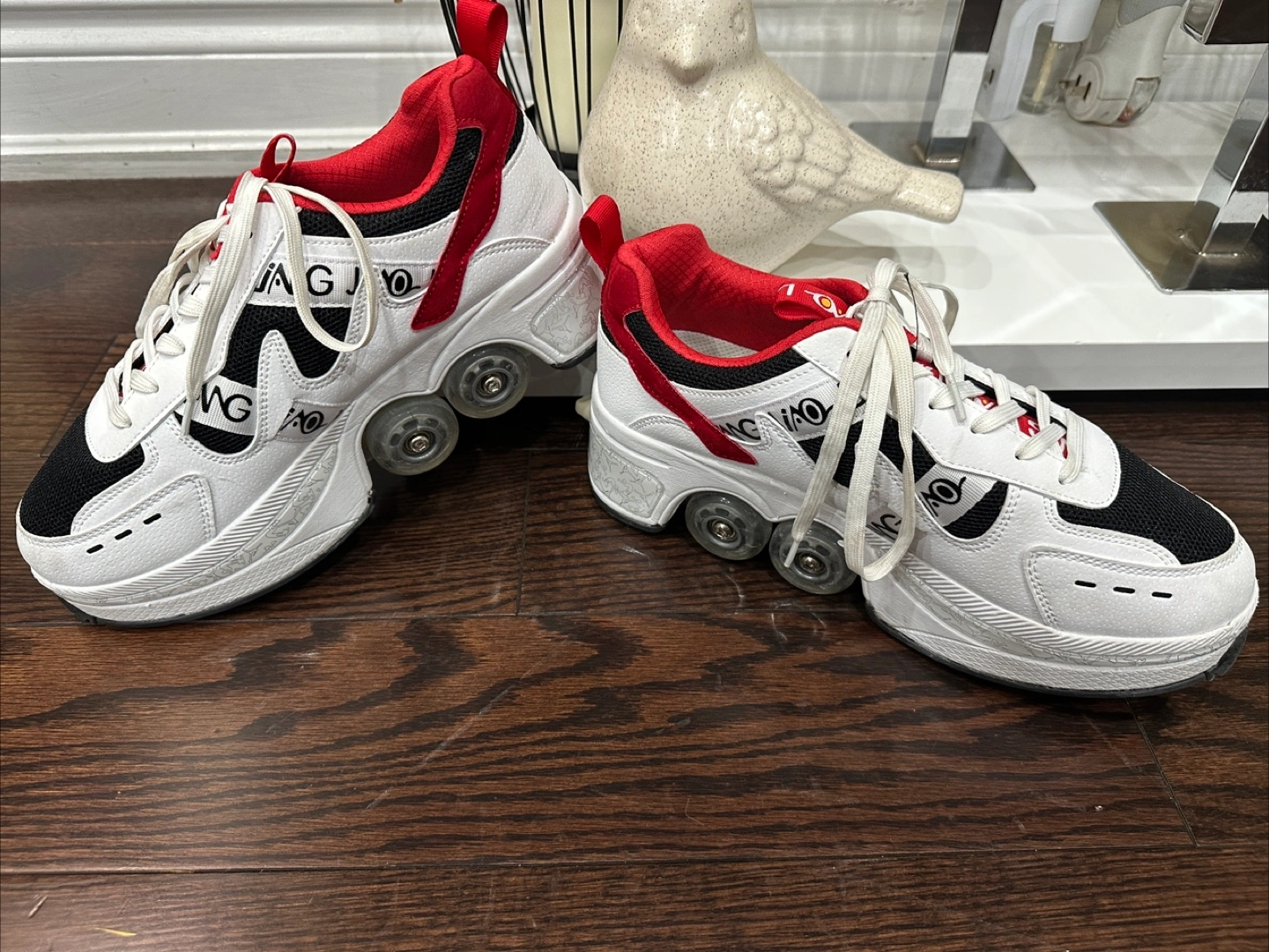 These Jiang Gao roller skate shoes are in great condition! They're a size 9 and feature a unique design with built-in wheels. Perfect for adding some fun to your workouts or just cruising around.