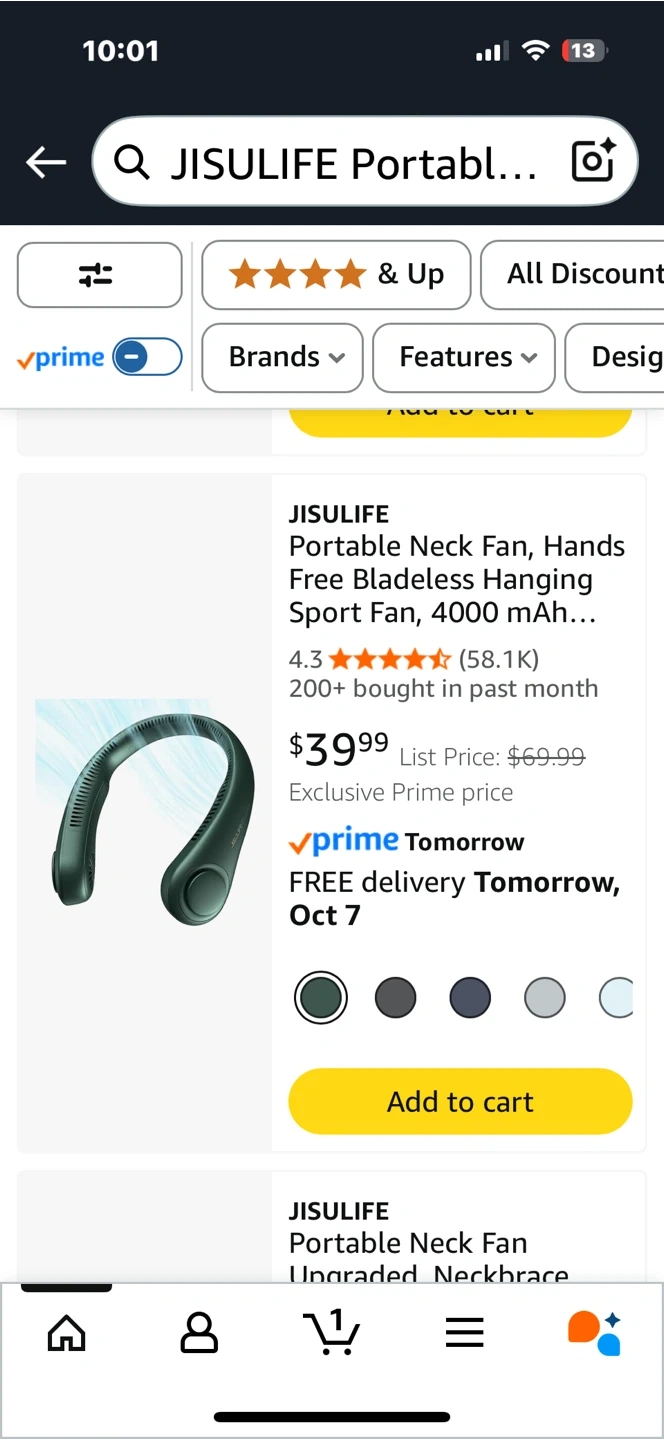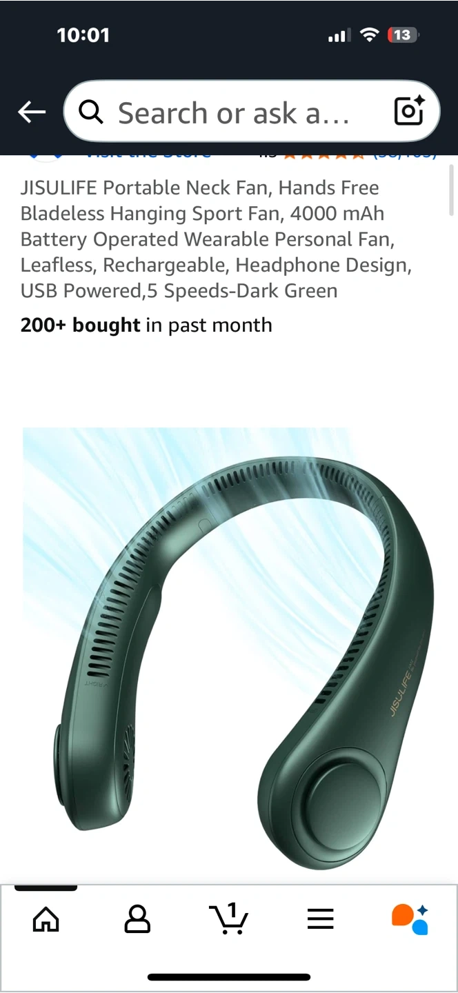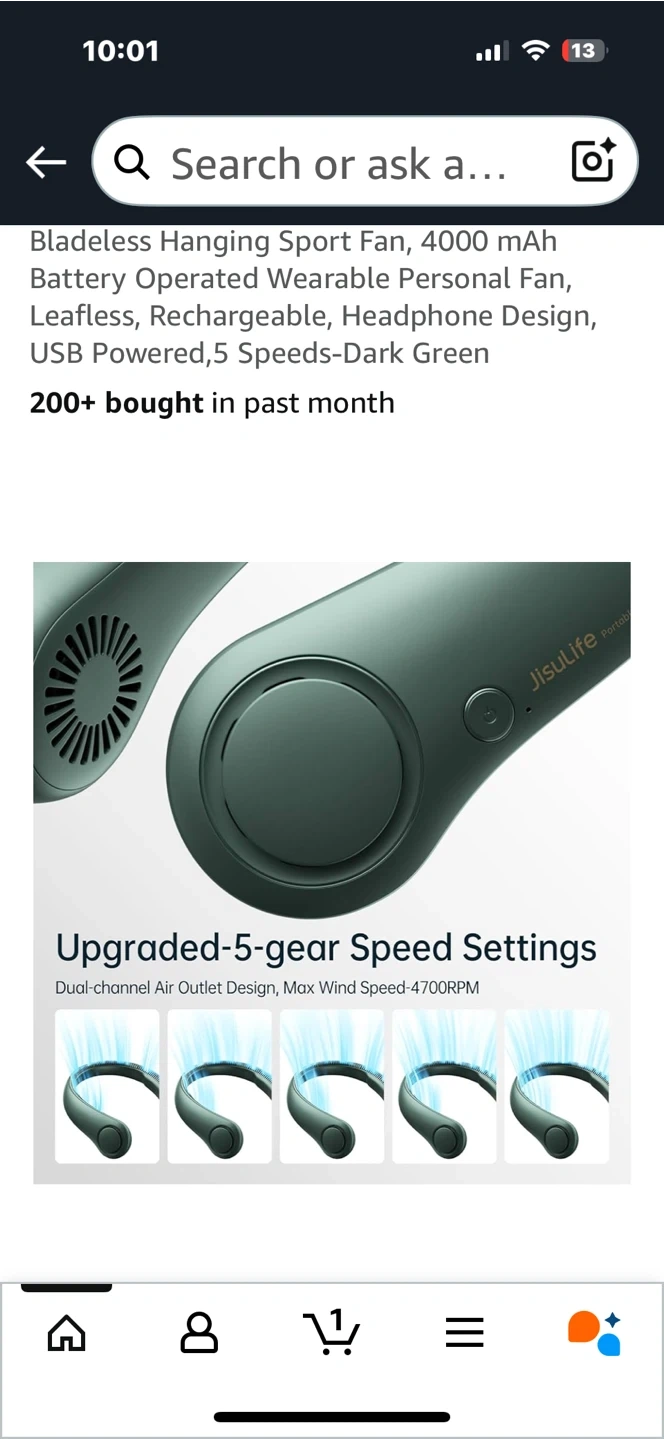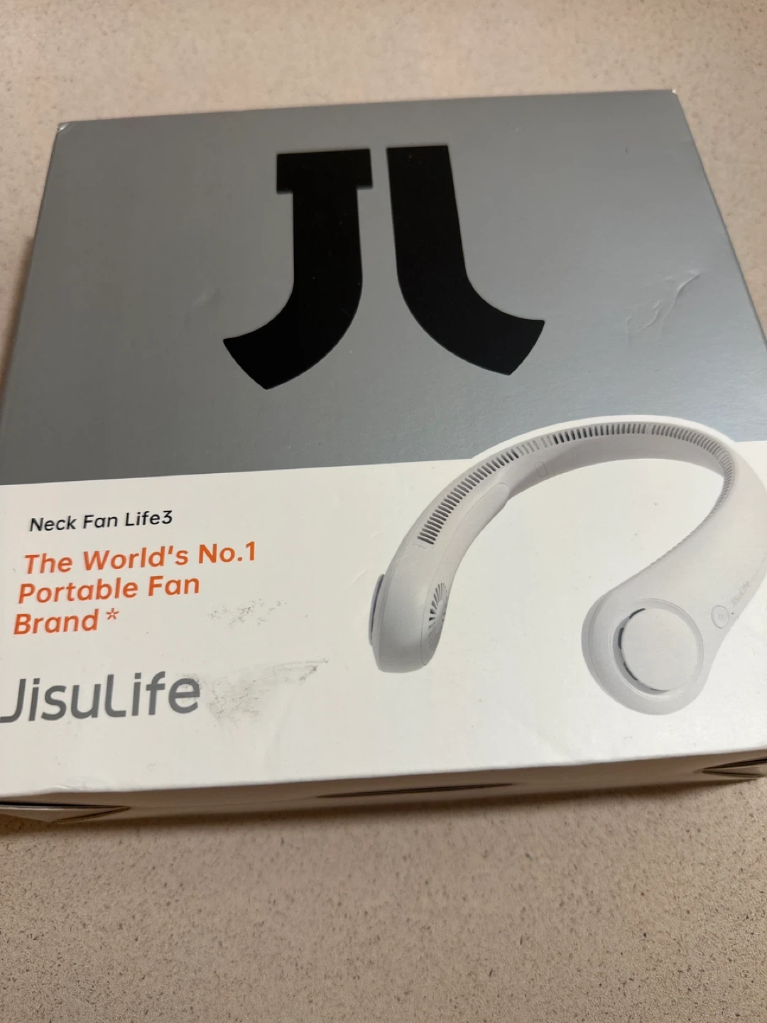 Stay cool on the go with this JISULIFE Neck Fan Life3! It's portable and hands-free, perfect for sports or just staying comfortable. - Bladeless design - 4000 mAh battery - Upgraded 5-gear speed settings - Dual-channel air outlet design - Max wind speed 4700RPM Open box