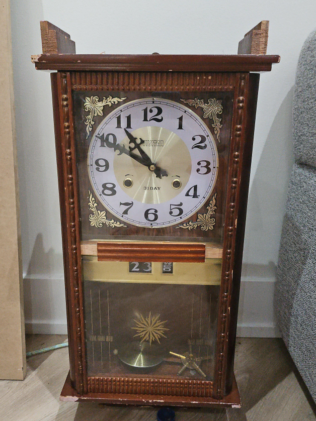 Selling a vivitar 31DAY pendulum wall clock. It has a classic design with a brown wooden frame and a glass front. The clock face features elegant gold accents and easy-to-read numerals. The pendulum swings smoothly, adding a touch of vintage charm to any room. There are some major signs of wear on the wood, but overall it's in good working condition as far as I can tell. it winds up and chimes