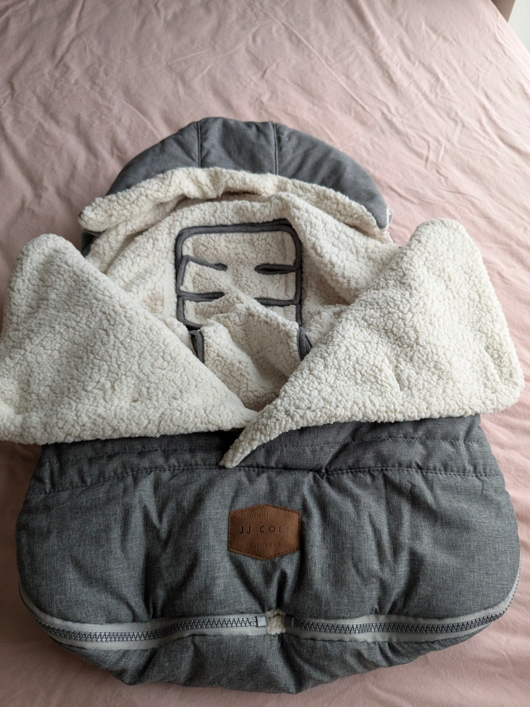 Keep your little one cozy with this JJ Cole car seat cover! It's in great condition and perfect for keeping baby warm during those chilly Canadian months. The soft, plush lining is super comfy, and the grey colour is versatile and stylish