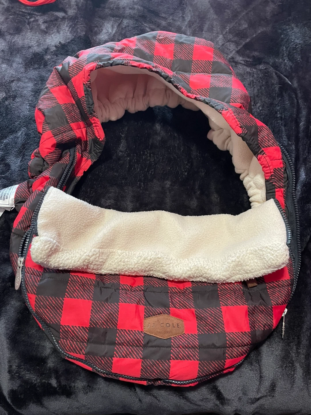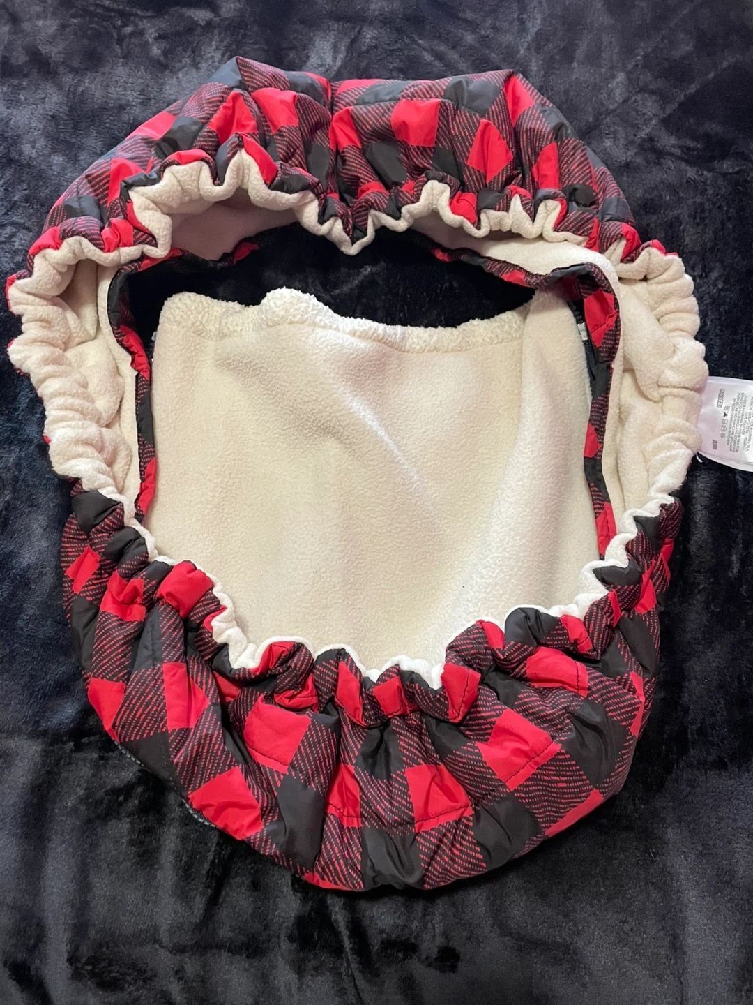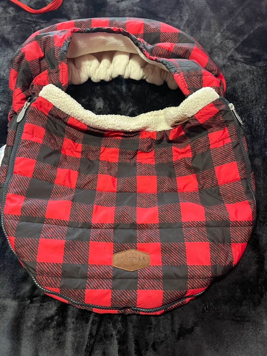 Keep your little one warm and cozy with this JJ Cole car seat cover! It features a stylish red and black plaid design with a soft, plush interior. Perfect for protecting your baby from the elements during those chilly Canadian months