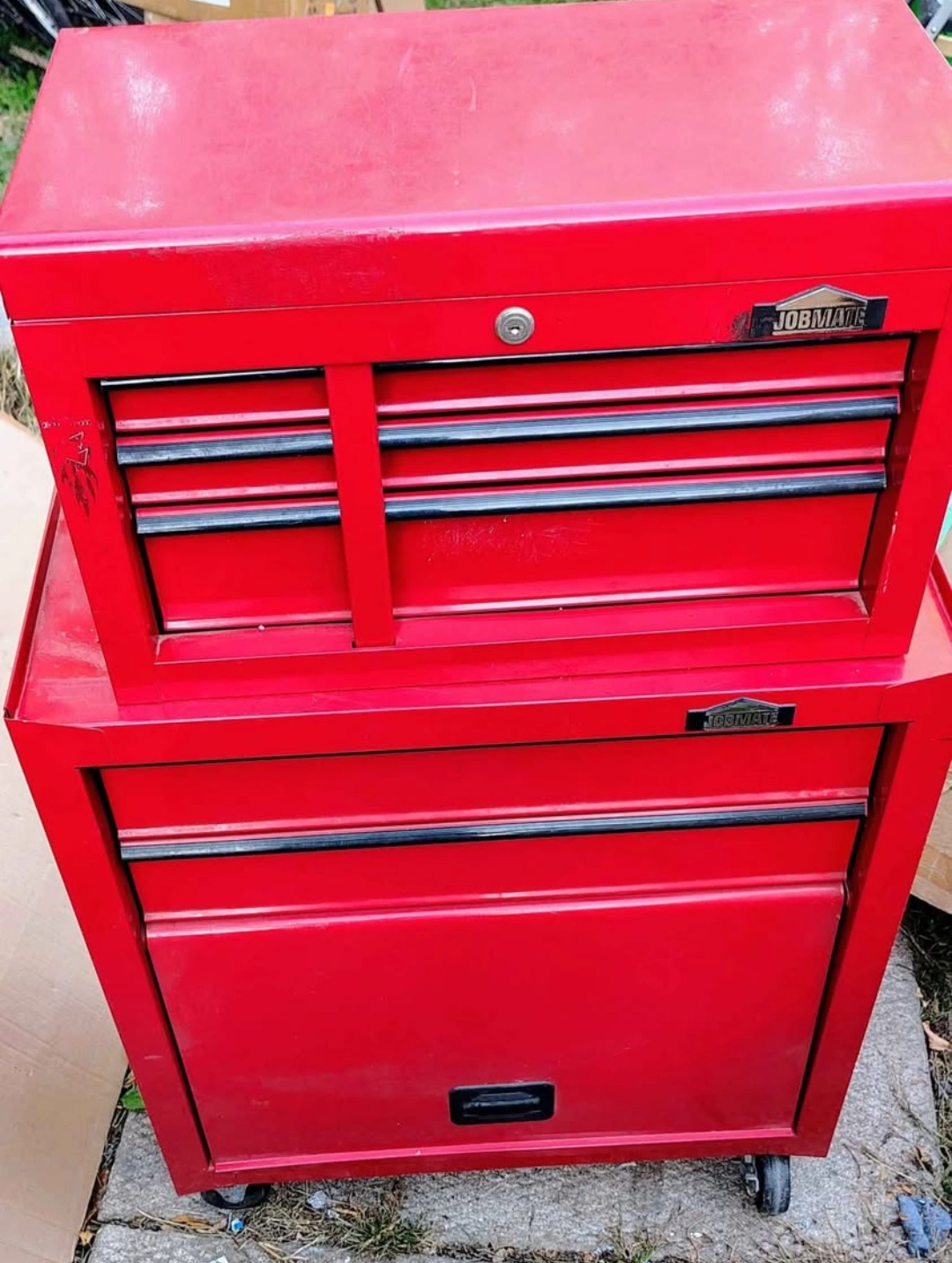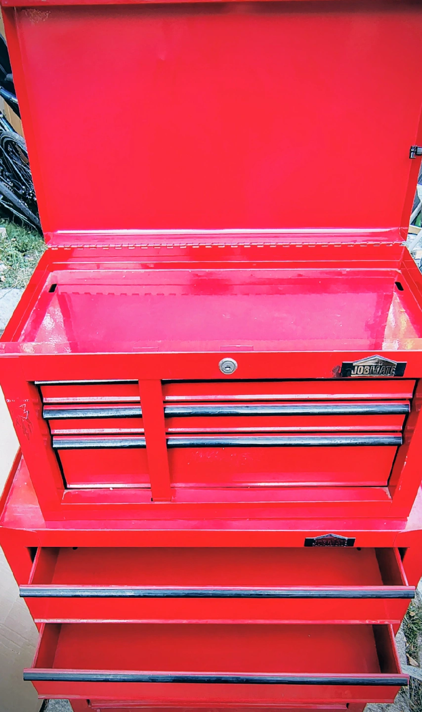 Selling a red Jobmate tool chest! It has some signs of wear, as you can see in the photos, but it's still very functional. Perfect for organizing your tools in the garage or workshop 12 * 22 * 14 - top box 24 * 13 ¾ * 27 ¾ - bottom box 43 inch full height from ground with top Drawer
