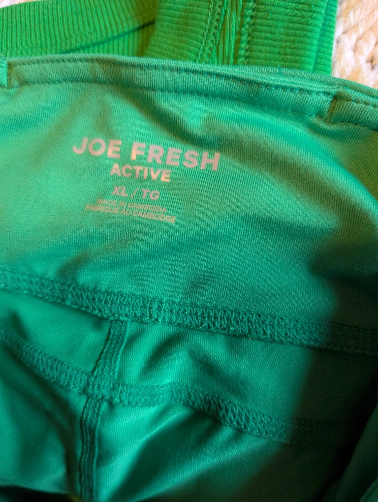 Selling a Joe Fresh Active set, including a tank top and leggings! The tank is an IX from Old Navy, and the leggings are an XL from Joe Fresh. Both are a vibrant green colour, perfect for workouts or casual wear