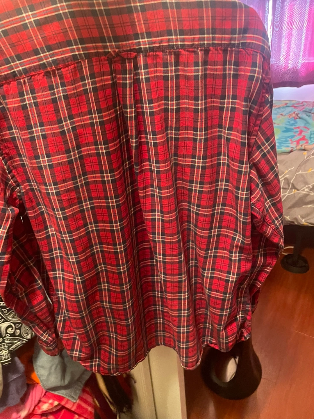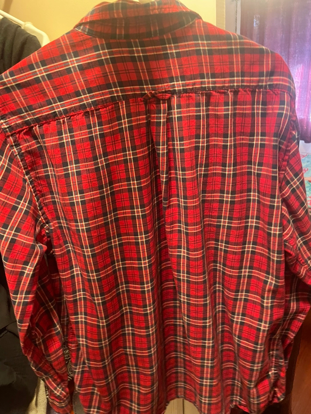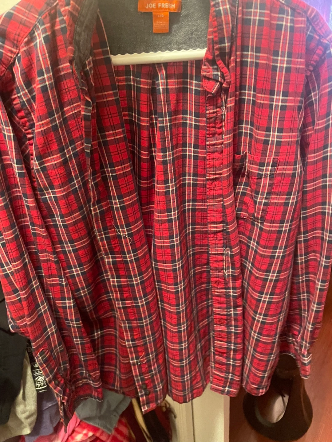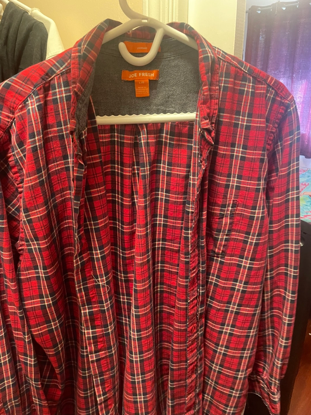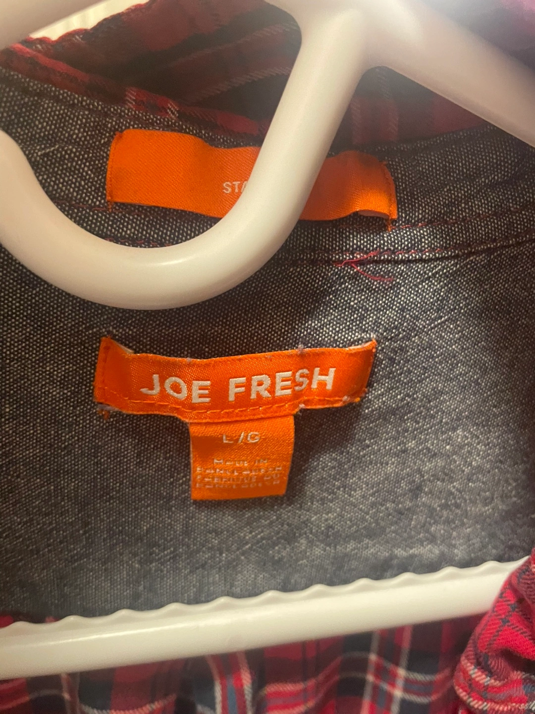 Selling a Joe Fresh flannel shirt in size L/G. It features a classic red plaid pattern. This comfy shirt is perfect for layering or wearing on its own!