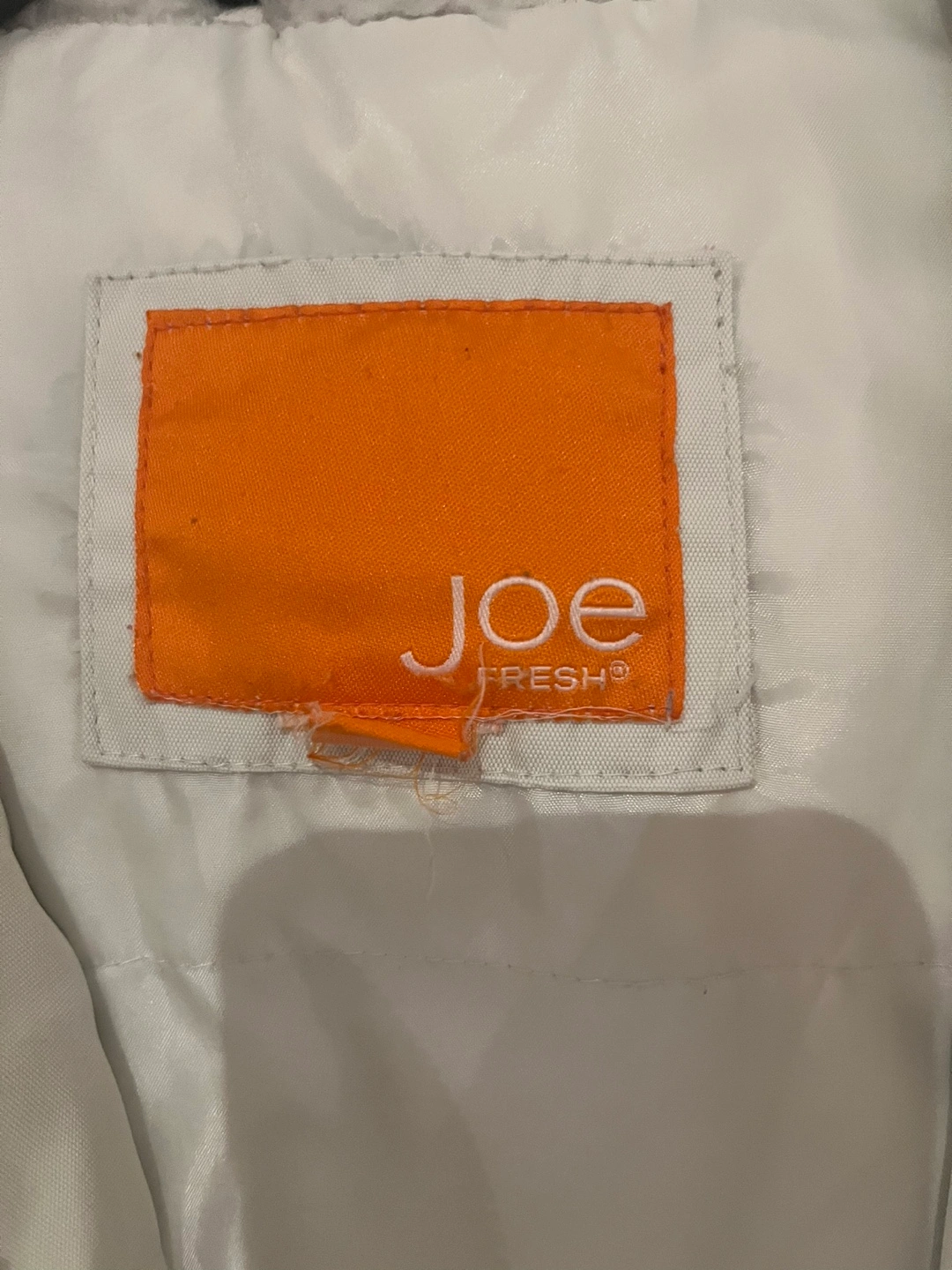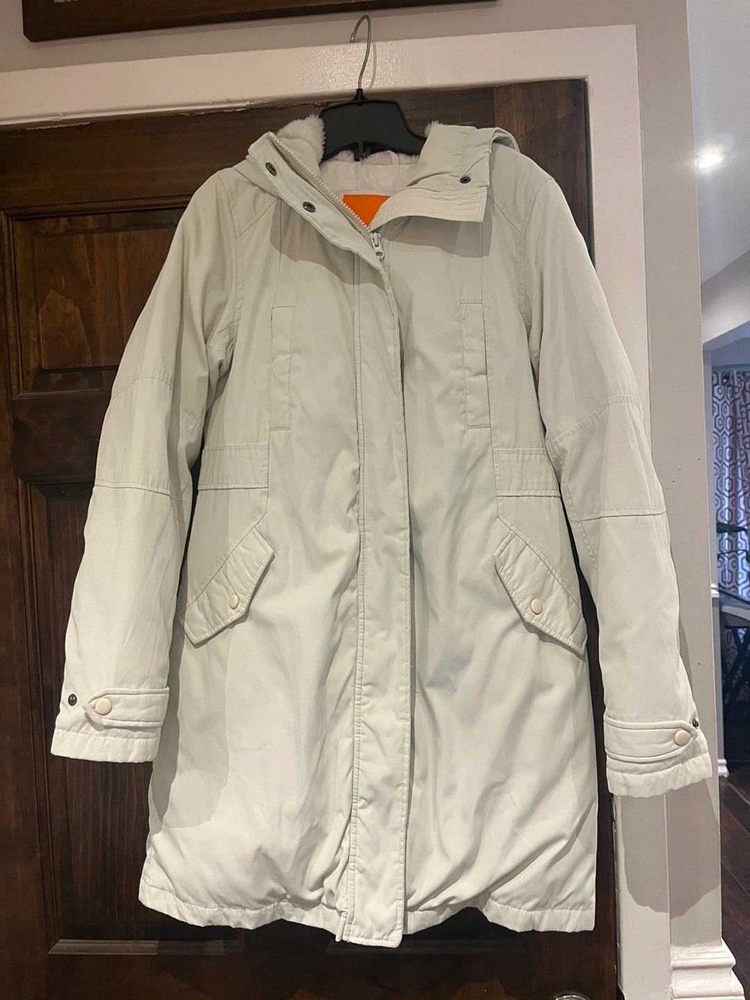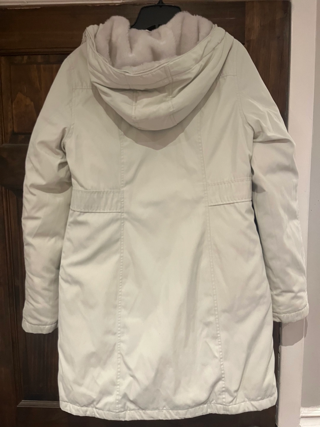 Long winter coat with a hood lined with faux fur. Light beige colour. Pick up Tomken and Burnhamthorpe.