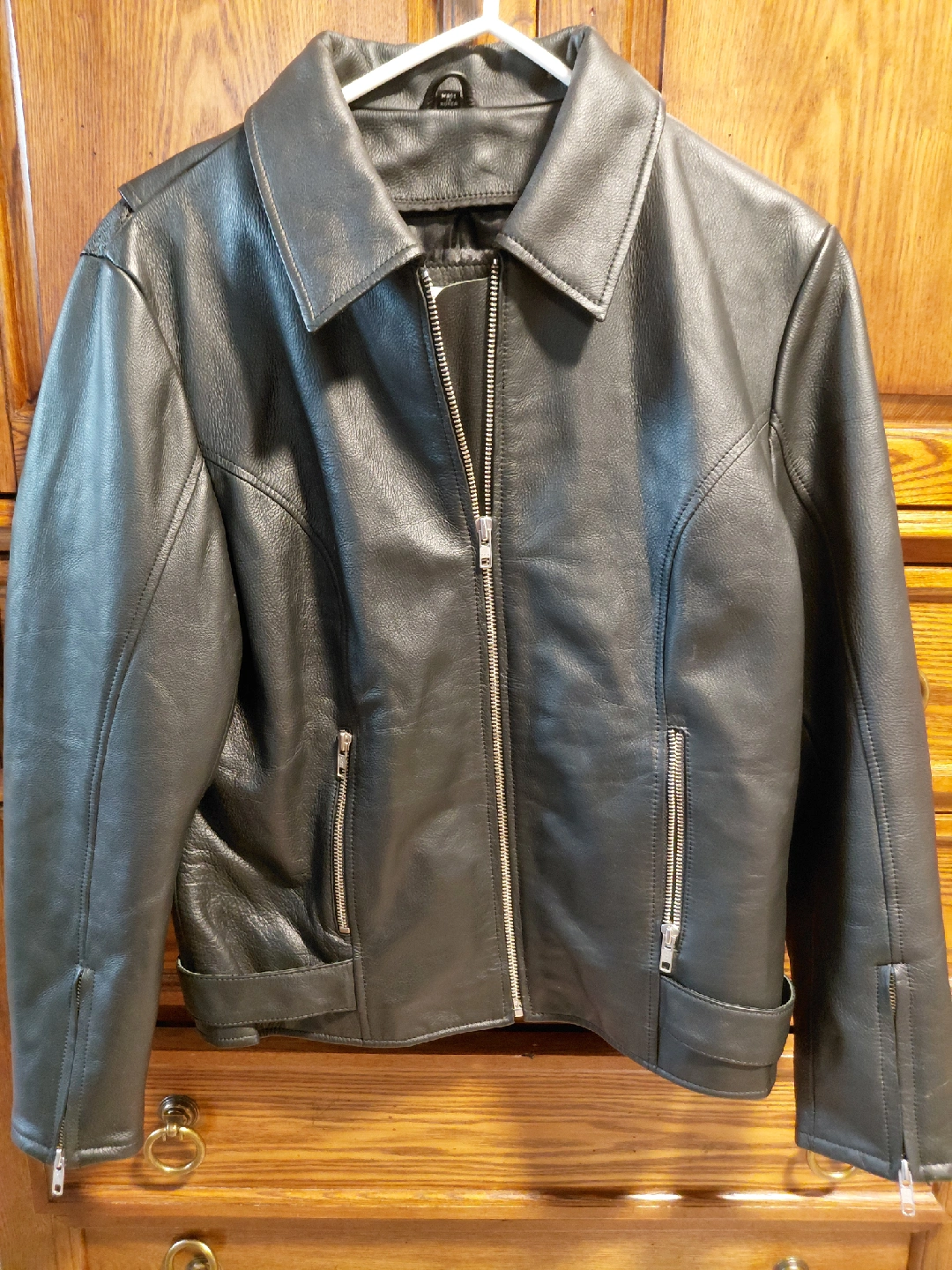 Selling a Joe Rocket black leather jacket in size L. It's in great condition and ready for a new owner! The jacket features a classic design with a zipper closure and multiple pockets. Perfect for riding or everyday wear!