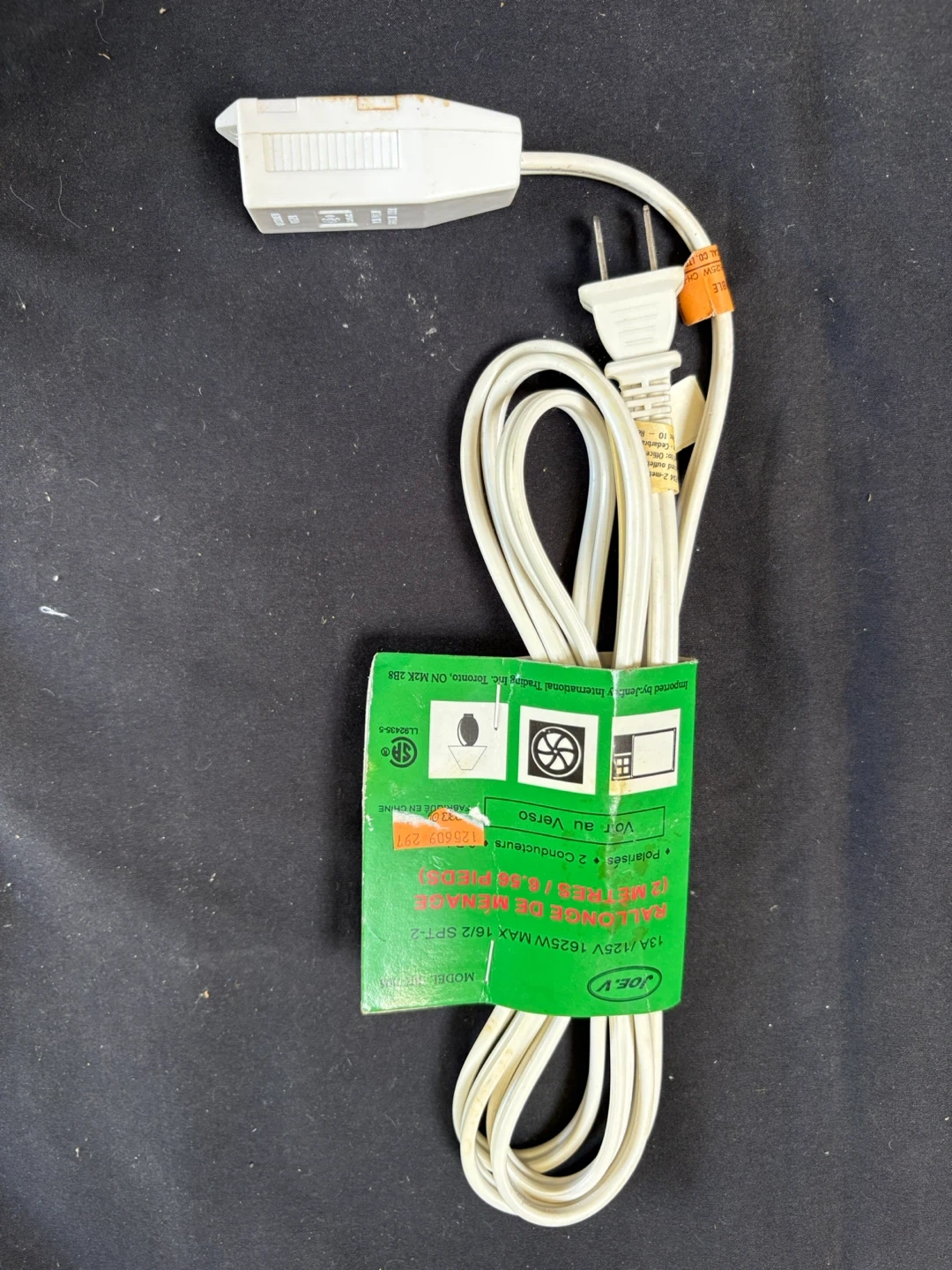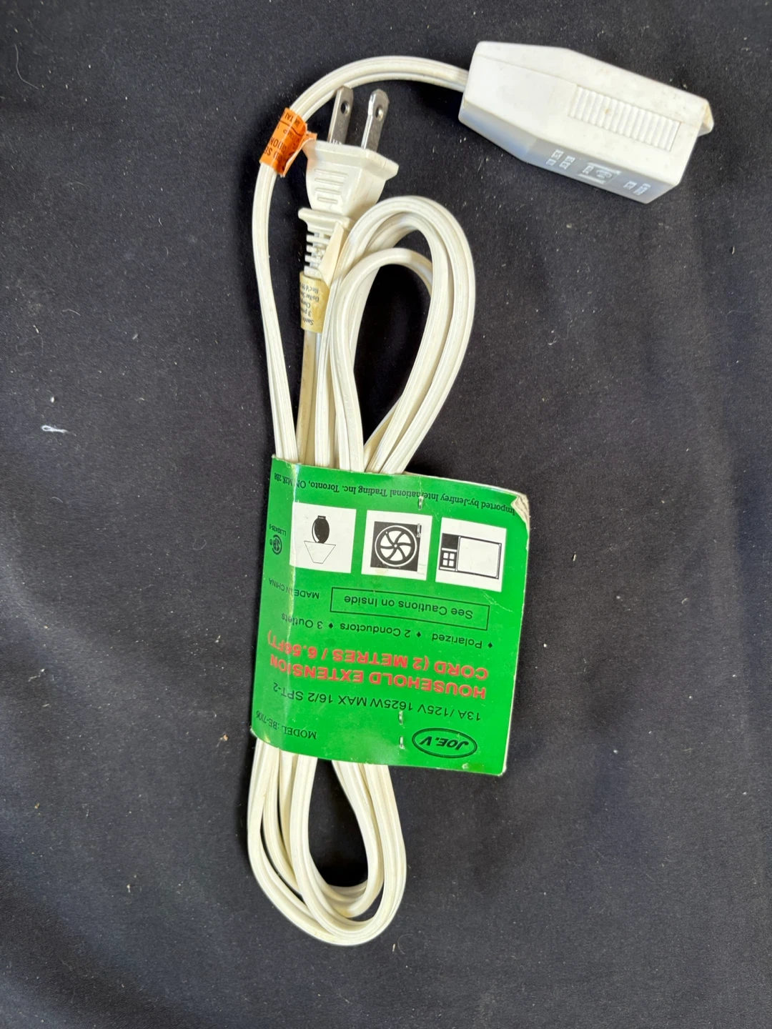 🧡new JOE.V 13A/125V Household Extension Cord Selling a JOE.V household extension cord. It's a 13A/125V, 1625W MAX 16/2 SPT-2 cord, measuring 2 meters (6.56 feet). It has 3 outlets and is polarized with 2 conductors. Perfect for household use! $1 Pick up Victoria Park & O’Connor area