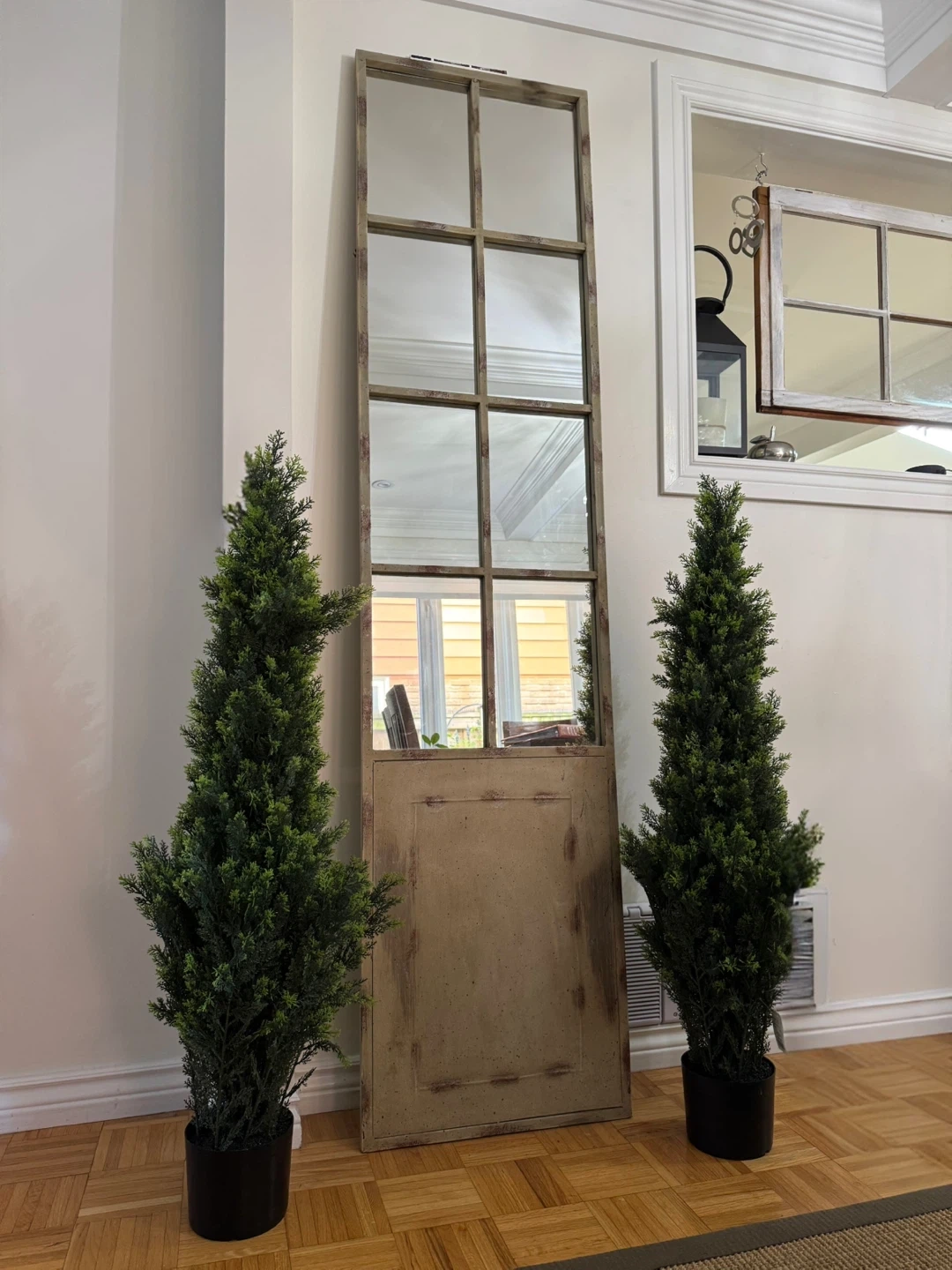 This accent mirror will bring any bedroom or living room together by filling up empty wall space and reflecting light onto your space. It's made in the USA and has a full-length metal frame in an antique beige bronze finish. 20x83 inches.