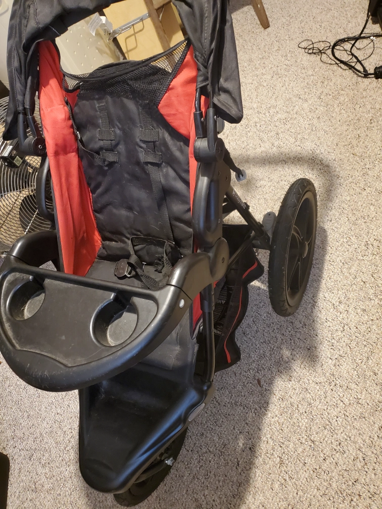 great hogging stroller has a basket underneath, peekaboo sunshade, 5 point harness and seat folds down for baby to nap if needed