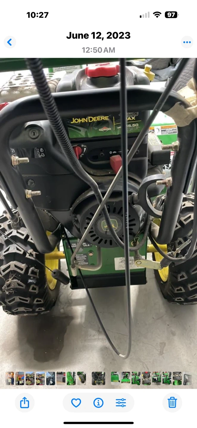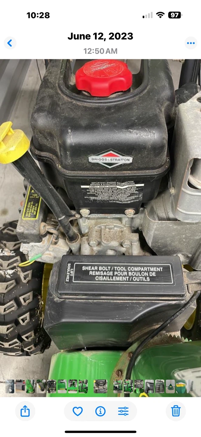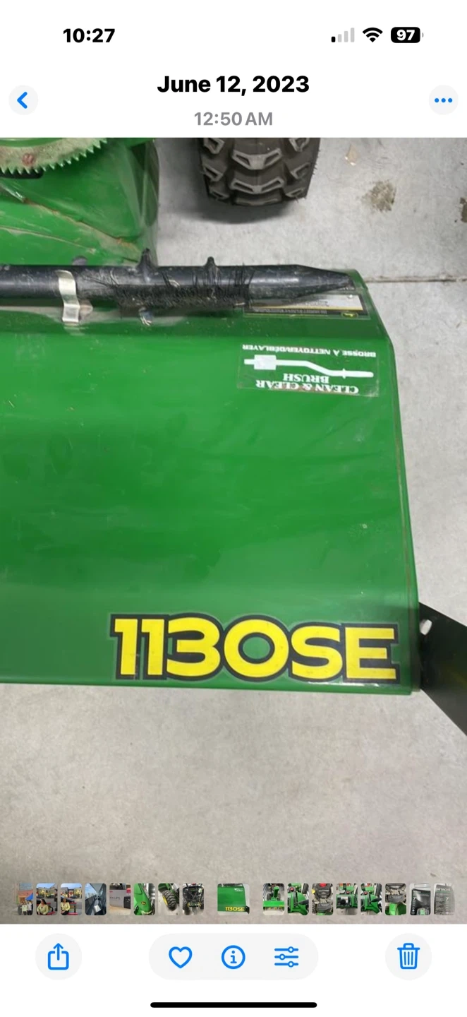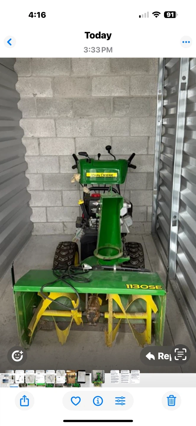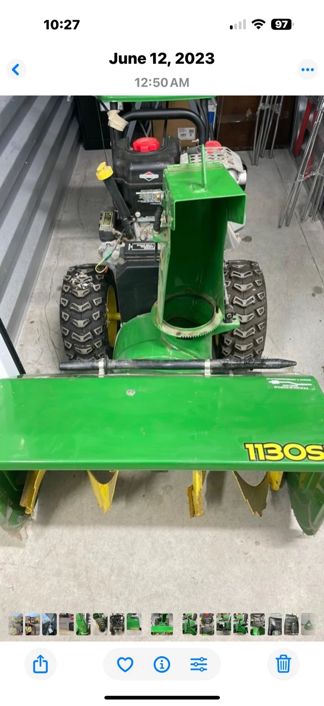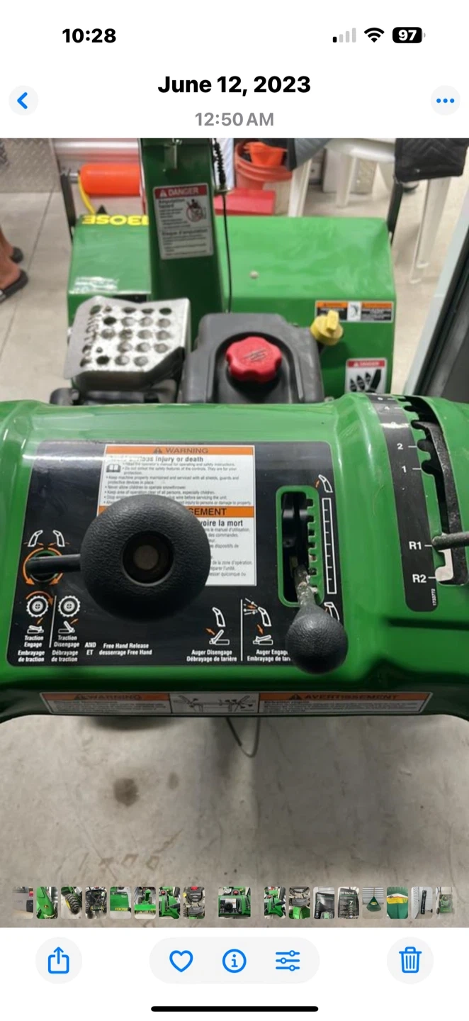 MEETING LOCATION: SELF STORAGE @ 401 & Markham Road, Scarborough ***Cash payment only RETAIL VALUE: $5700.00 Professional-Grade John Deere 1130SE Snow Blower - Briggs & Stratton Engine Powerful Snow-Clearing Machine: Professional-grade, two-stage snow blower from the trusted John Deere brand, model 1130SE. **Heavy-Duty Engine: Equipped with a powerful Briggs & Stratton engine with a 342 CC displacement, ready to tackle heavy, wet snow with ease. **Impressive Clearing Power: Features a 30-inch clearing width and a 21-inch intake height, allowing you to clear large driveways and walkways quickly. **Multiple Speeds: Includes multiple forward and reverse speeds (6 forward, 2 reverse) for optimal control and maneuverability in any condition. **Durable Design: Constructed with a robust steel auger and impeller to efficiently break down and throw snow. **Adjustable Chute: The chute can be rotated up to 130 degrees, giving you precise control over where the snow is discharged. **Easy Handling: Large, heavy-duty tires provide excellent traction and stability. **Reliable Starting: Features both electric and recoil starting options for dependable ignition in cold weather. **Perfect for: Homeowners with large driveways, small businesses, or anyone needing a reliable and powerful snow blower to handle Canadian winters. ***IMPORTANT BONUS FEATURE: Comfort in Cold Weather: Features heated hand grips, a crucial comfort for operating in frosty conditions and a lifesaver for your hands during long clearing sessions. • Condition: EXCELLENT!! Well-maintained and ready for the season!! Reason for selling: downsizing!