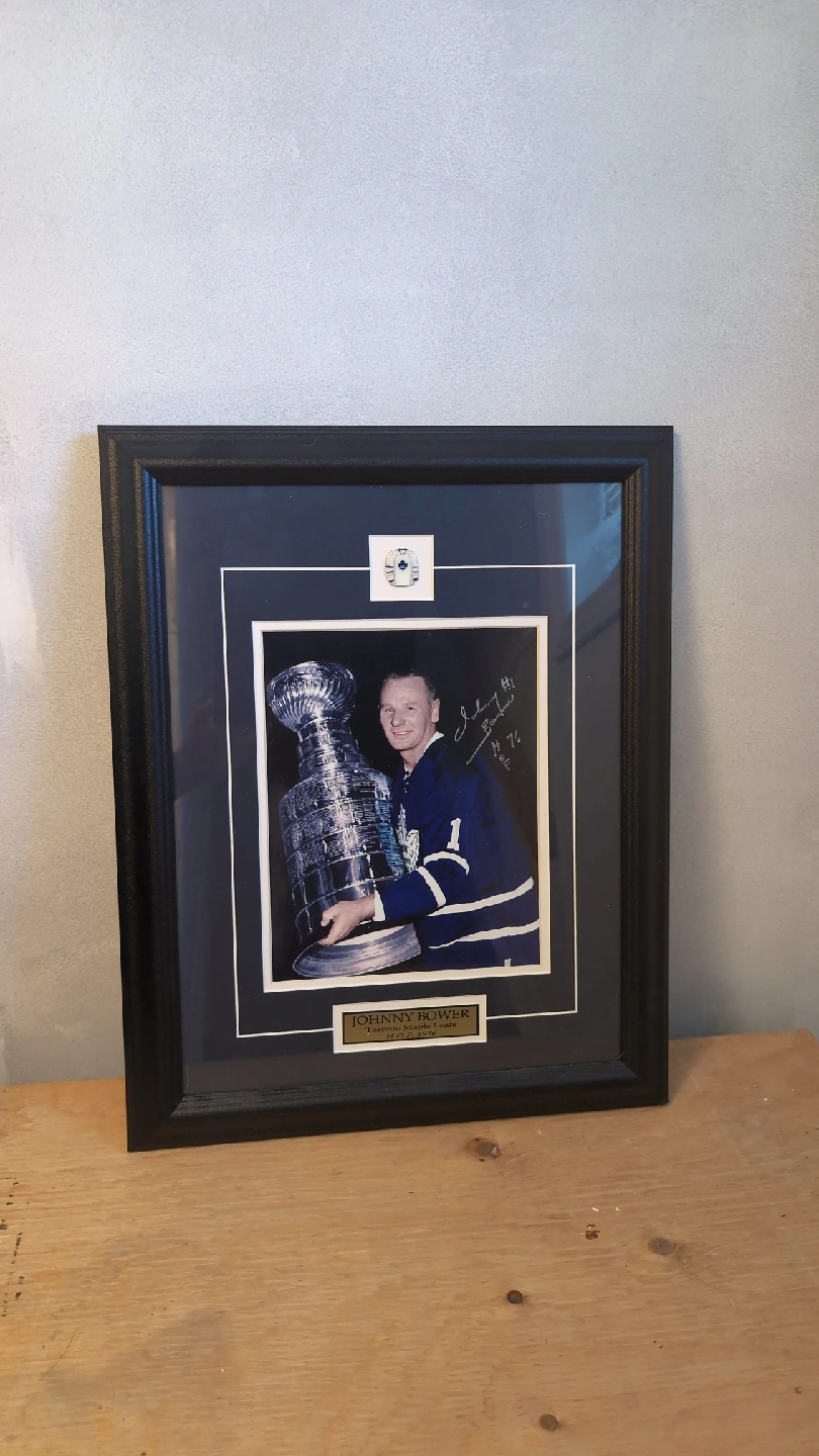 Selling a framed and signed photo of Johnny Bower of the Toronto Maple Leafs. It commemorates his induction into the Hockey Hall of Fame in 1976. A great piece for any Leafs fan!