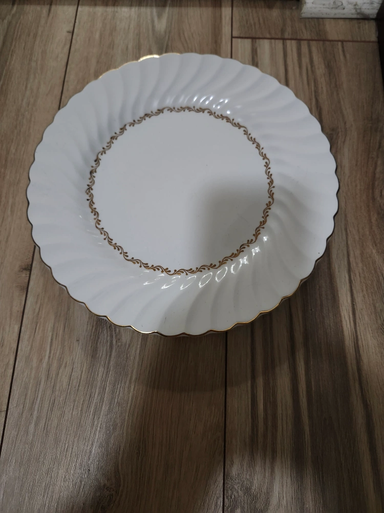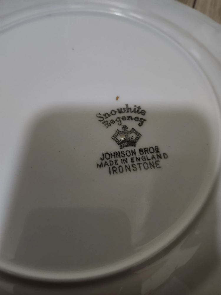 Selling a set of Johnson Bros Snowhite Regency Ironstone dishes. This set includes a large plate, a smaller plate, a small bowl, and a teacup with a saucer. Perfect for adding a touch of elegance to your dining experience! 8 pieces of each.