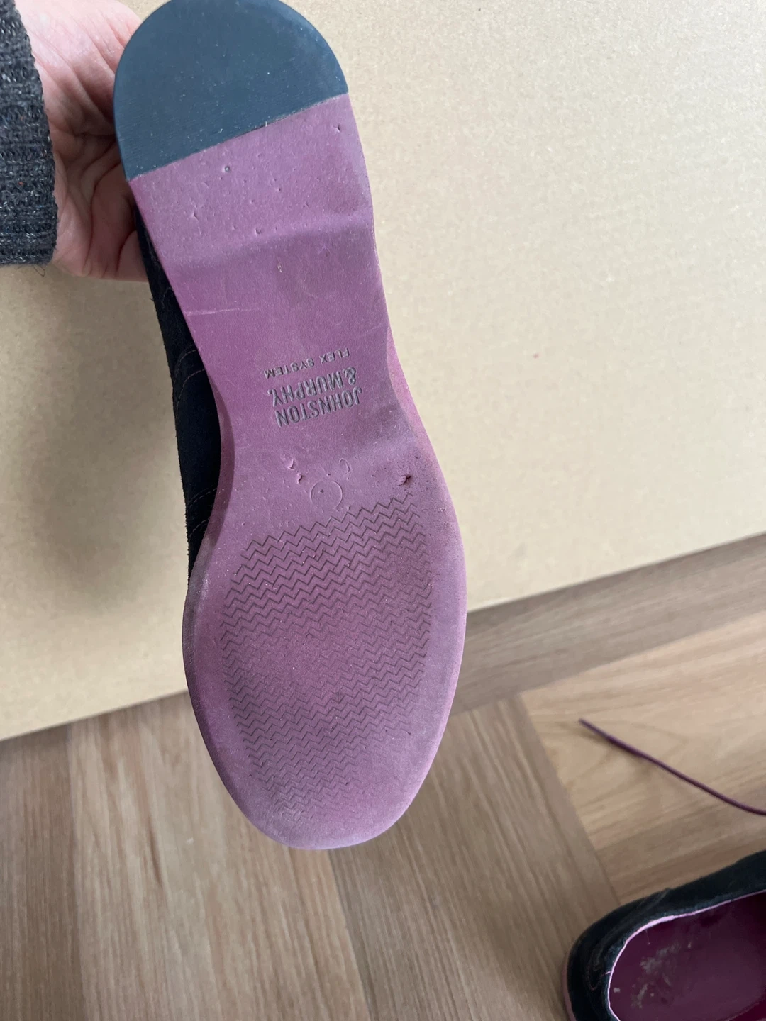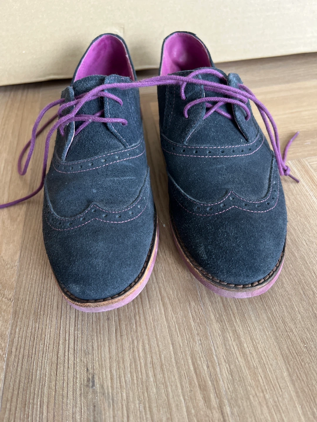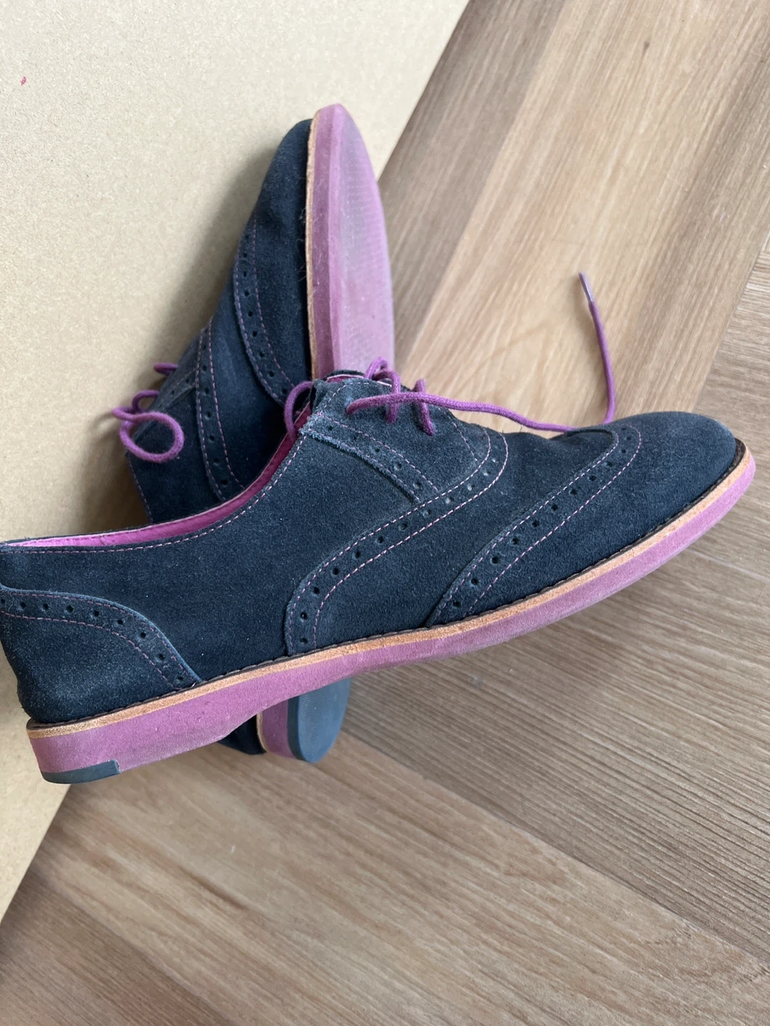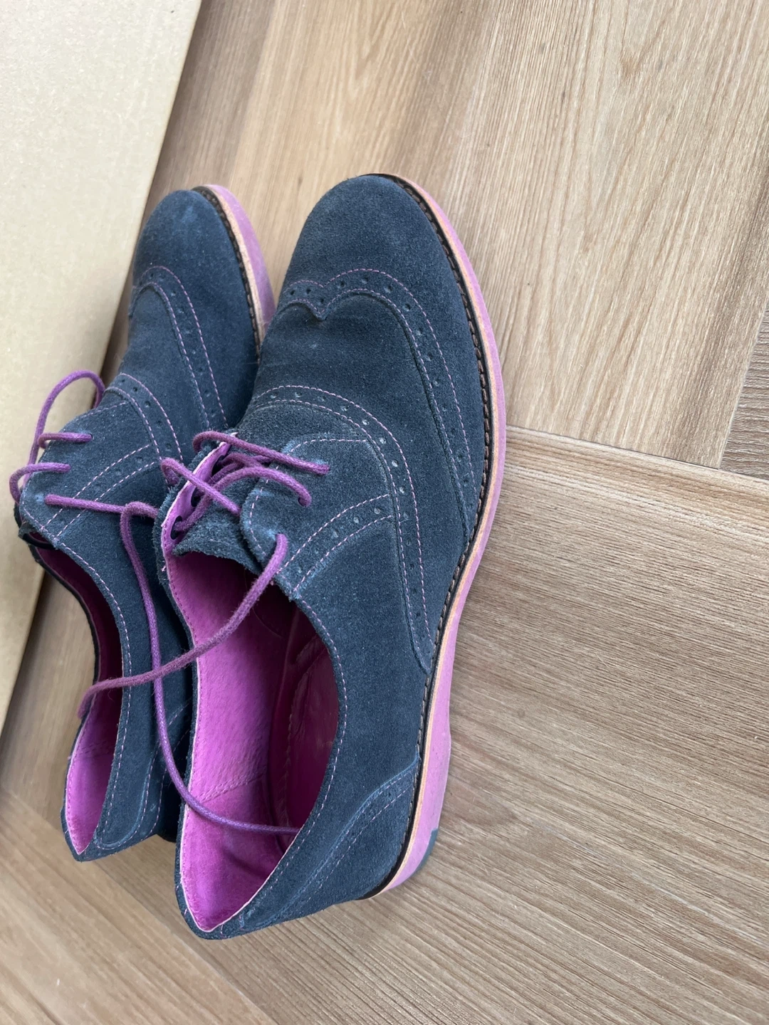 These are a pair of Johnston & Murphy wingtip shoes. They're made of a nice suede material and feature a unique purple sole and laces. They show some signs of wear, but still have lots of life left!