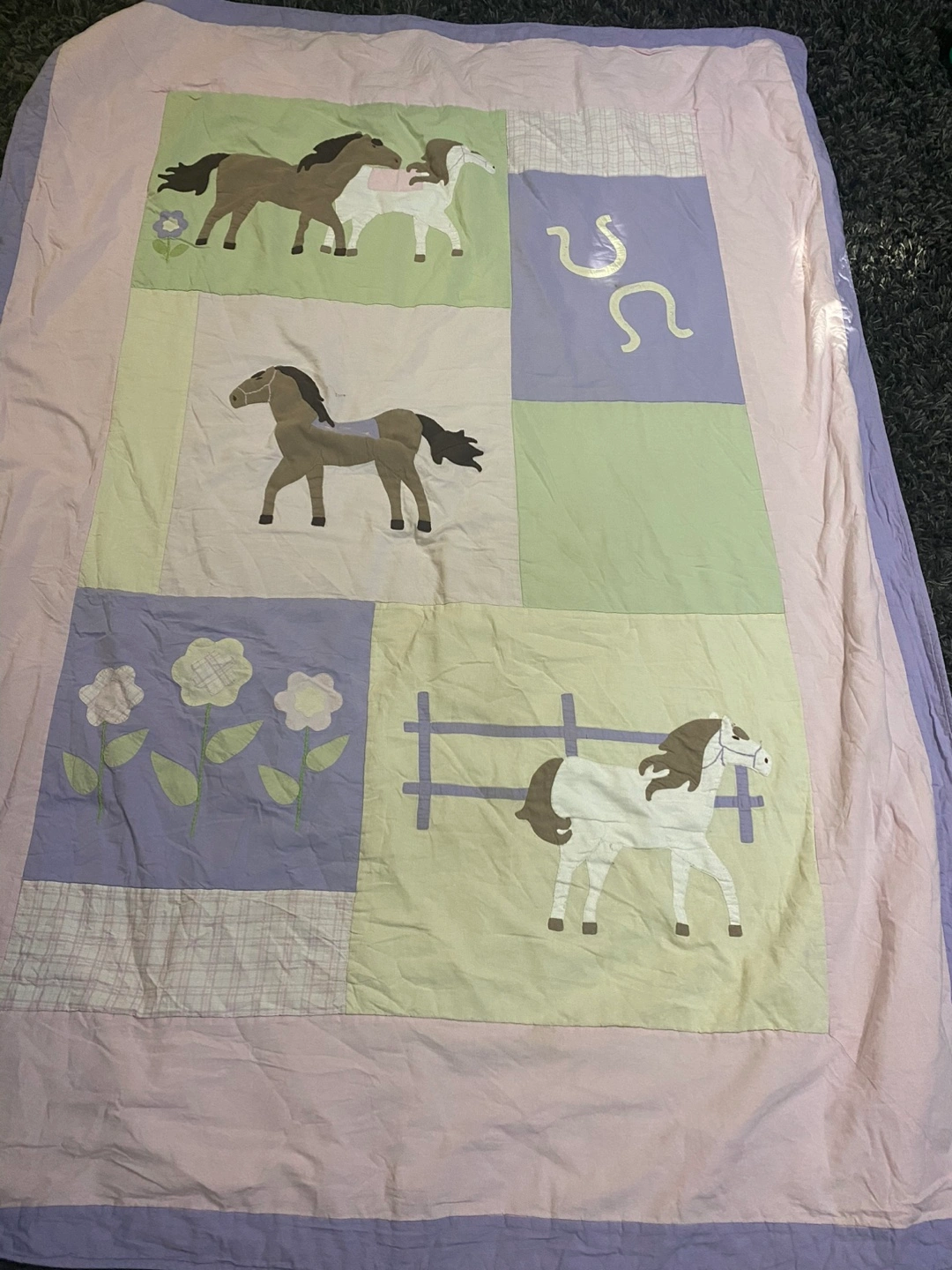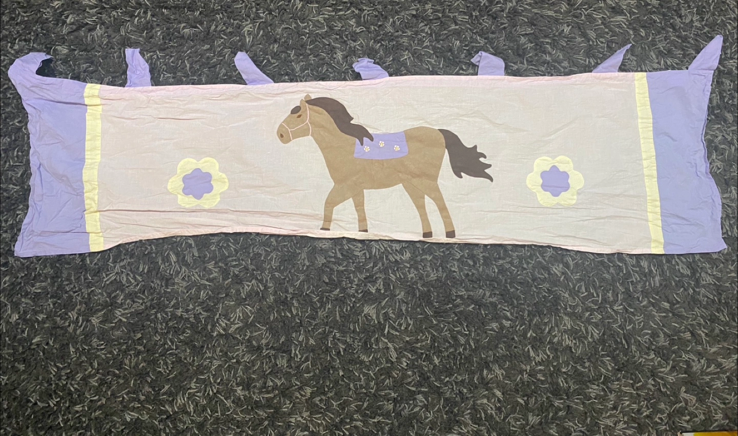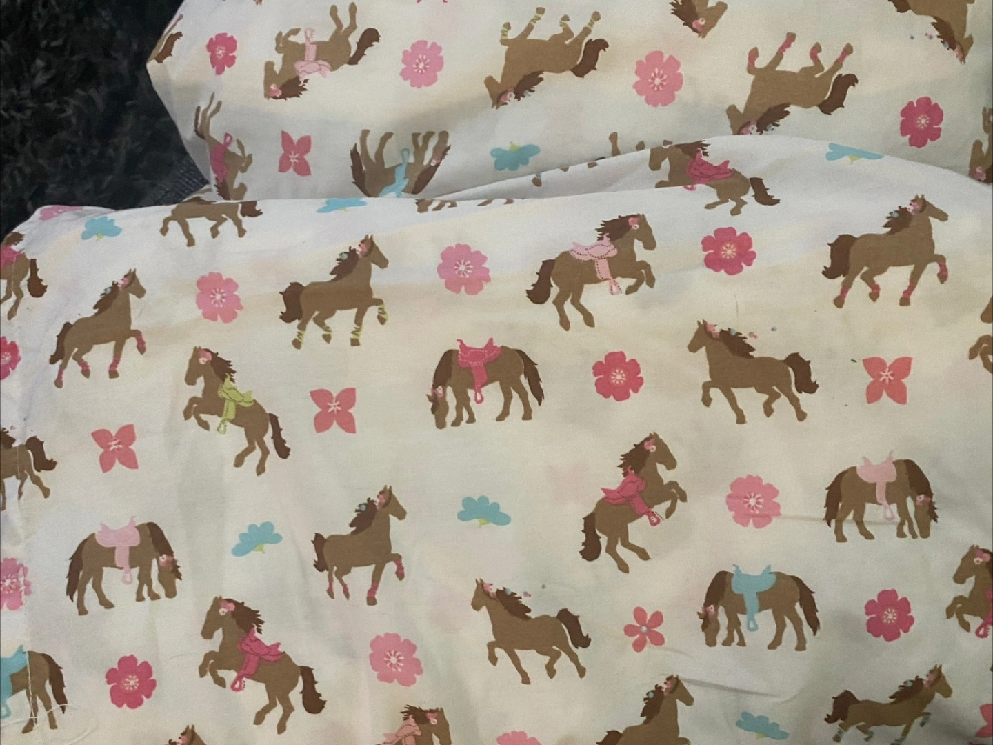 Selling a JoJo Designs horse-themed single bedding set! It's super cute with pastel colours and horse motifs. Includes a quilt and a bed skirt. The quilt's size is 44x58 inches. Plus Window valance single horse fitted & top sheet bedding. Unicorn blanket Perfect for a kid's room!