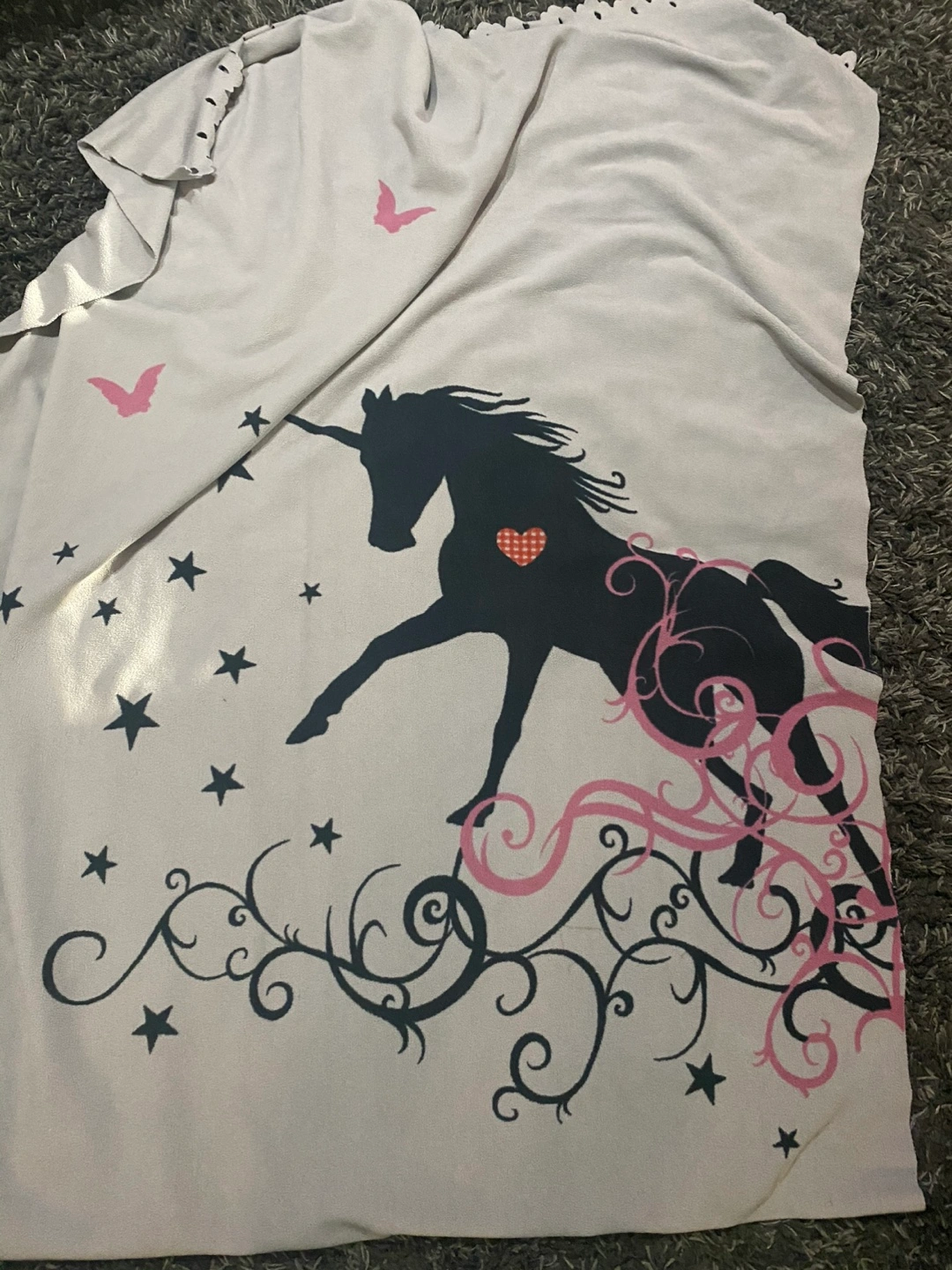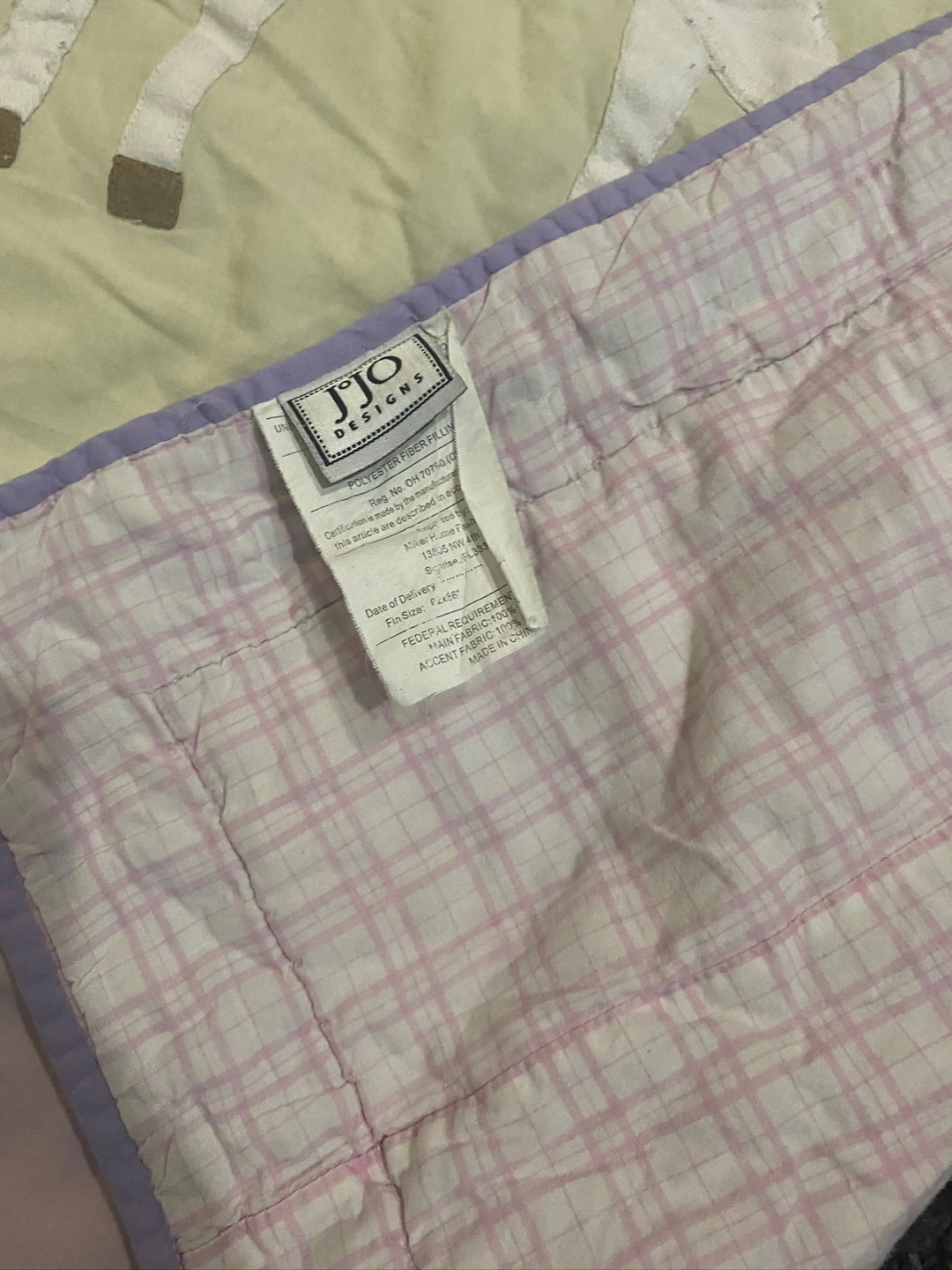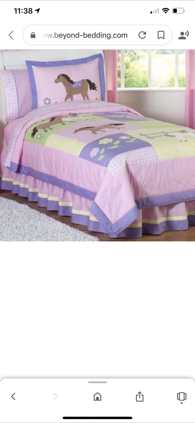 Selling a JoJo Designs horse-themed single bedding set! It's super cute with pastel colours and horse motifs. Includes a quilt and a bed skirt. The quilt's size is 44x58 inches. Plus Window valance single horse fitted & top sheet bedding. Unicorn blanket Perfect for a kid's room!