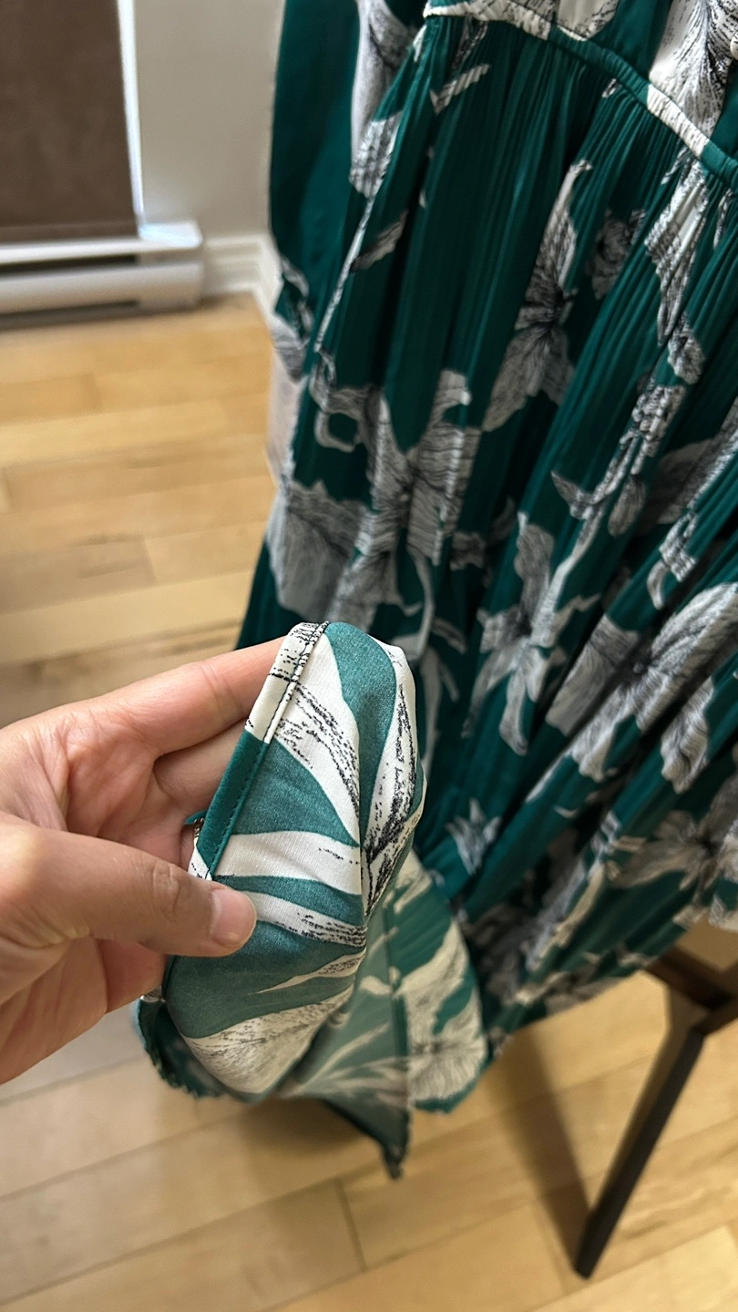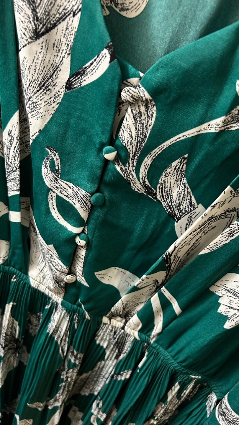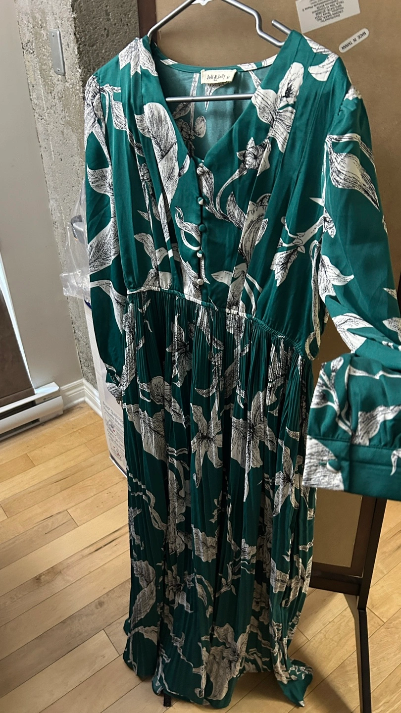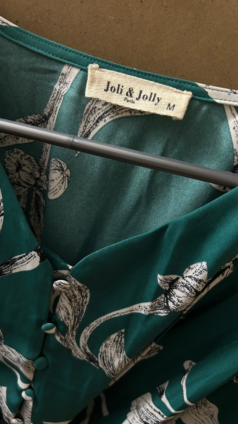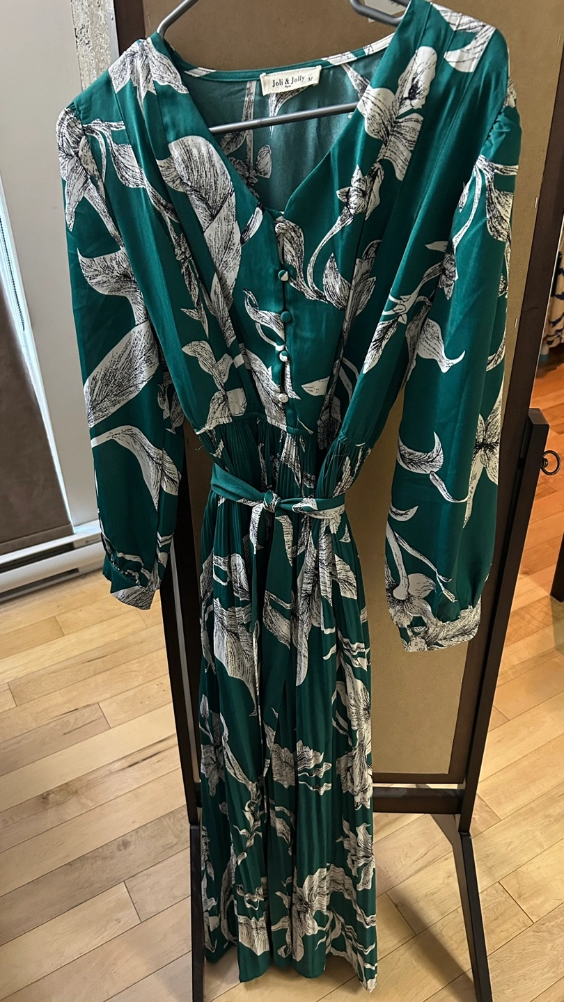 Selling a lovely Joli & Jolly Paris dress in size M! It features a beautiful floral pattern on a rich green fabric. The dress has a flattering V-neck and long sleeves, perfect for any occasion.