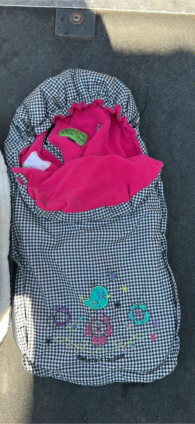 Keep your little one cozy with this Jolly Jumper Arctic Sneak-a-Peek car seat cover! It features a snuggly sherpa lining and a stylish black and white checkered exterior with cute floral and elephant embroidery. Perfect for those chilly Canadian days! 20$ each