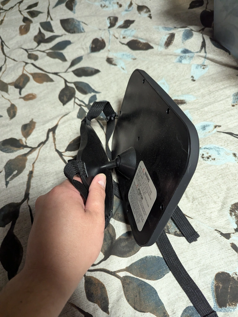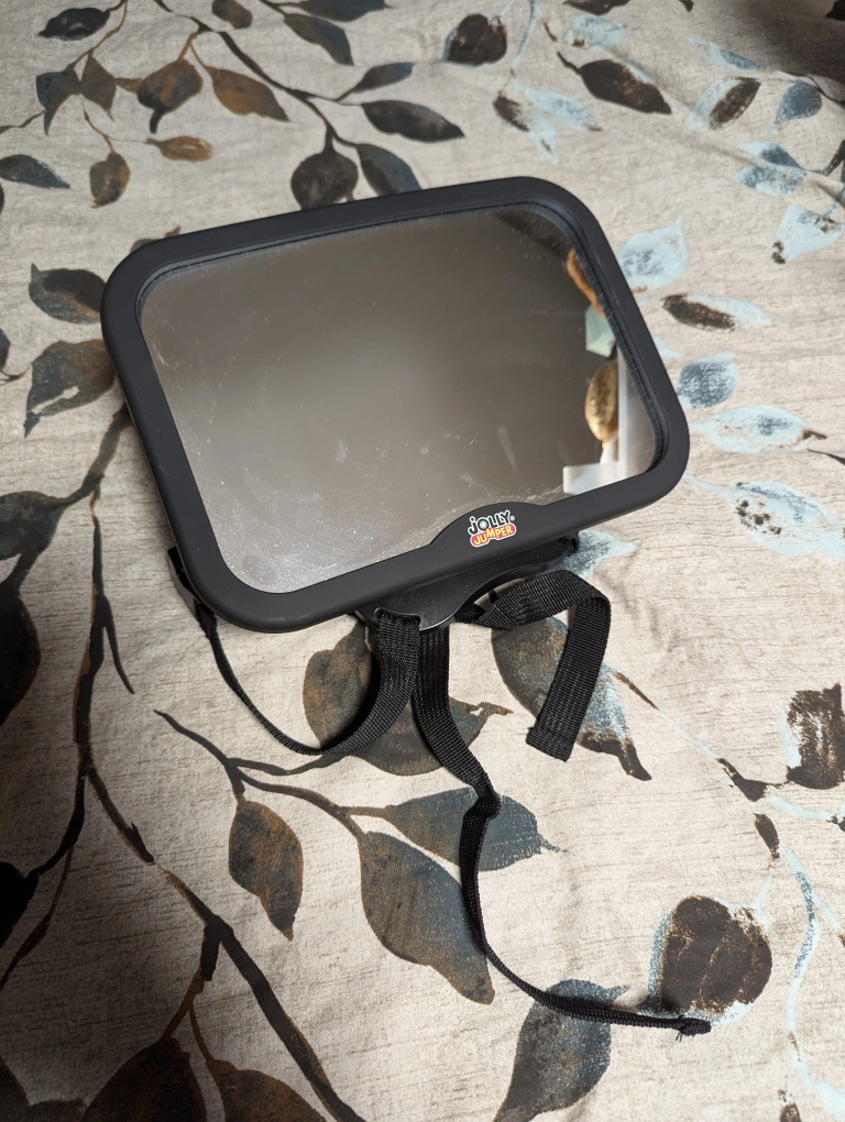 Rear-view mirror for use in a car. Comes with adjustable straps to secure to headrest.