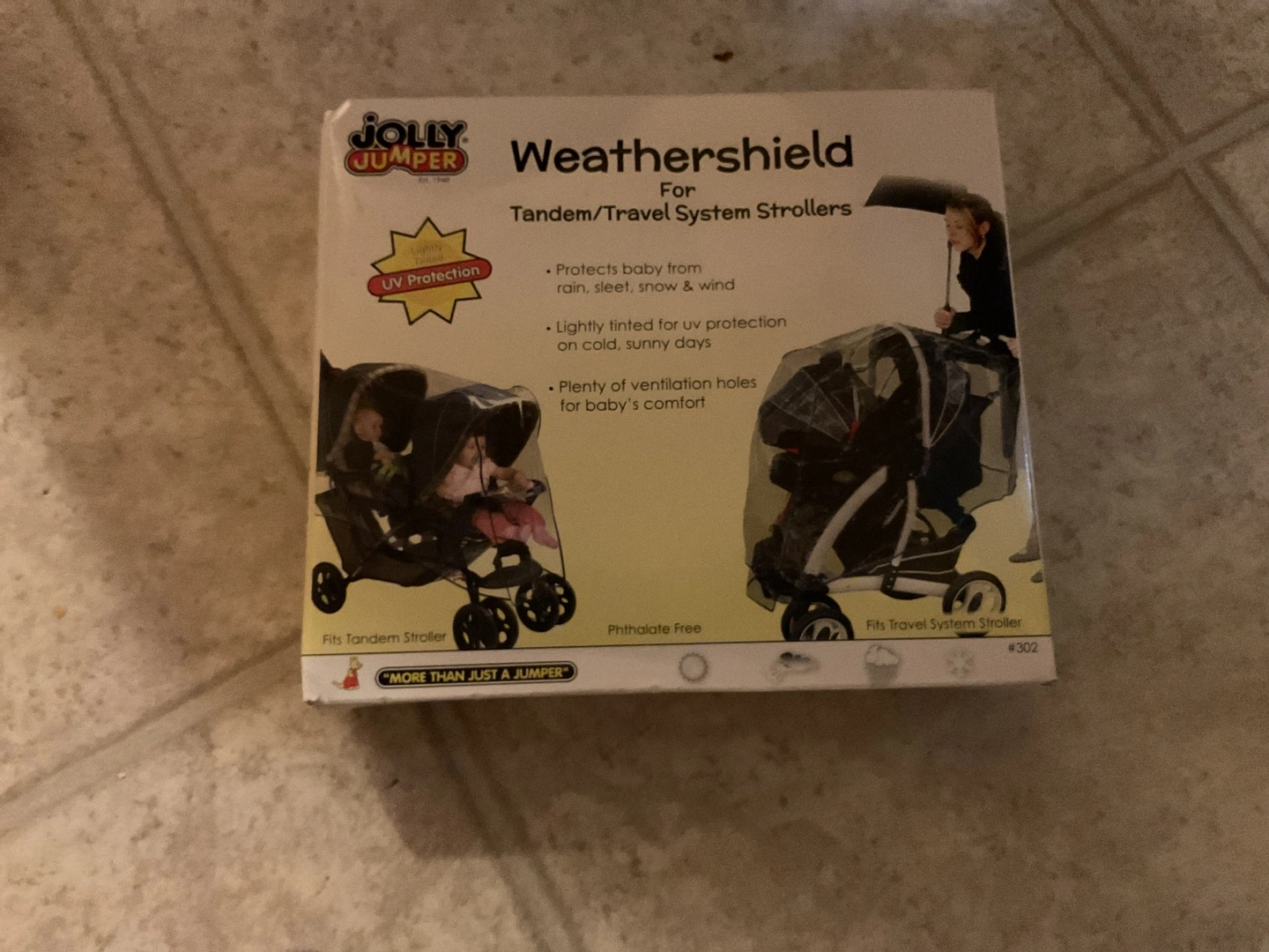Keep your little ones protected from the elements with this Jolly Jumper Weathershield! It's designed for tandem and travel system strollers, shielding your baby from rain, sleet, snow, and wind. It's lightly tinted for UV protection on those cold, sunny days, and has plenty of ventilation holes to keep baby comfy. Phthalate free!