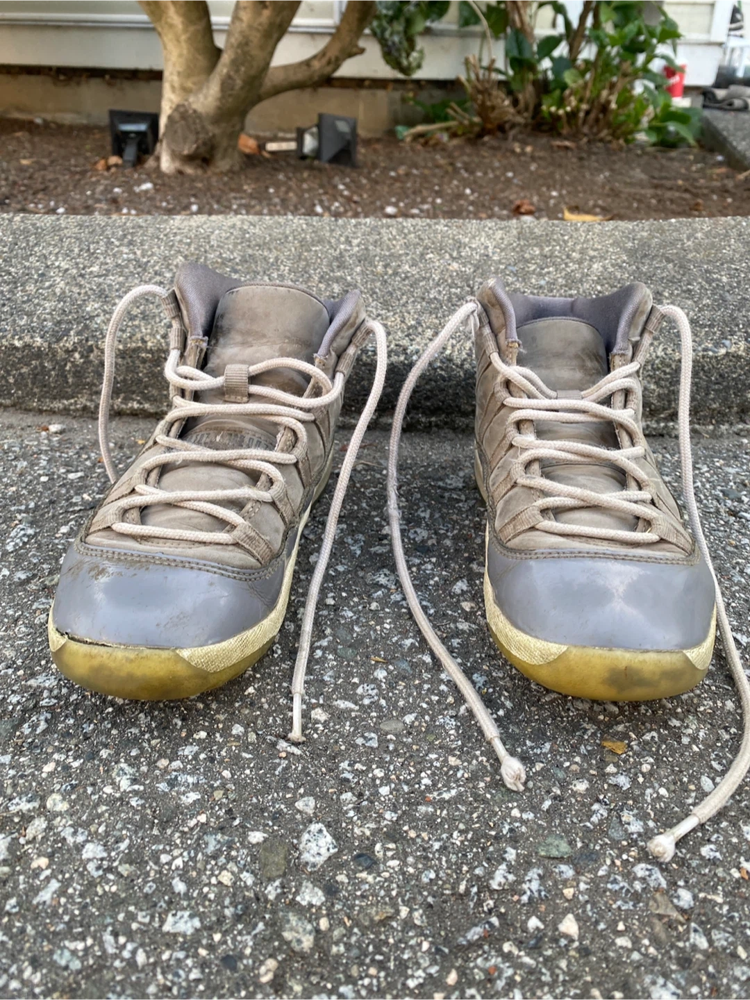 Selling a pair of Jordan 11 Retro sneakers in grey. They show some signs of wear but still have lots of life left! Perfect for everyday wear or for adding to your collection