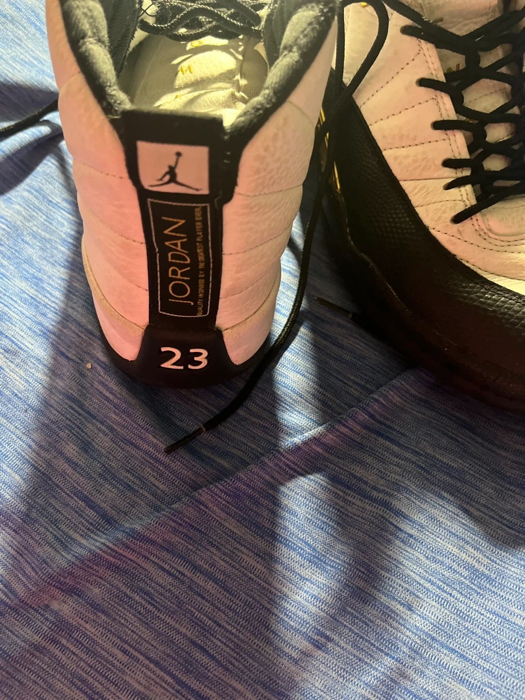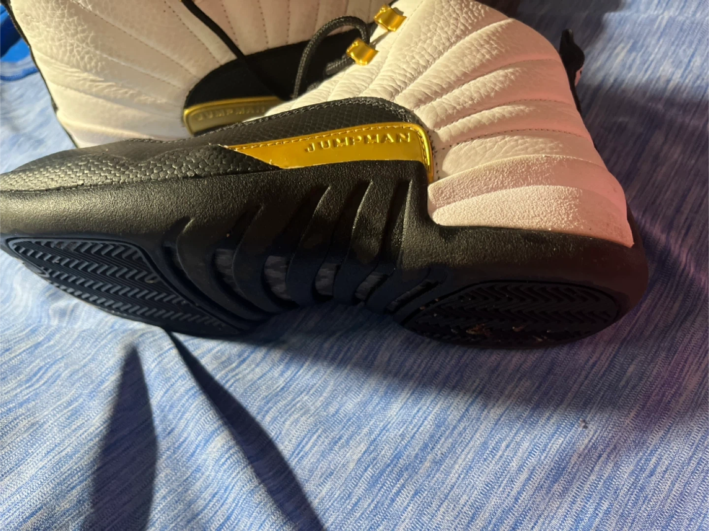 Selling a pair of Jordan 12 Retro sneakers in a stylish white, black, and gold colourway. They are in good condition. Size is 8.5 US and you can come and check them before you buy them.