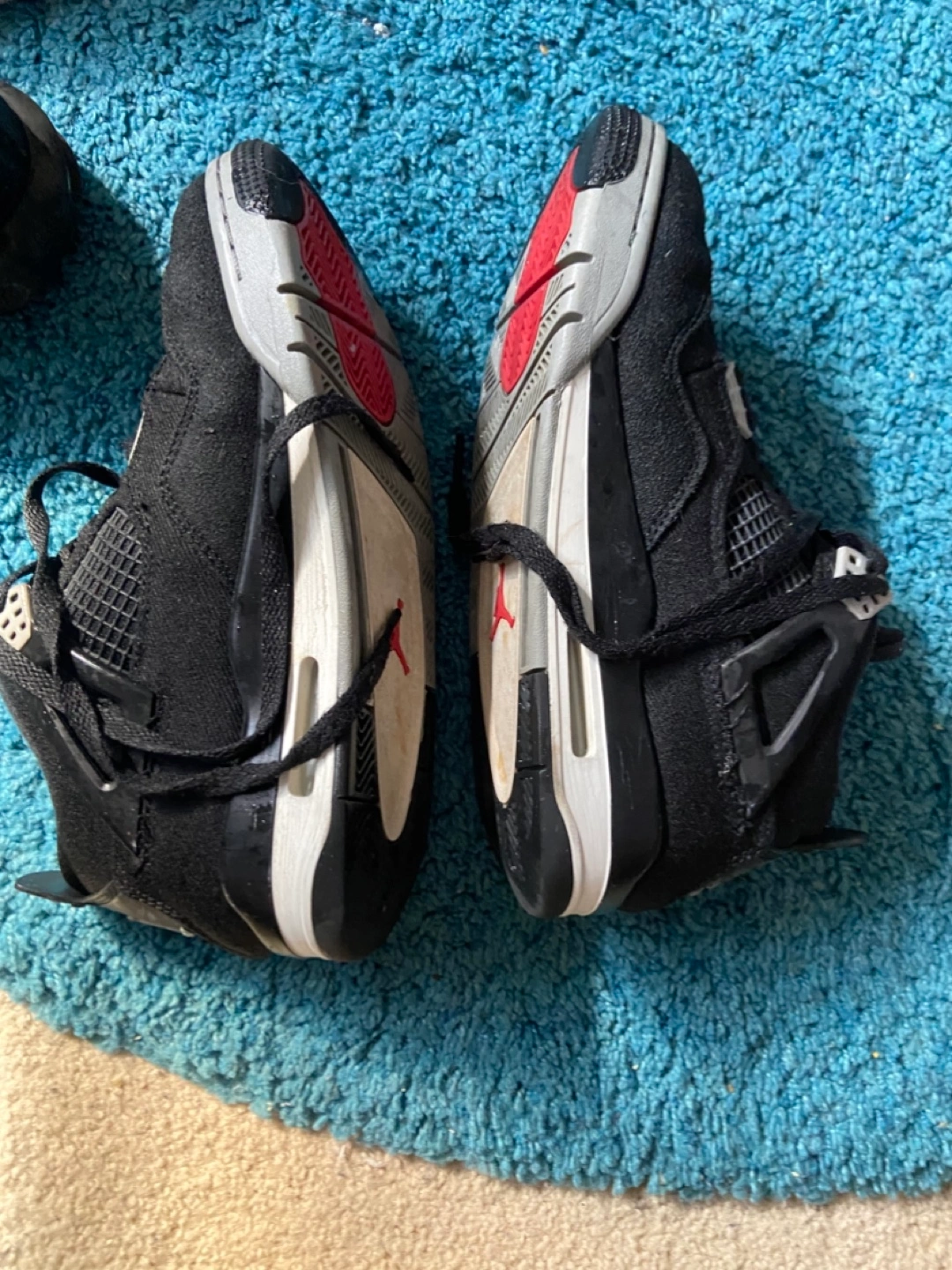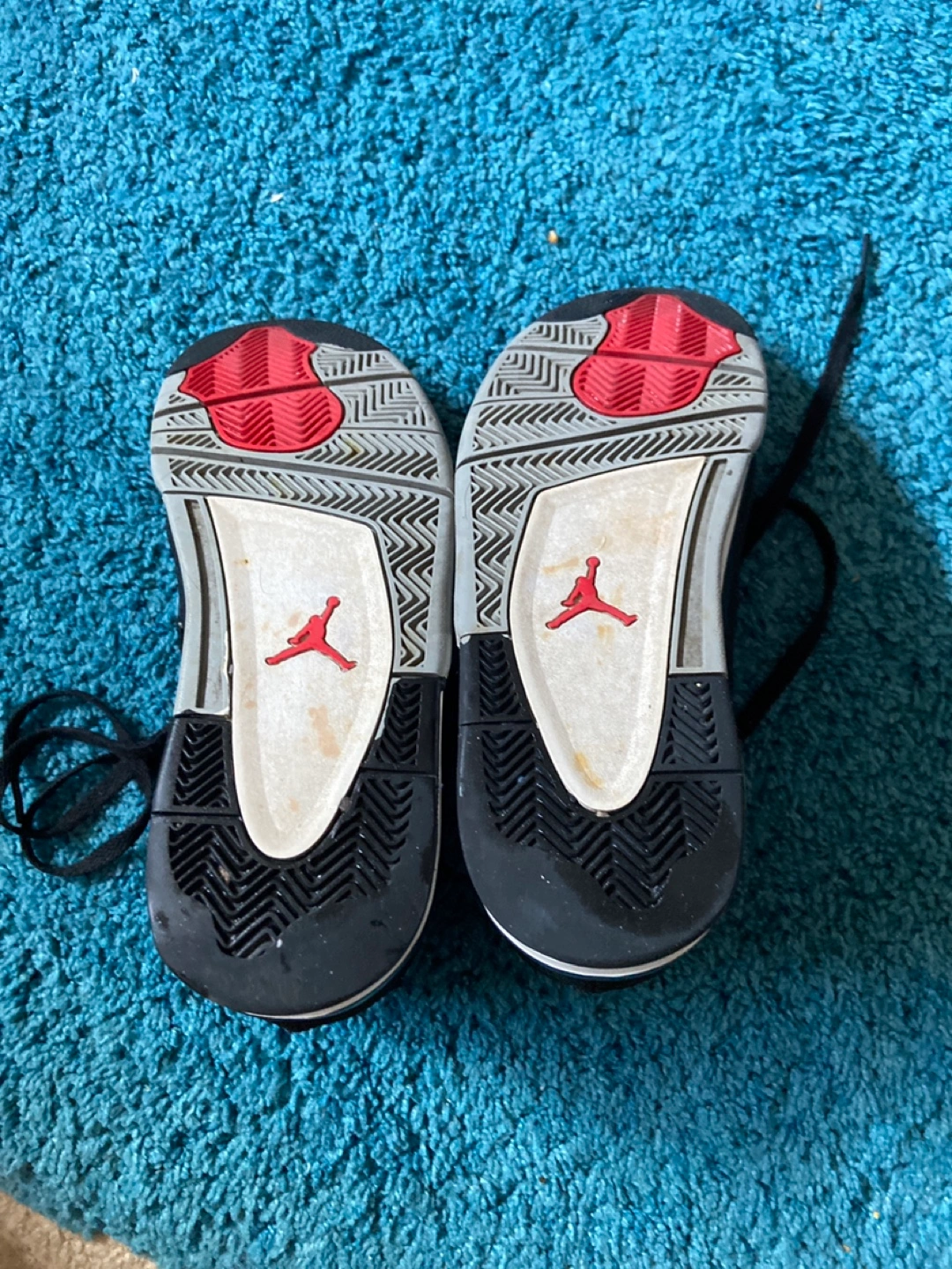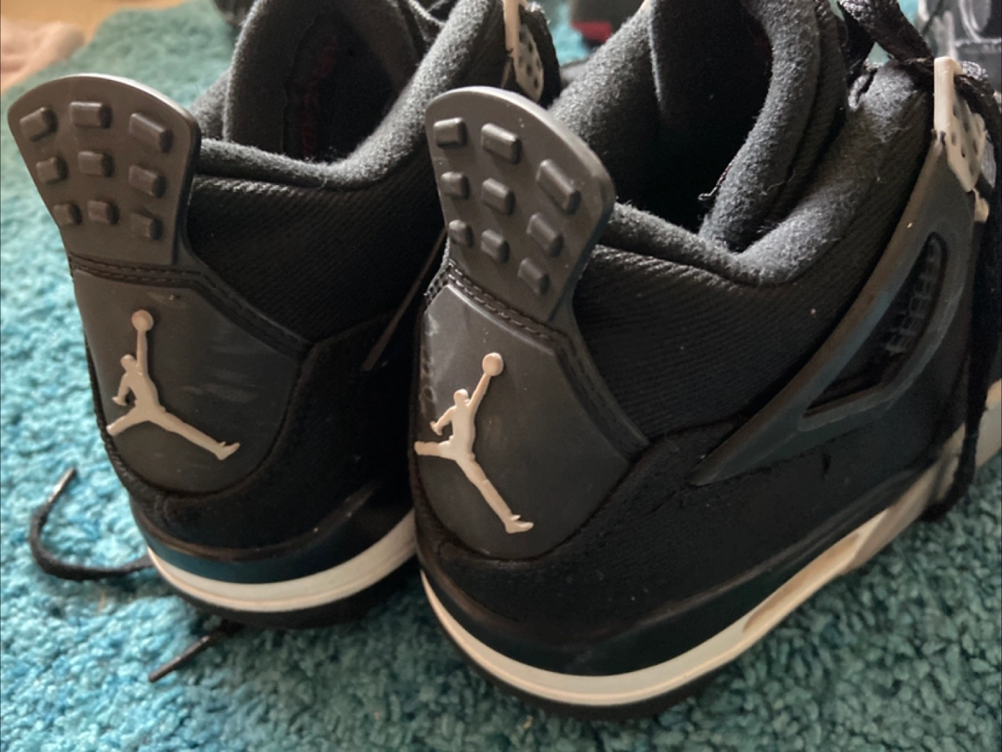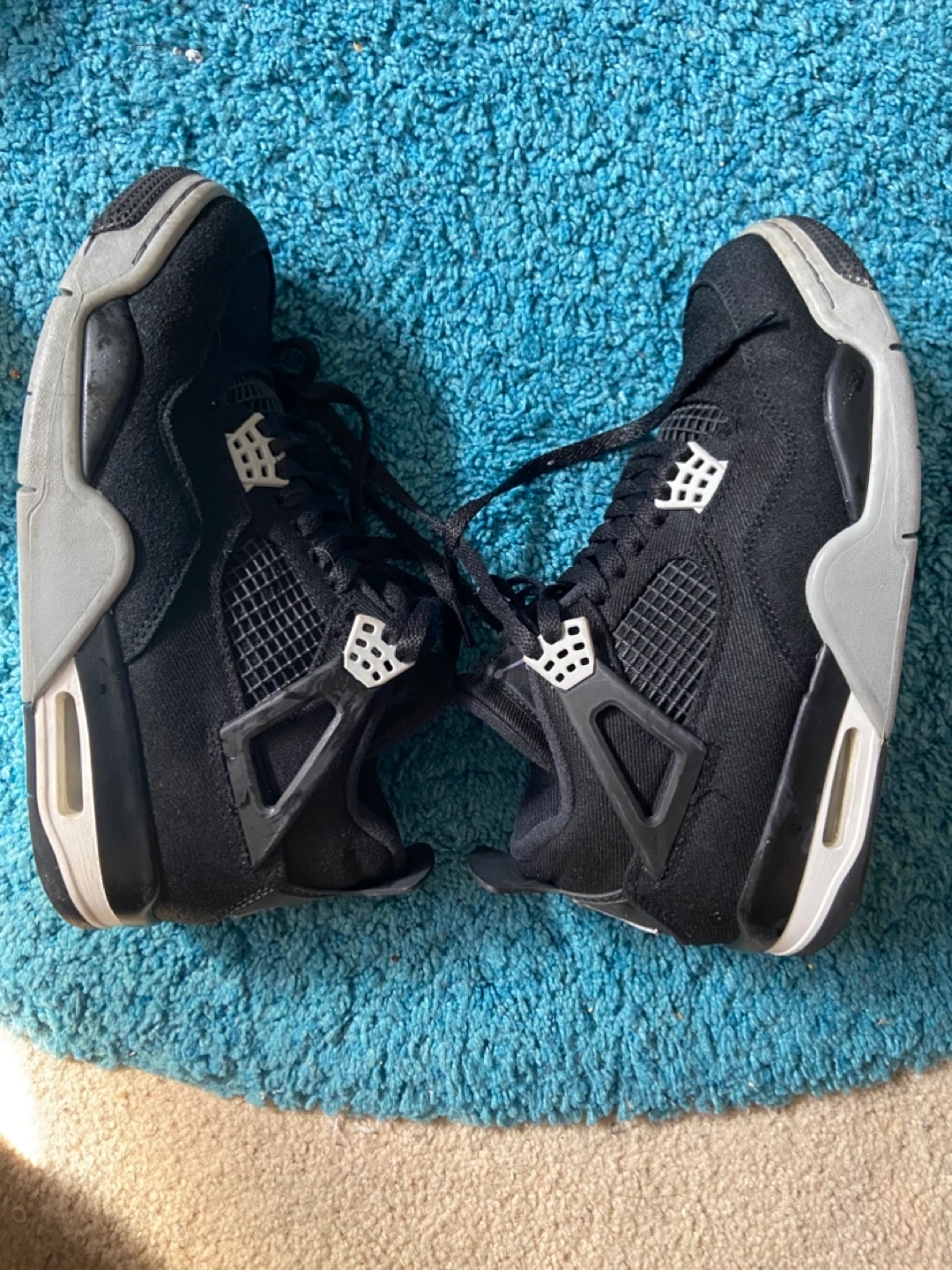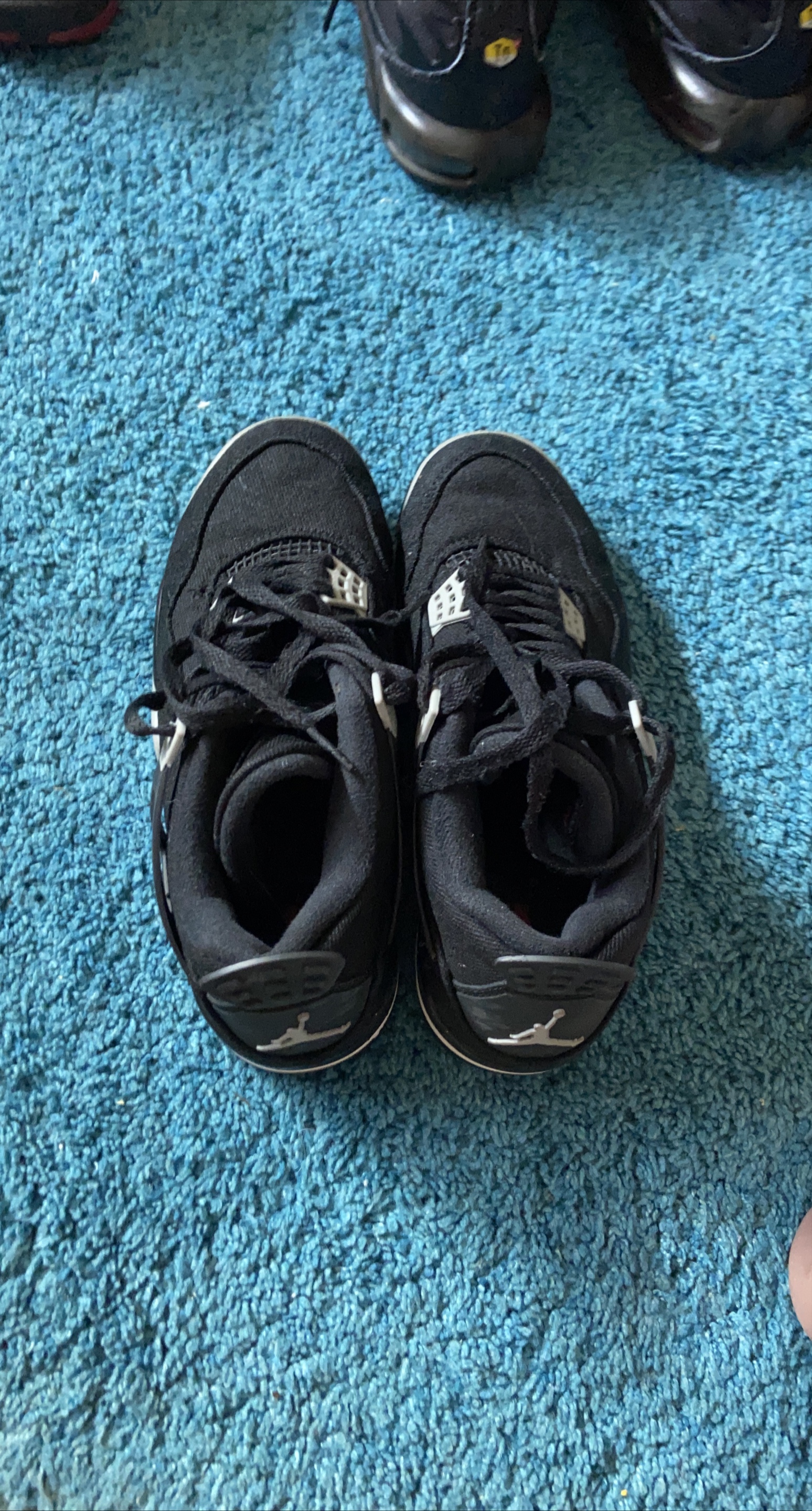 Selling a pair of Jordan 4 Retro Black Cat shoes in youth sizing. They're in good condition, with some signs of wear on the soles. A stylish and classic pair of kicks!