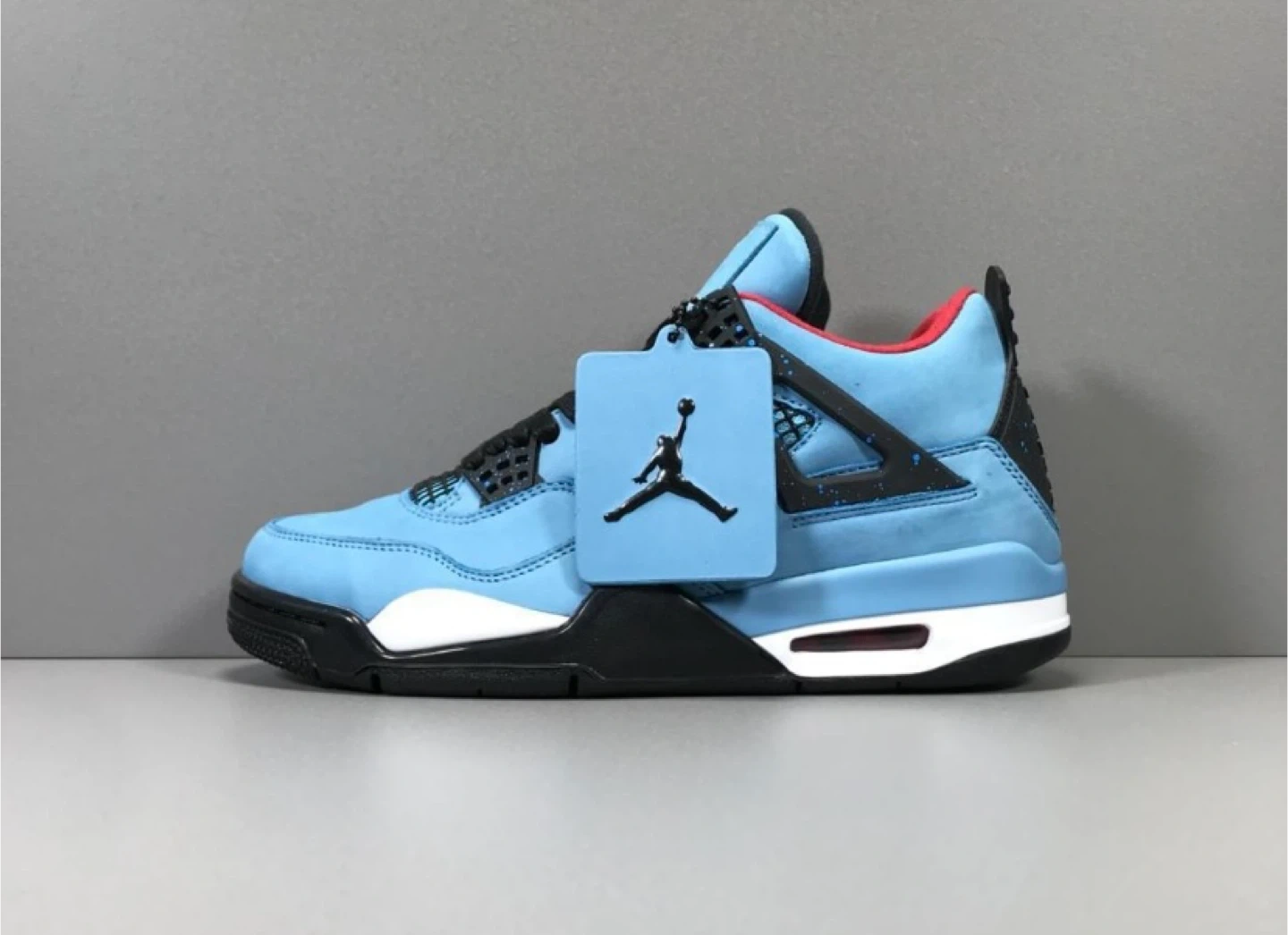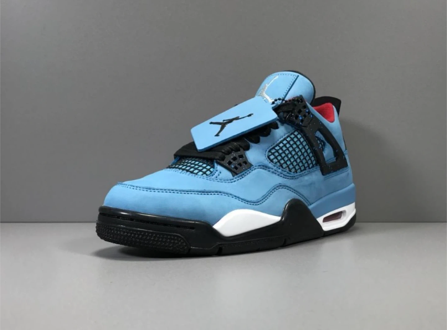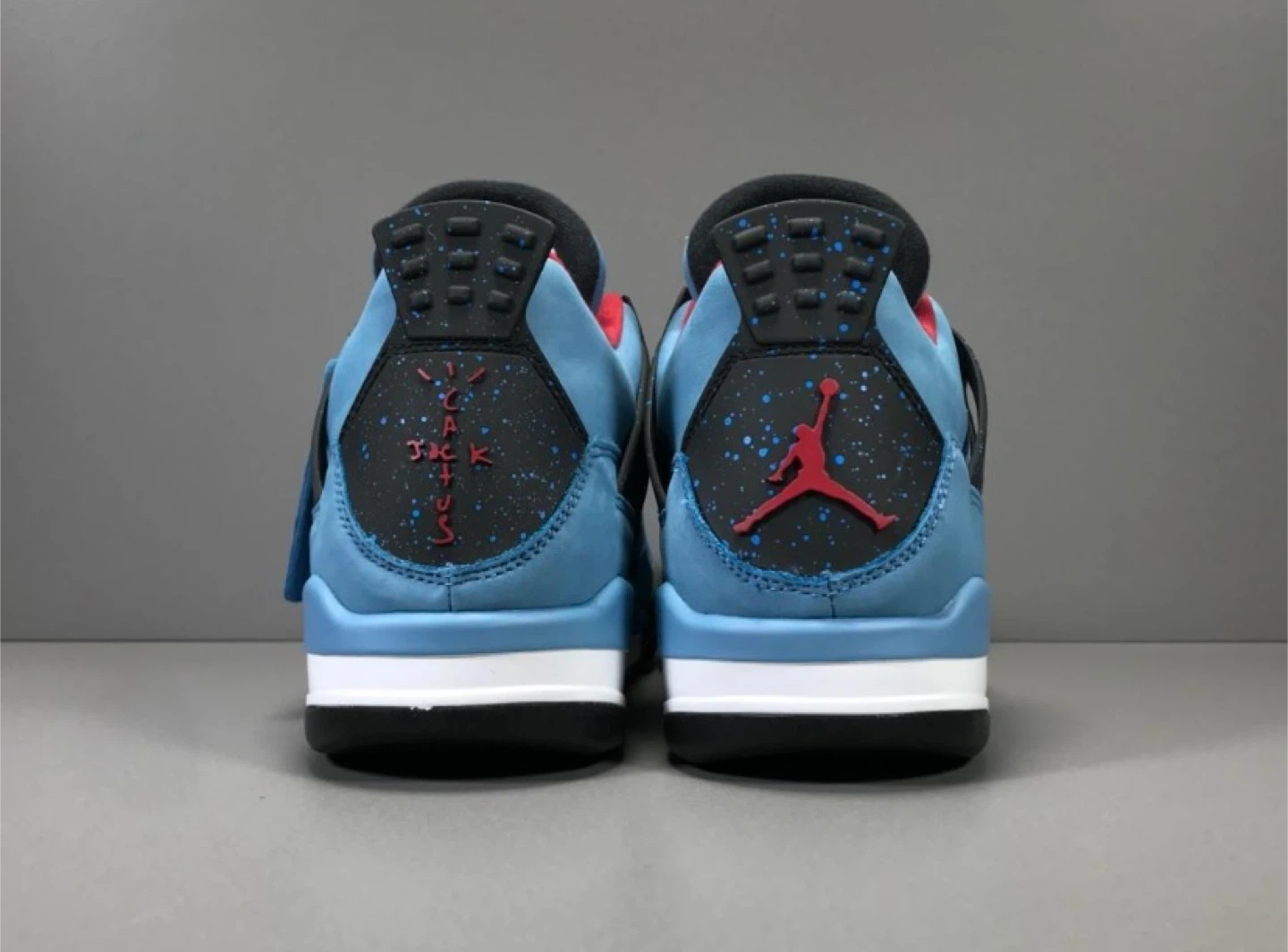 Selling a pair of Jordan 4 Retro Travis Scott Cactus Jack sneakers. These shoes feature a striking light blue upper with black accents and the signature Cactus Jack branding. They are in great condition and ready for a new home!
