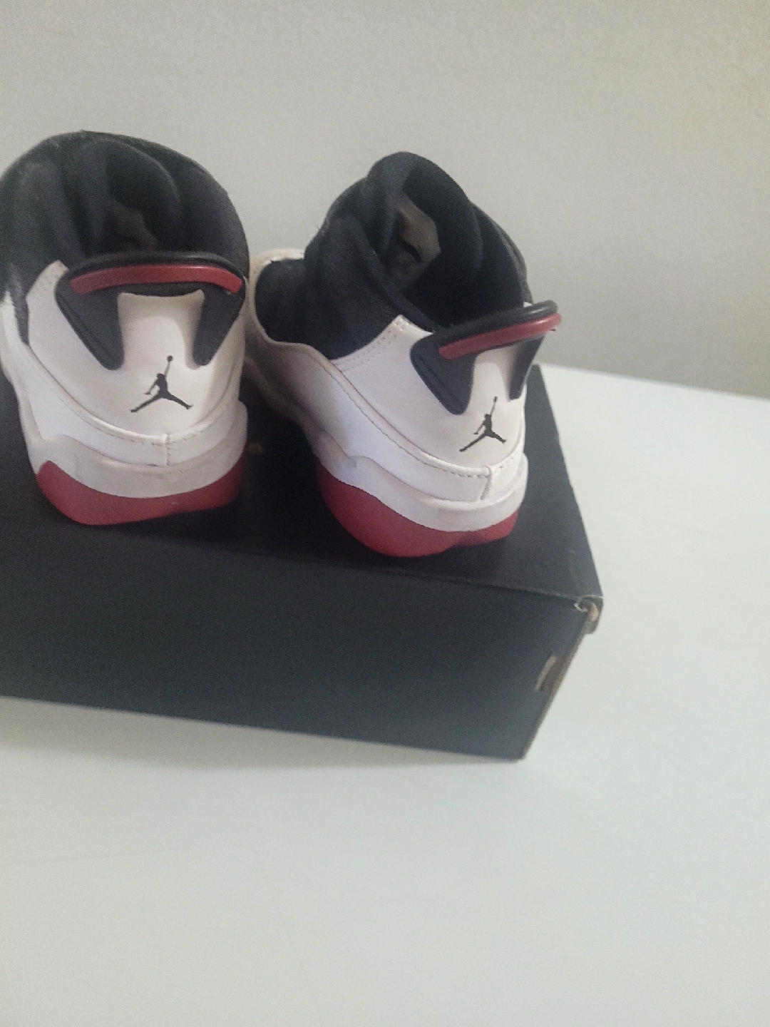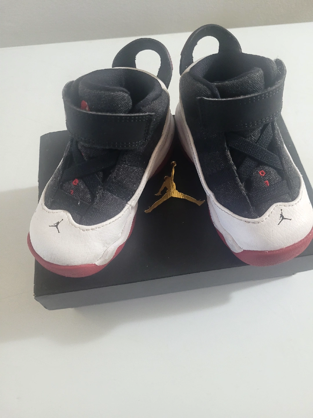 Selling a pair of Jordan 6 Rings toddler shoes in size 6C These are in great condition and come with the original box. They feature a stylish black, white, and red design, perfect for your little one!