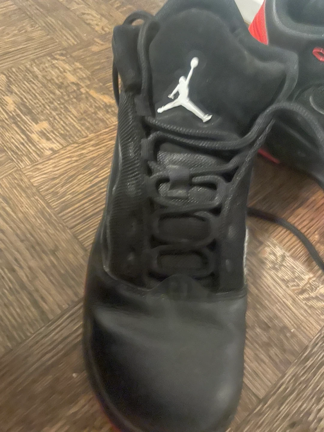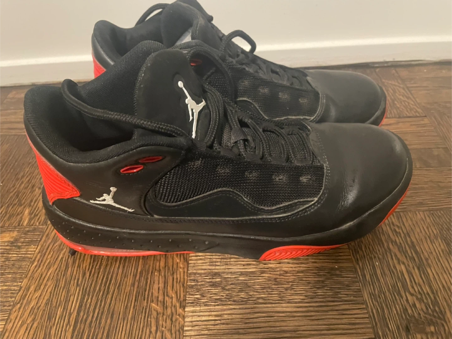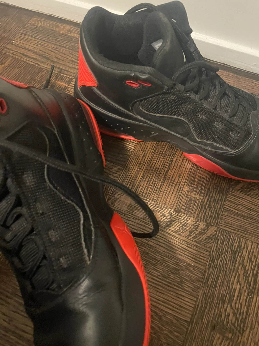 Selling a pair of Jordan shoes in black and red. They're in good condition and ready for the court or casual wear