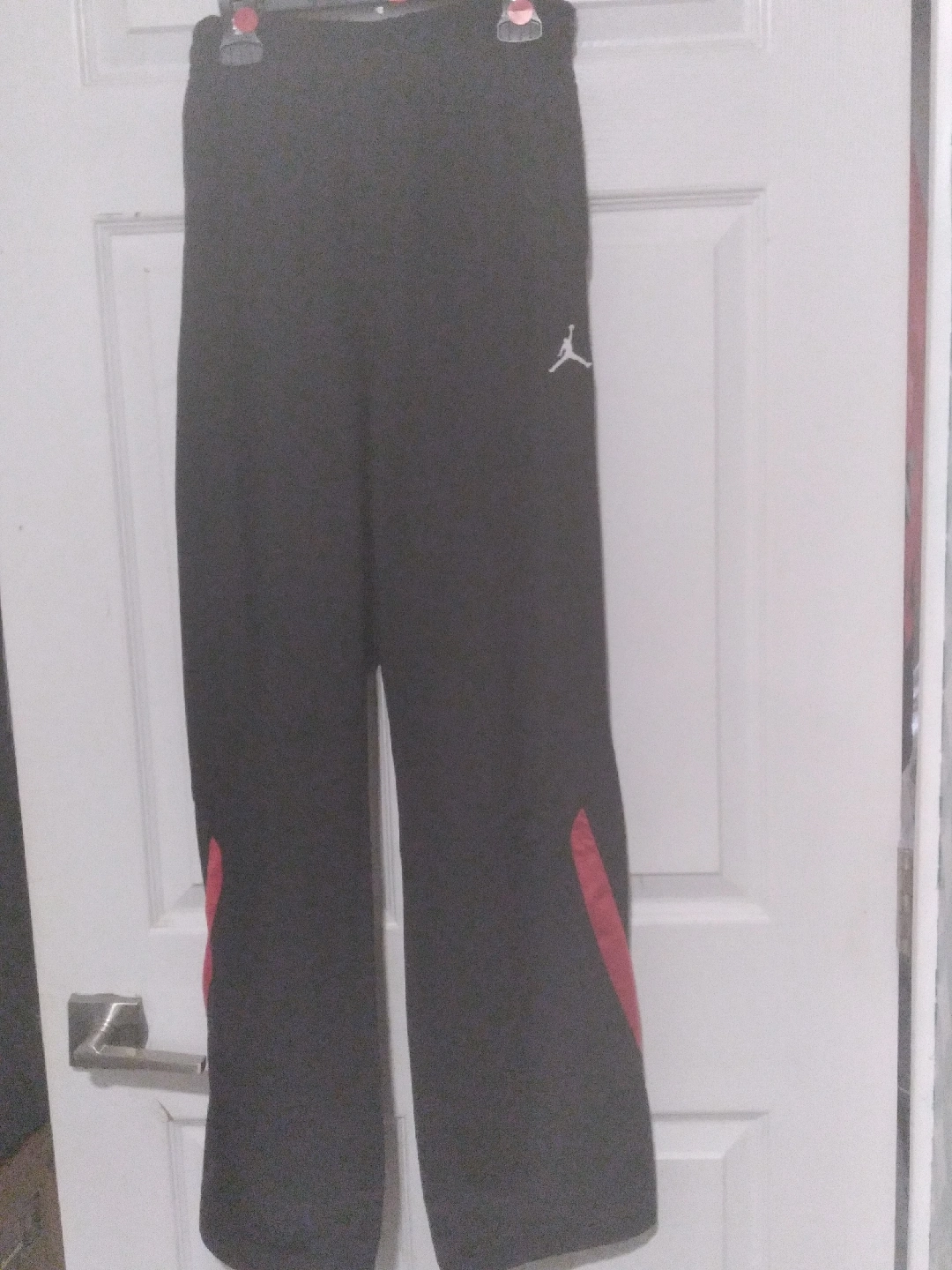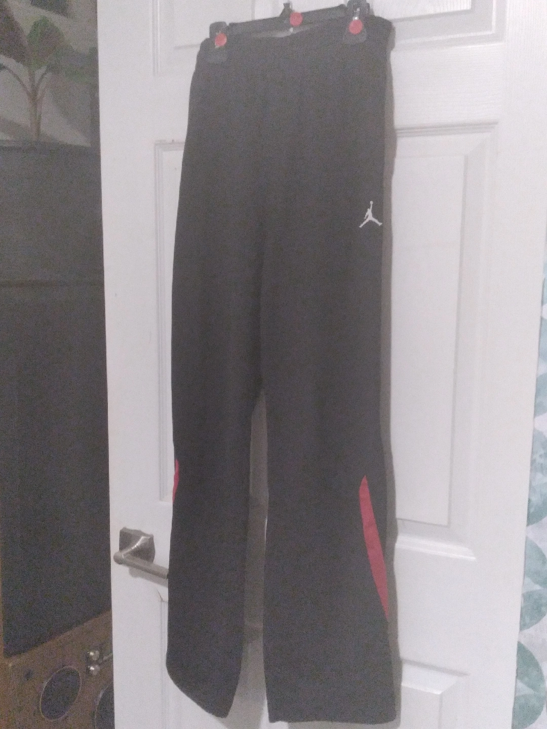Selling a pair of Jordan sweatpants in black with red accents! They're in great shape and ready for a new home. Perfect for lounging or hitting the gym