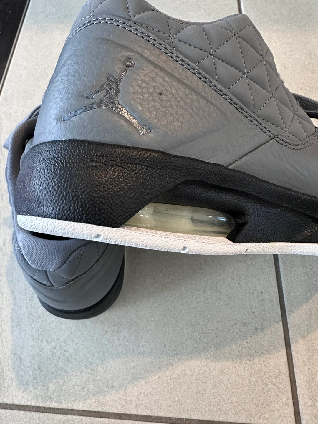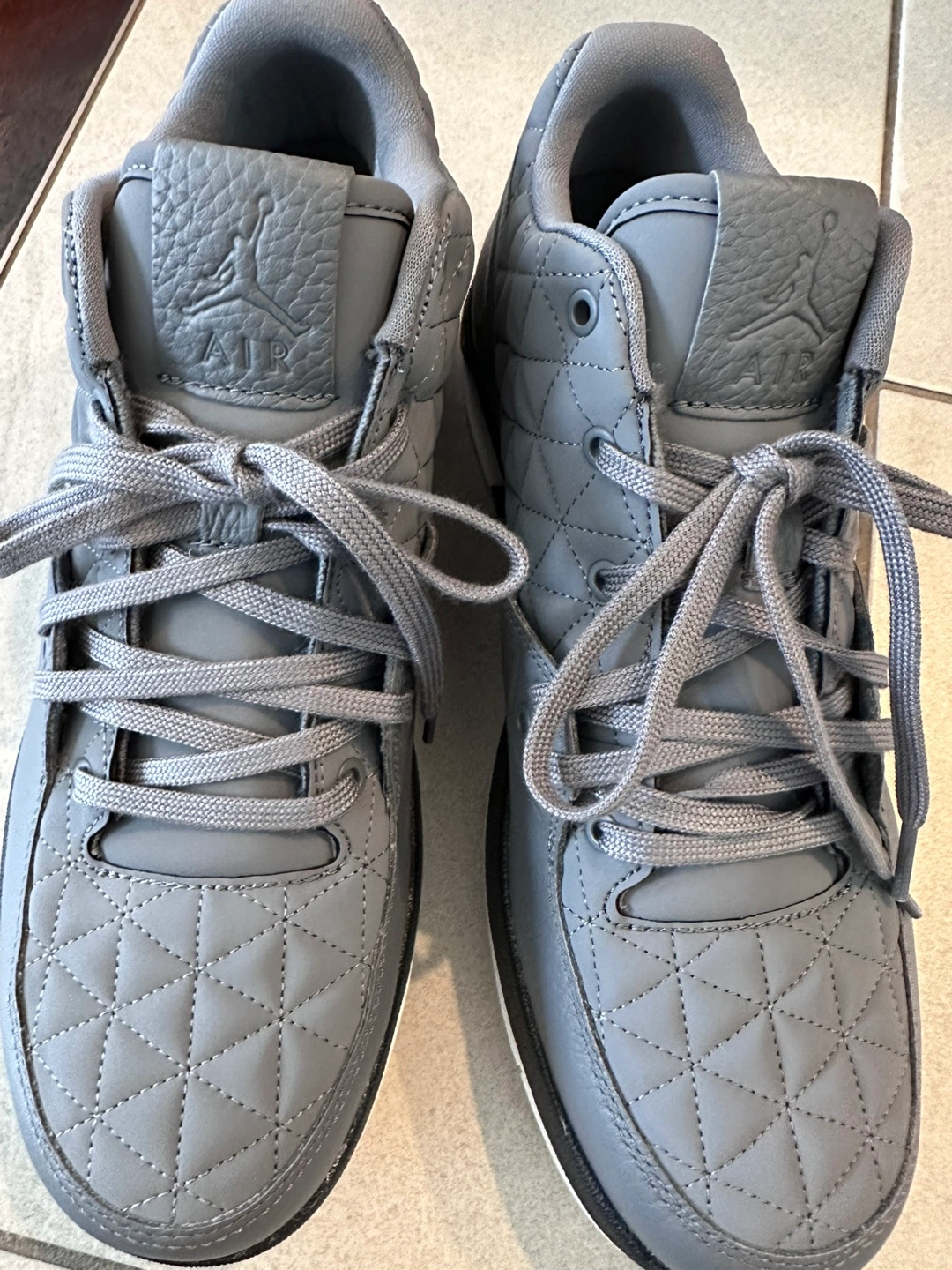 Grey quilted leather Jordan sneakers. Men's size 8.5. Low-top style. Air cushioning visible on the sole. New never worne