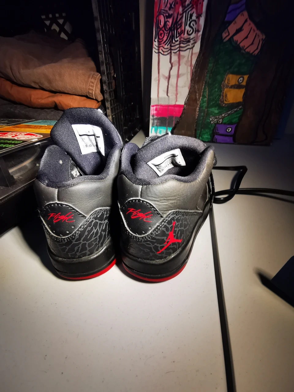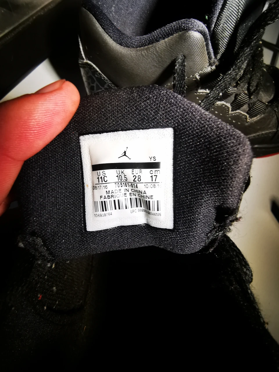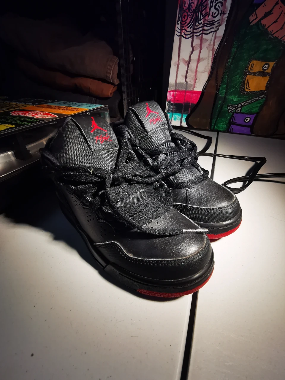 Selling a pair of Jordan Flight 45 High shoes in size 11C. They're black with red accents and in good condition. Perfect for your little one!