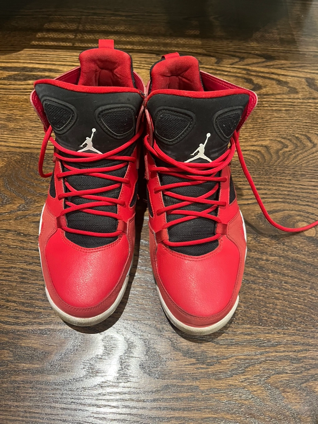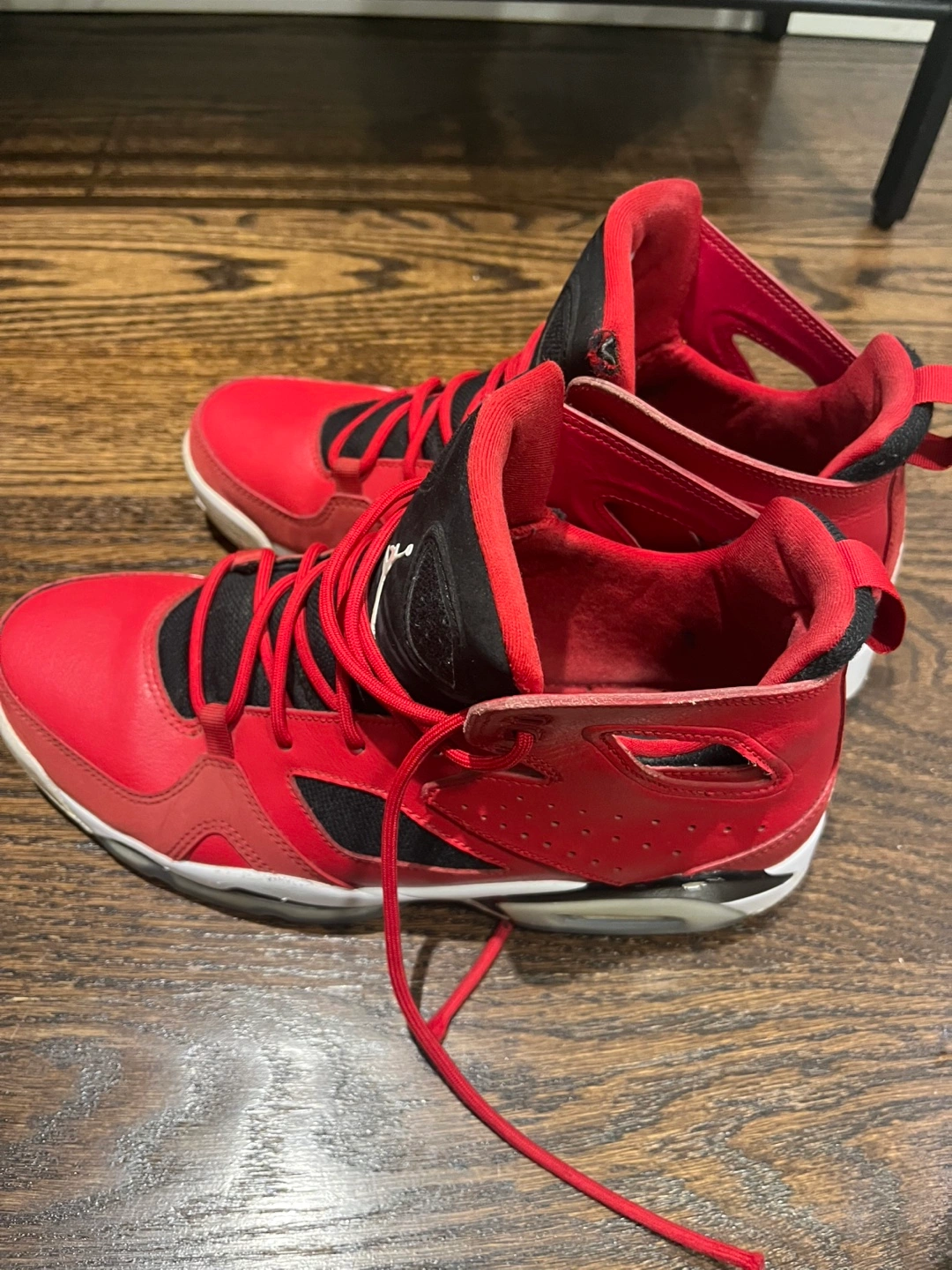 Selling a pair of Jordan Flight Origin 4 shoes in red and black. They are in good used condition and are a US size 6. Perfect for basketball or casual wear!