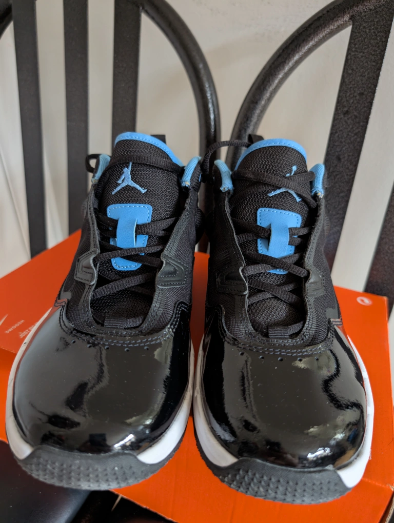 Selling a pair of Jordan Flight shoes in youth size 5.5Y. They're in great shape and ready for a new home. The shoes feature a sleek black design with light blue accents. Perfect for everyday wear or hitting the court!