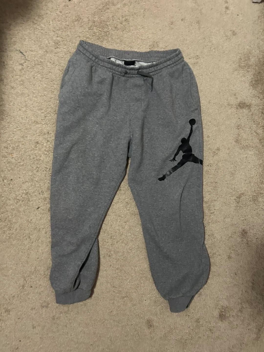 Selling a pair of grey Jordan sweatpants. They feature the iconic Jumpman logo. Perfect for lounging or hitting the court!