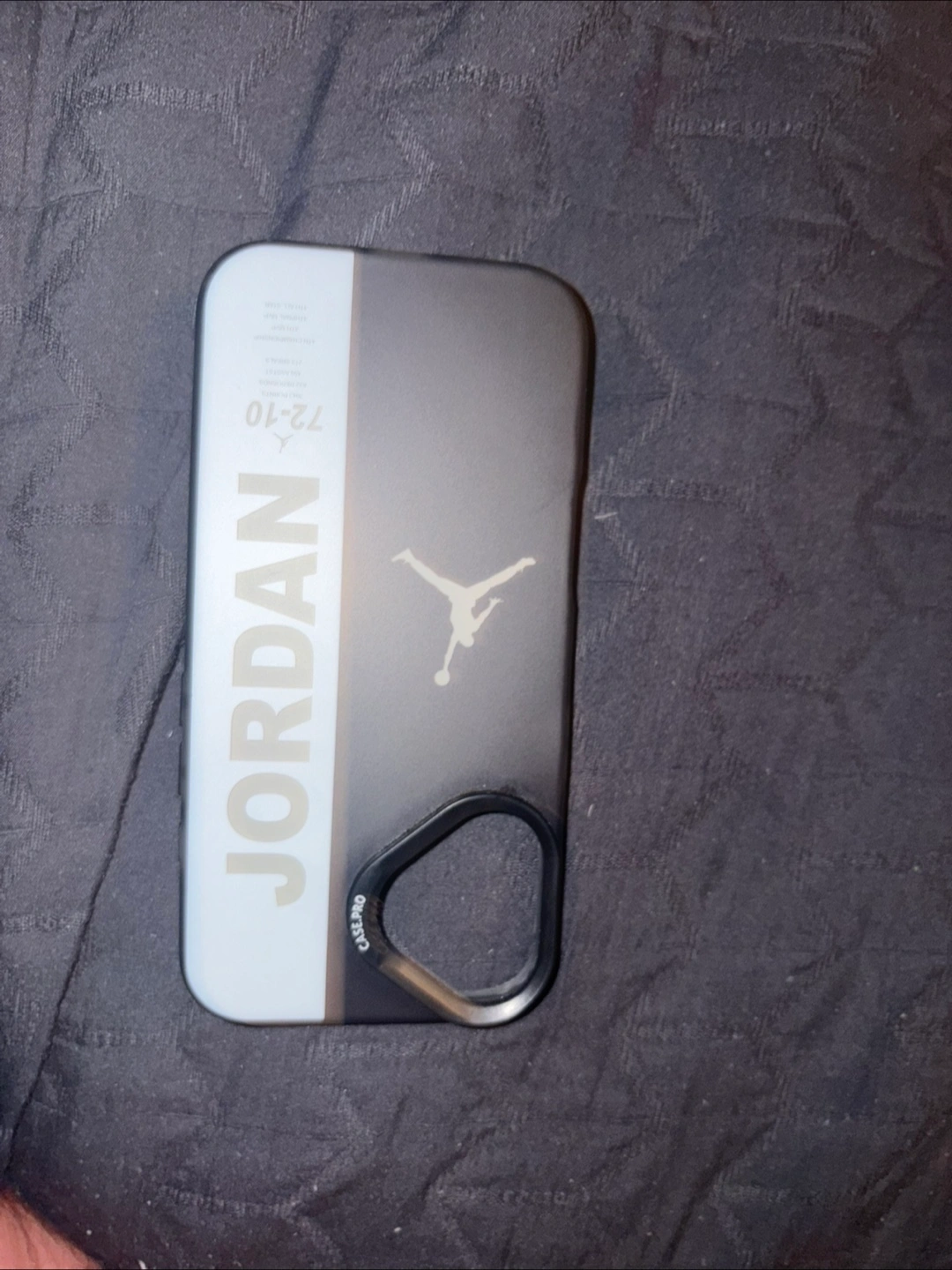 Selling a Jordan iPhone case. It has a black and white design with the Jordan logo on the side. It also has a ring to hold onto the phone.