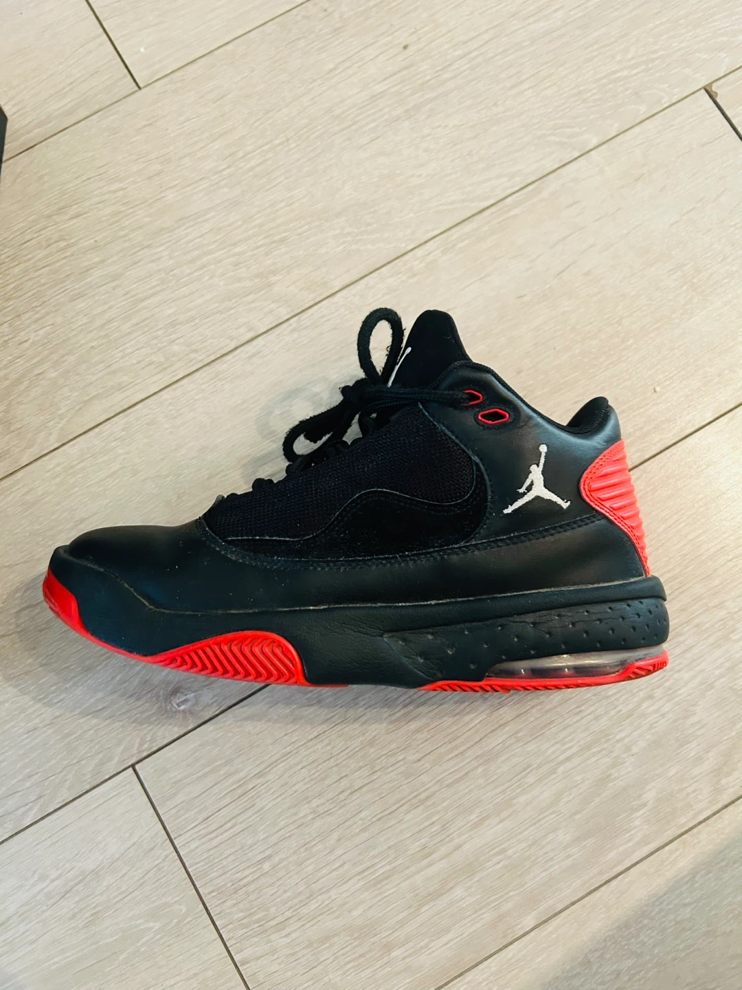 Selling a pair of Jordan Max Aura 5 sneakers in black and red. They are in great condition and come with the original box. The size is 6Y, which is equivalent to a US size 6 for youth. These are stylish and comfortable, perfect for everyday wear!