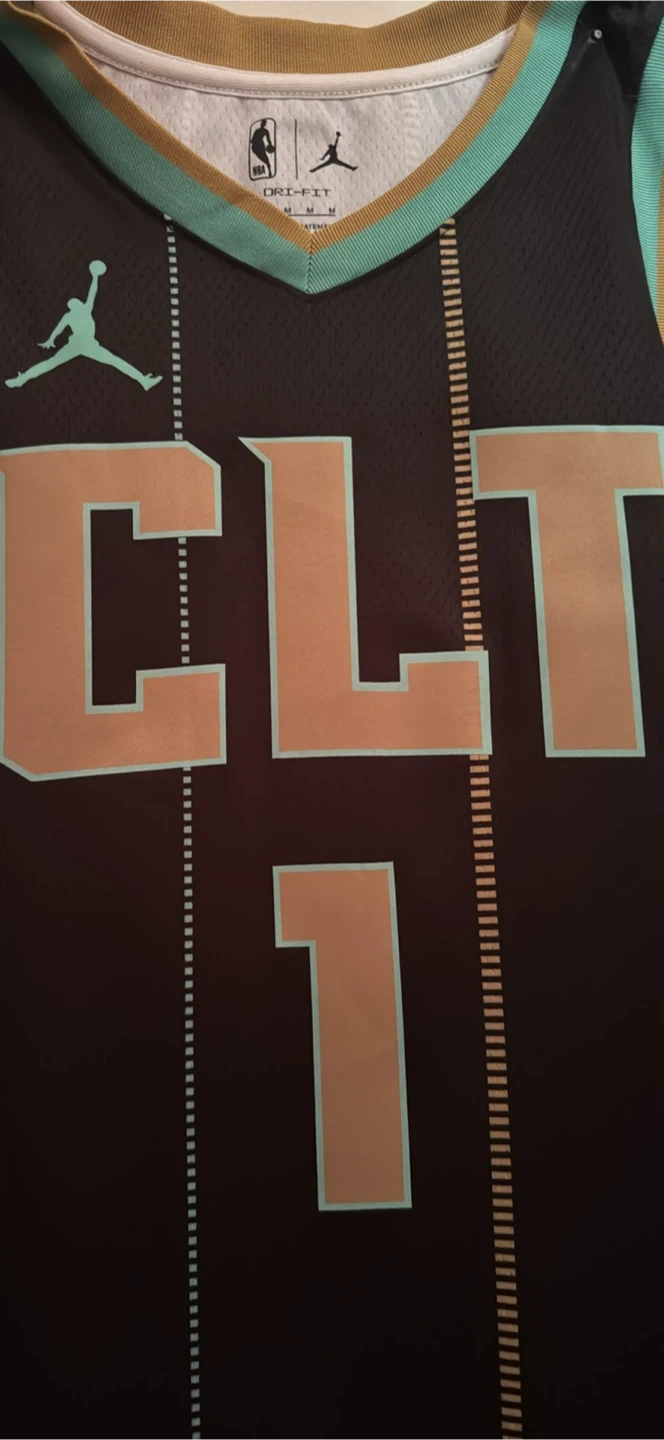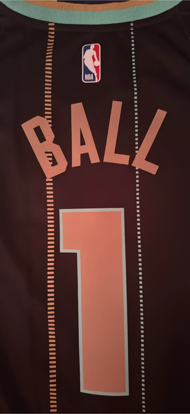 Selling a Jordan NBA Charlotte Hornets jersey, featuring the name BALL and the number 1. It's a size M and in great shape. The jersey is part of the City Edition collection.