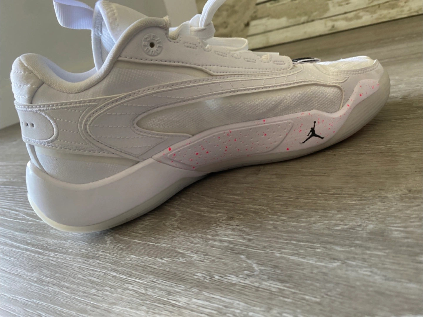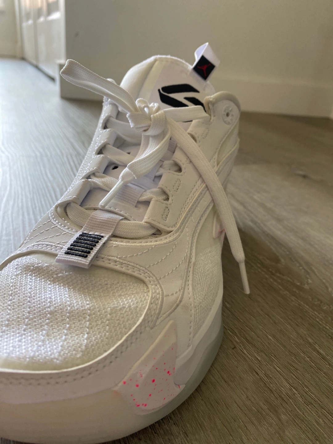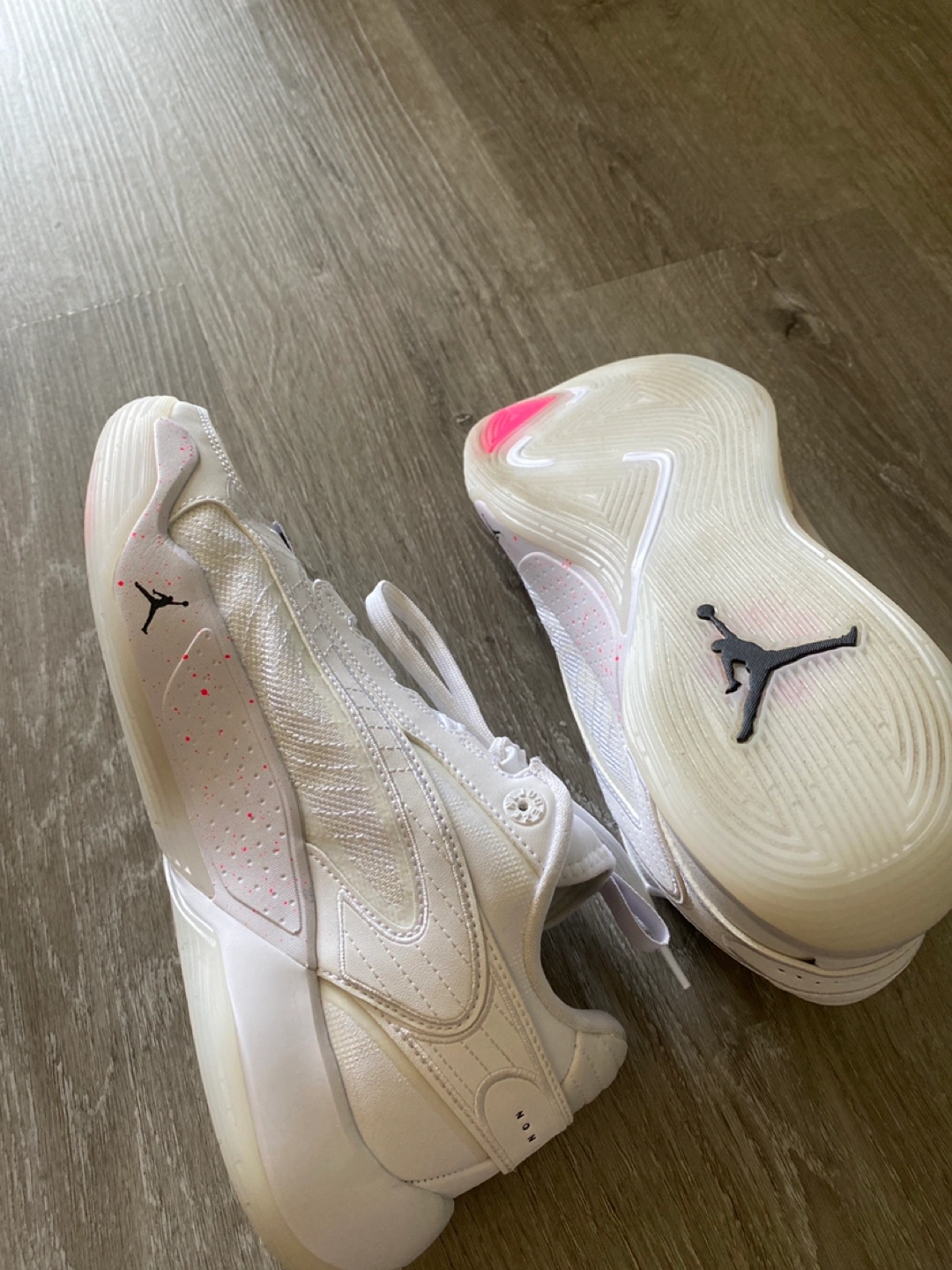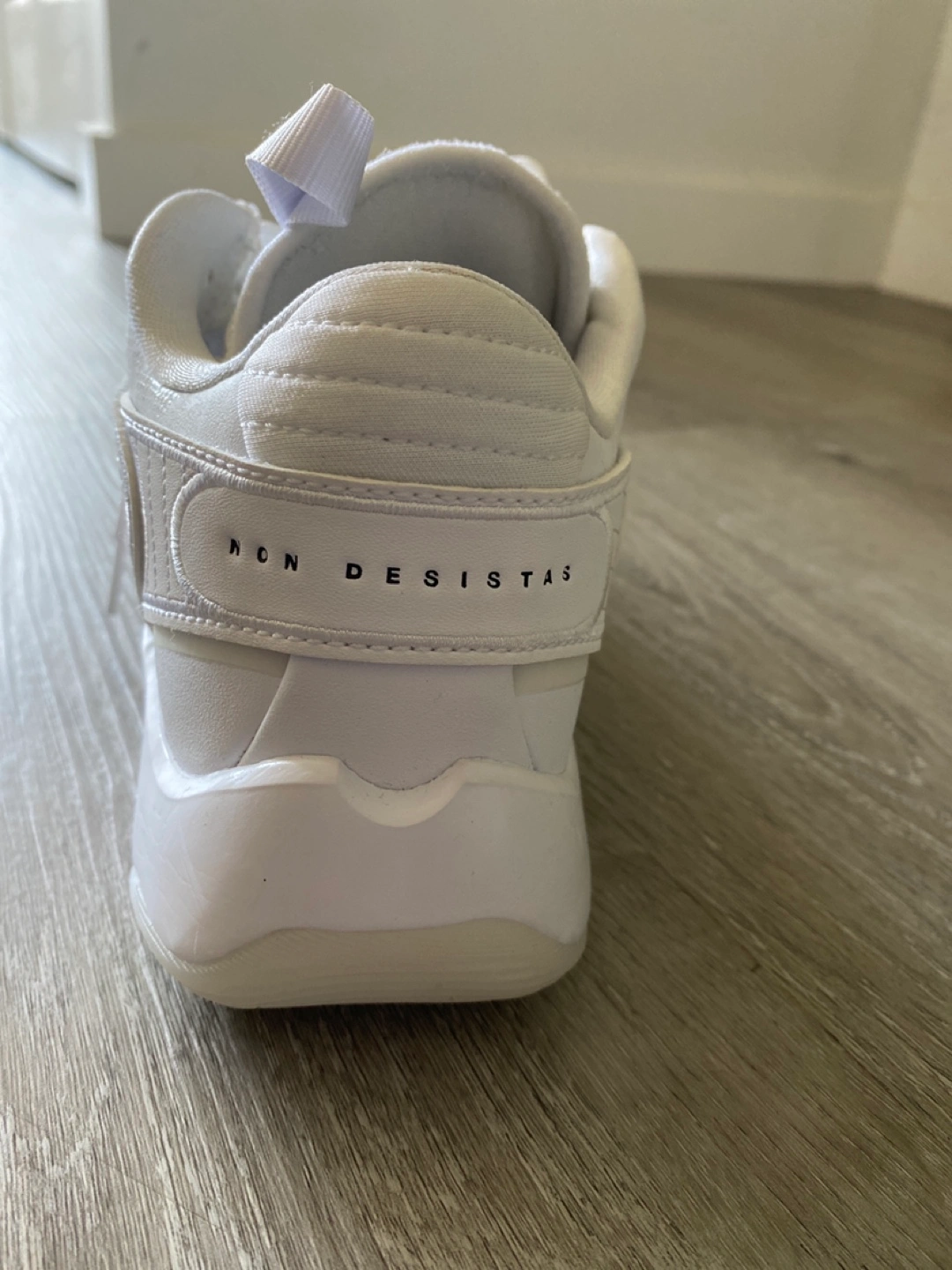 Selling a pair of Jordan Non Desistas sneakers in white. They're in great condition and have a unique design! Size 7