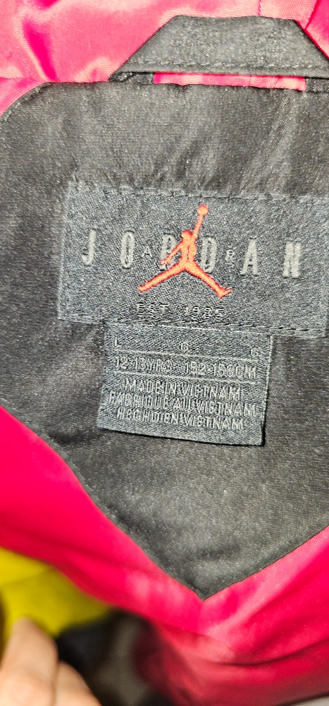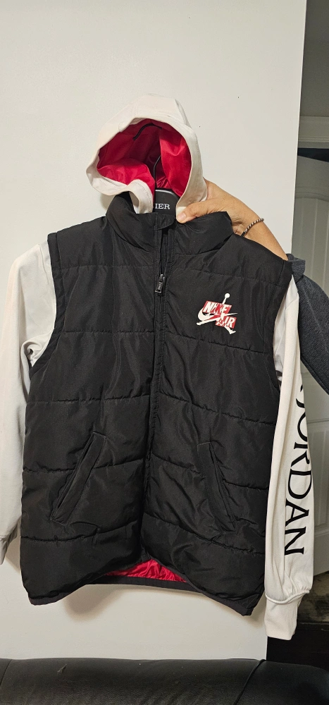 Selling a Jordan puffer vest in great condition! It's a size L, recommended for ages 12-13 years. The vest is black with a red interior and features the classic Nike Air Jordan logo. Perfect for layering!