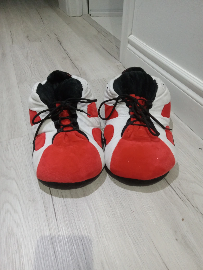 Cozy up with these fun Jordan sneaker slippers! They're in great shape and ready to keep your feet warm.