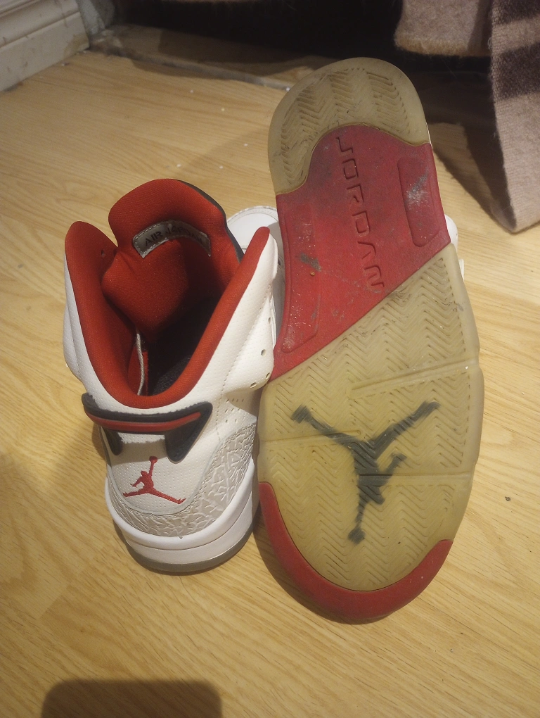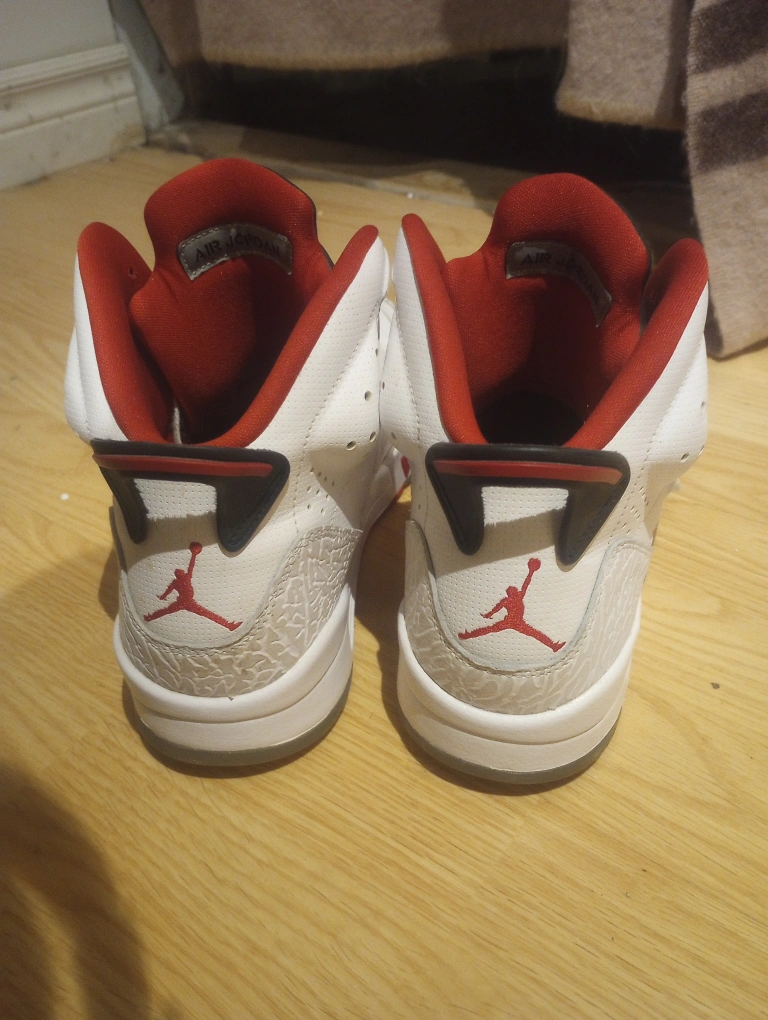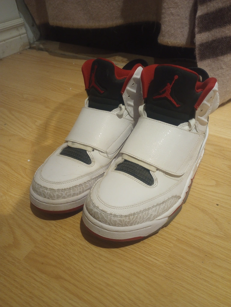 No box. lightly users in good condition. White high-top shoes with red and black accents. Features a midfoot strap and a red tongue. The soles show a Jumpman logo. These shoes would be perfect for a casual walk.