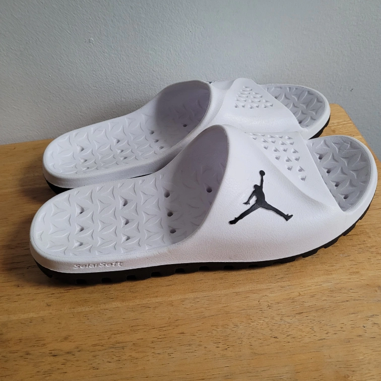 Selling a pair of Jordan slides in great condition! They are white with a black Jumpman logo and a black sole. Size 10.