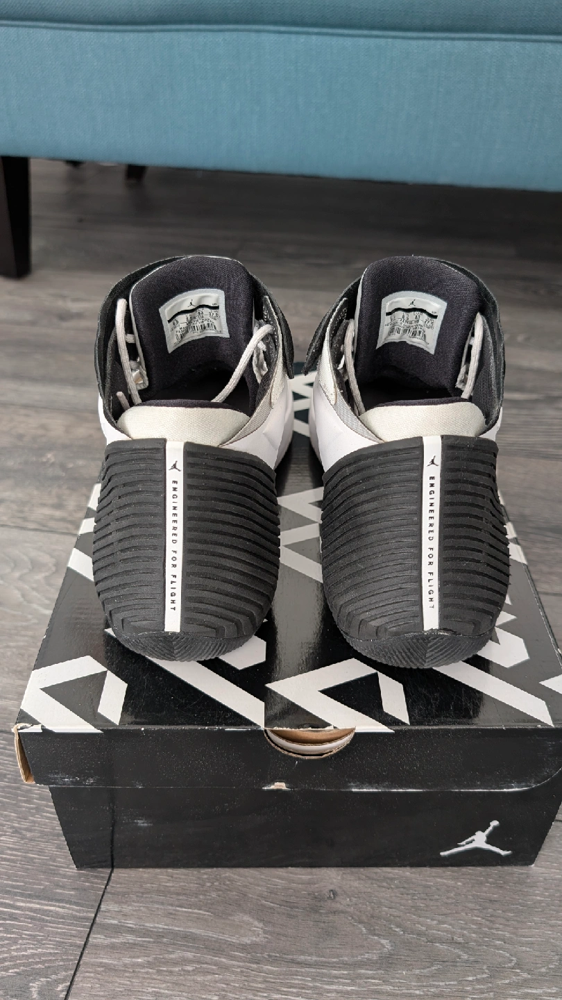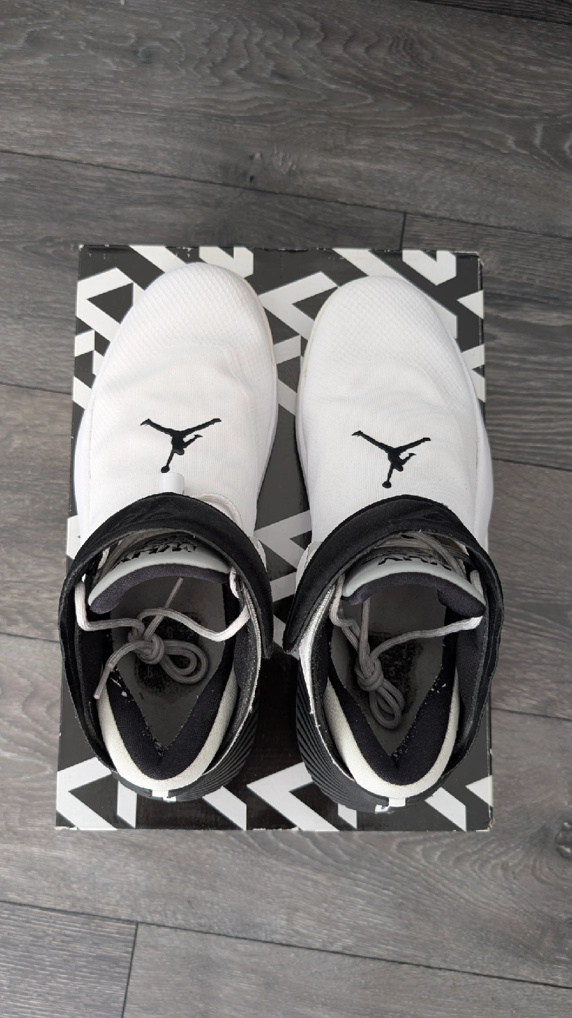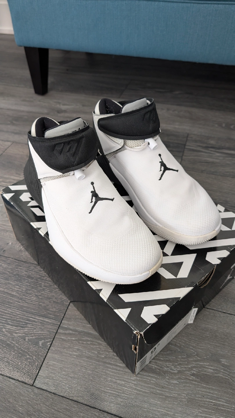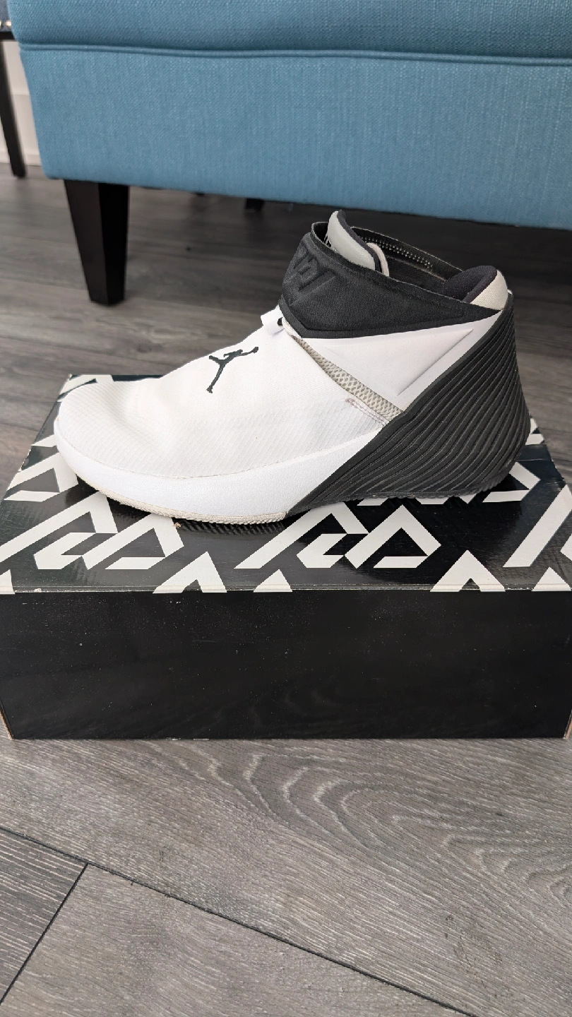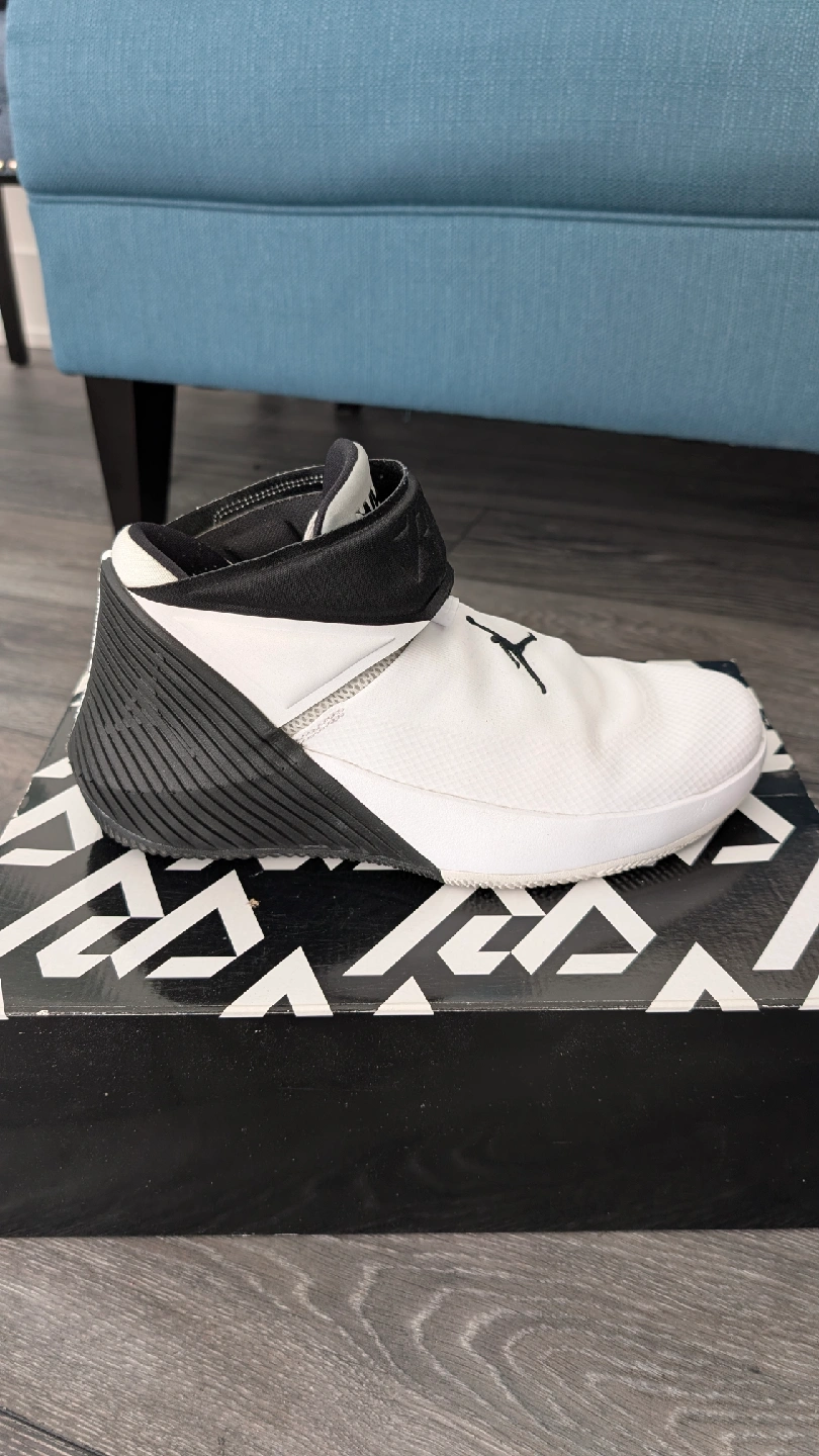 Selling a pair of Jordan Why Not Zero.1 basketball shoes in size 9.5. They are white with black accents and feature the iconic Jordan logo. The shoes come with the original box.