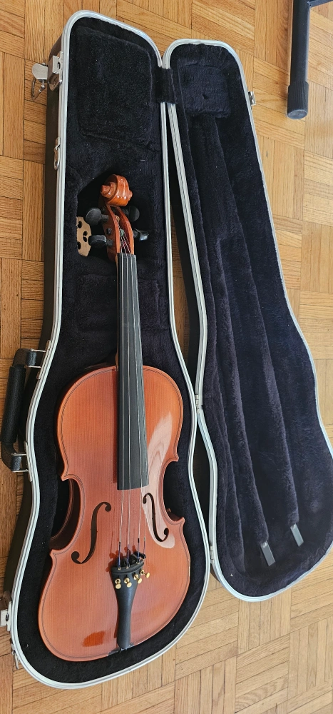Violin and hard case. Hand built in Czech Republic. Retails about $500 new with case. Small cosmetic damage on edge, bridge needs reseating. Fine tuners installed for all strings.