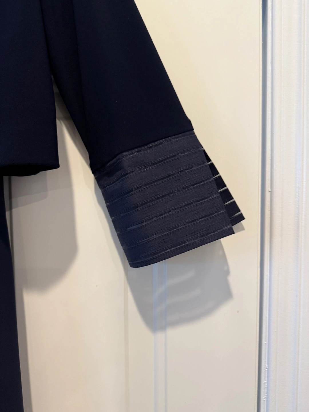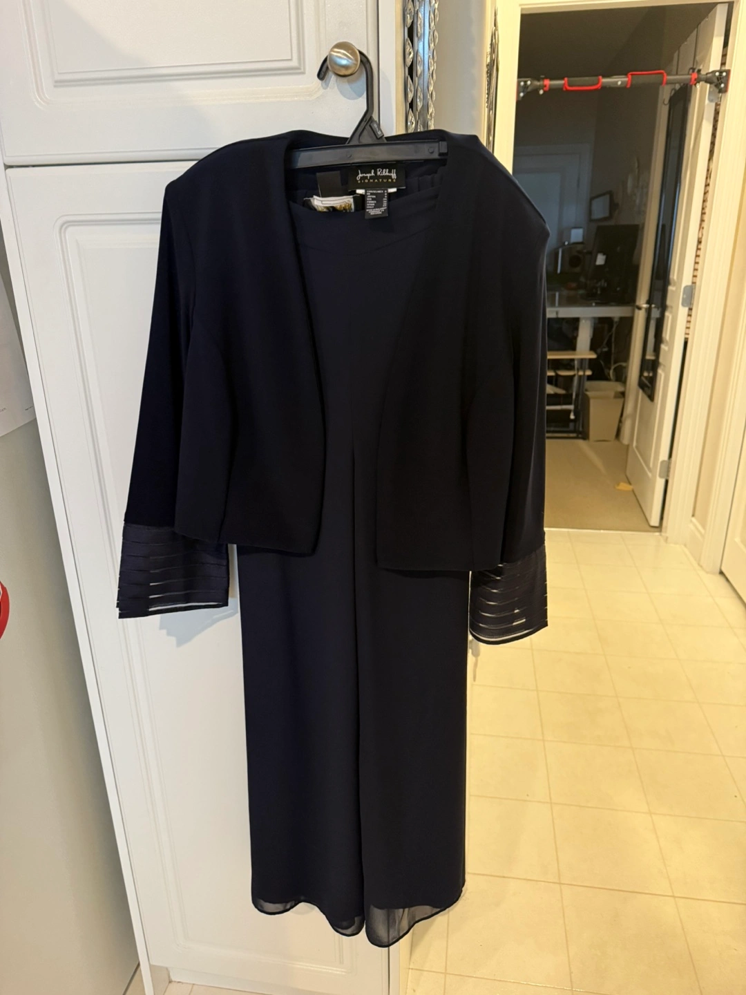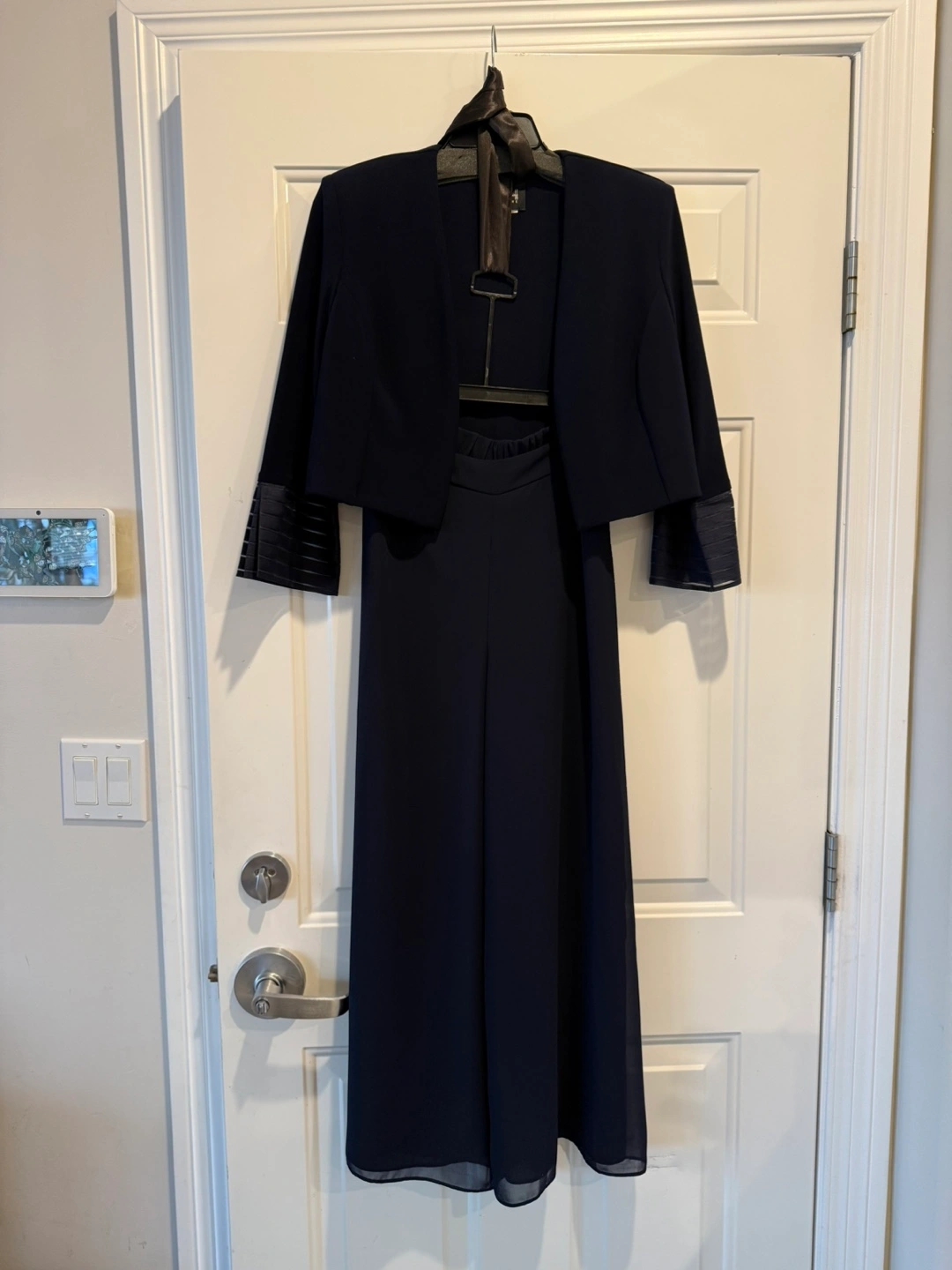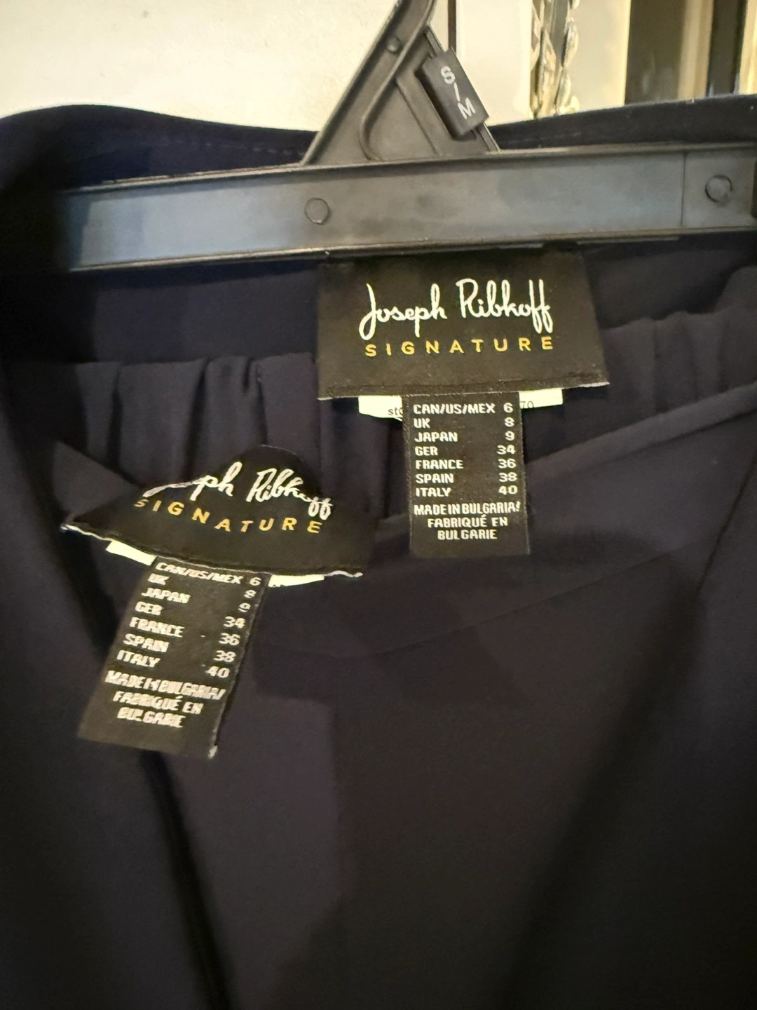 Selling a beautiful Joseph Ribkoff pant suit in navy. It's a size 6 and in great condition. The suit features a jacket and wide-leg pants, perfect for a special occasion or a professional setting. The cuffs have a unique striped design that adds a touch of elegance. Feel free to message me with any questions!