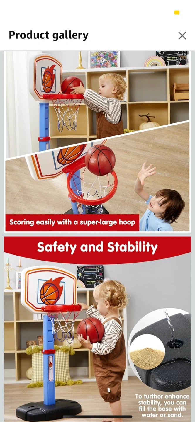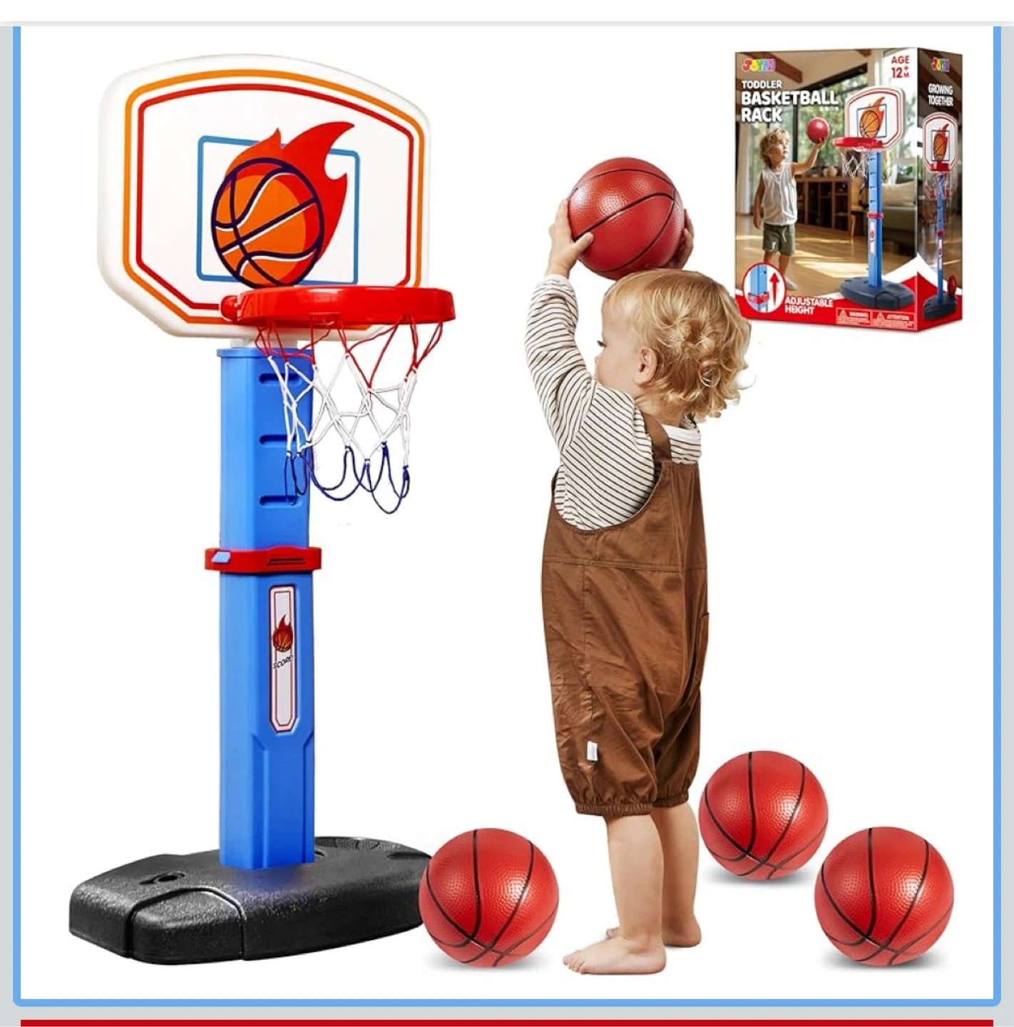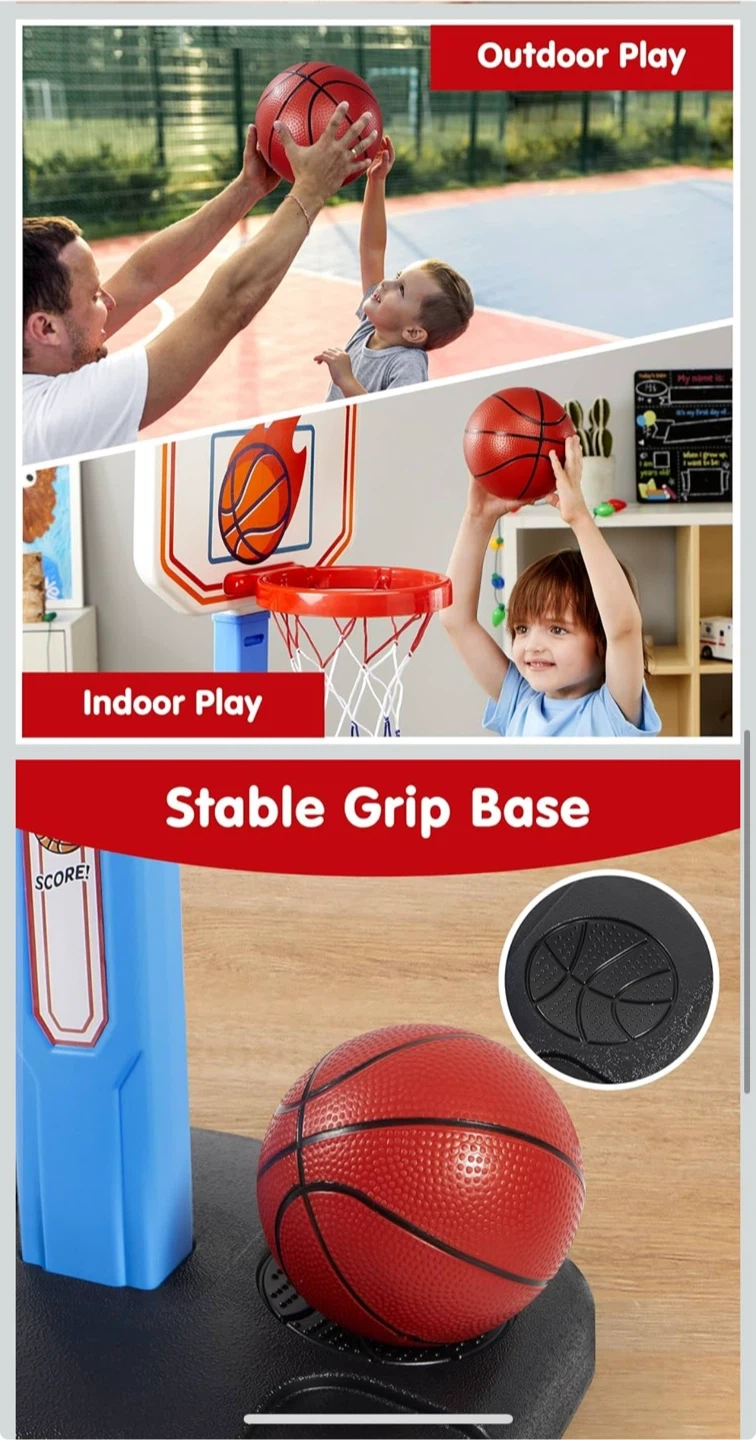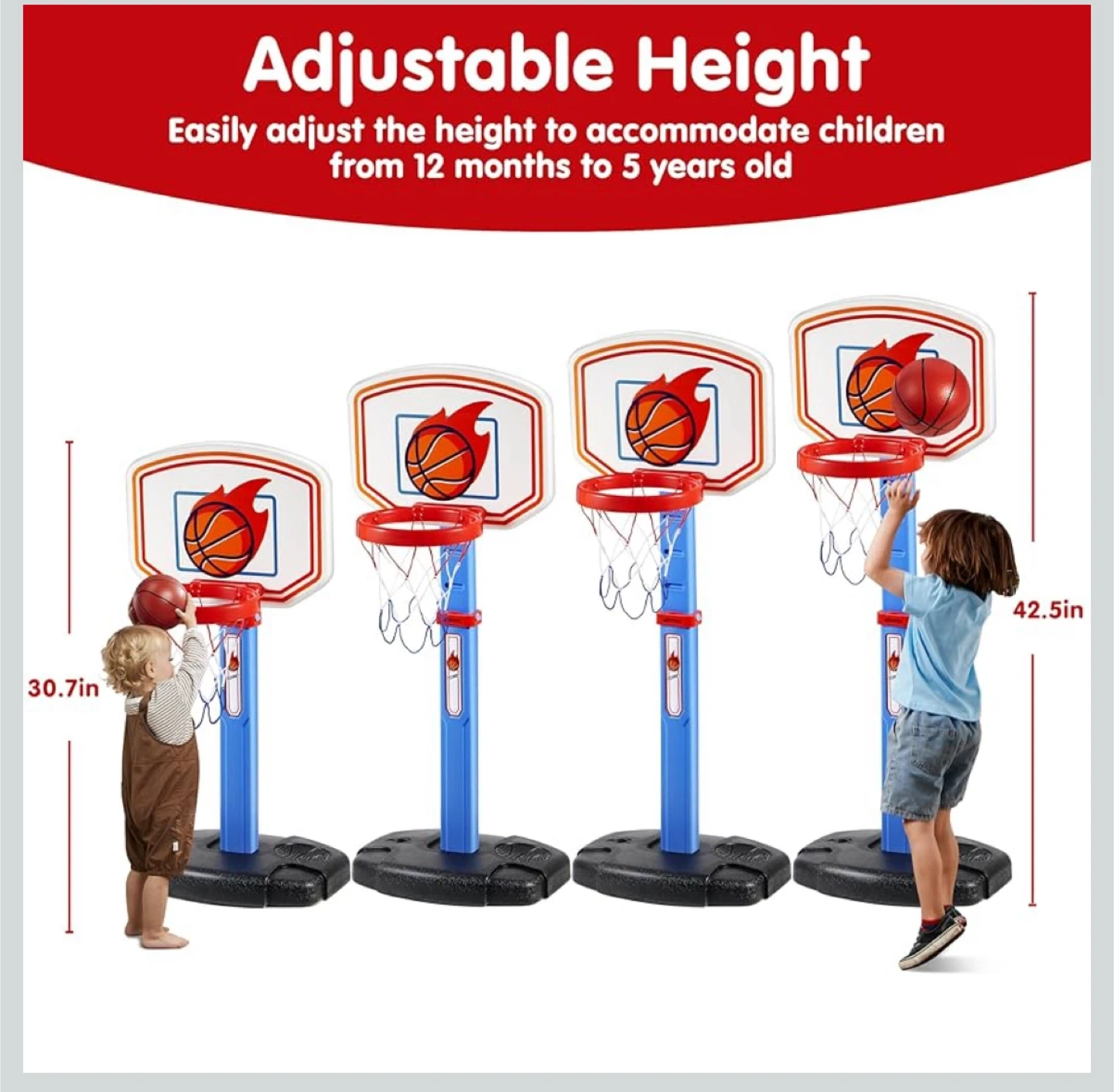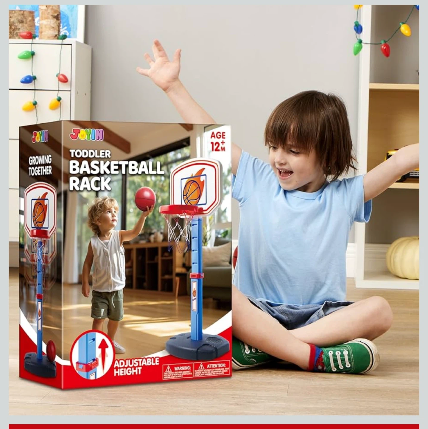 This JOYIN toddler basketball rack is perfect for indoor or outdoor play! The height is adjustable to accommodate children from 12 months to 5 years old. It's designed with safety and stability in mind, and the base can be filled with water or sand for extra stability. Get ready for some fun and active play!